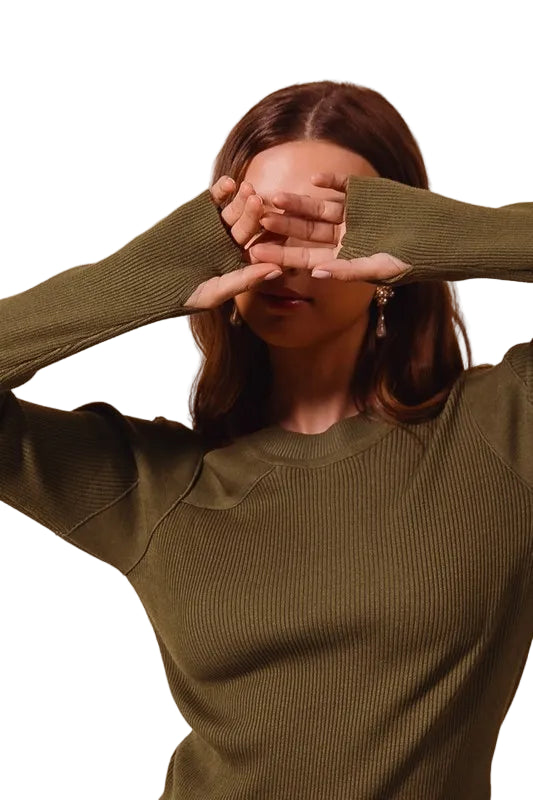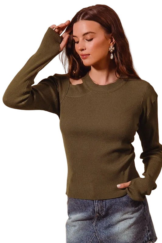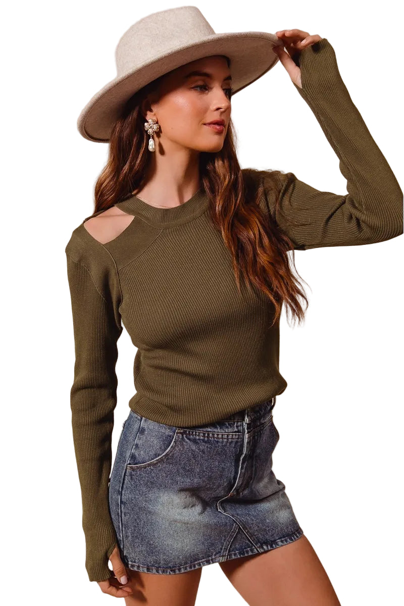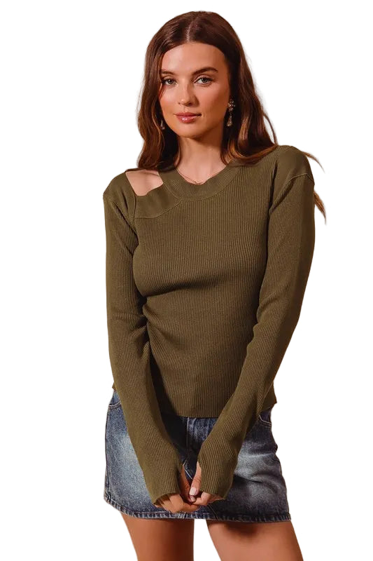 Embrace the allure of romance with the SO ME Rib Knit Top, a captivating olive green pullover that whispers elegance. Its modern cut-out shoulder design adds a daring twist to the classic ribbed knit, inviting admiration with every glance.