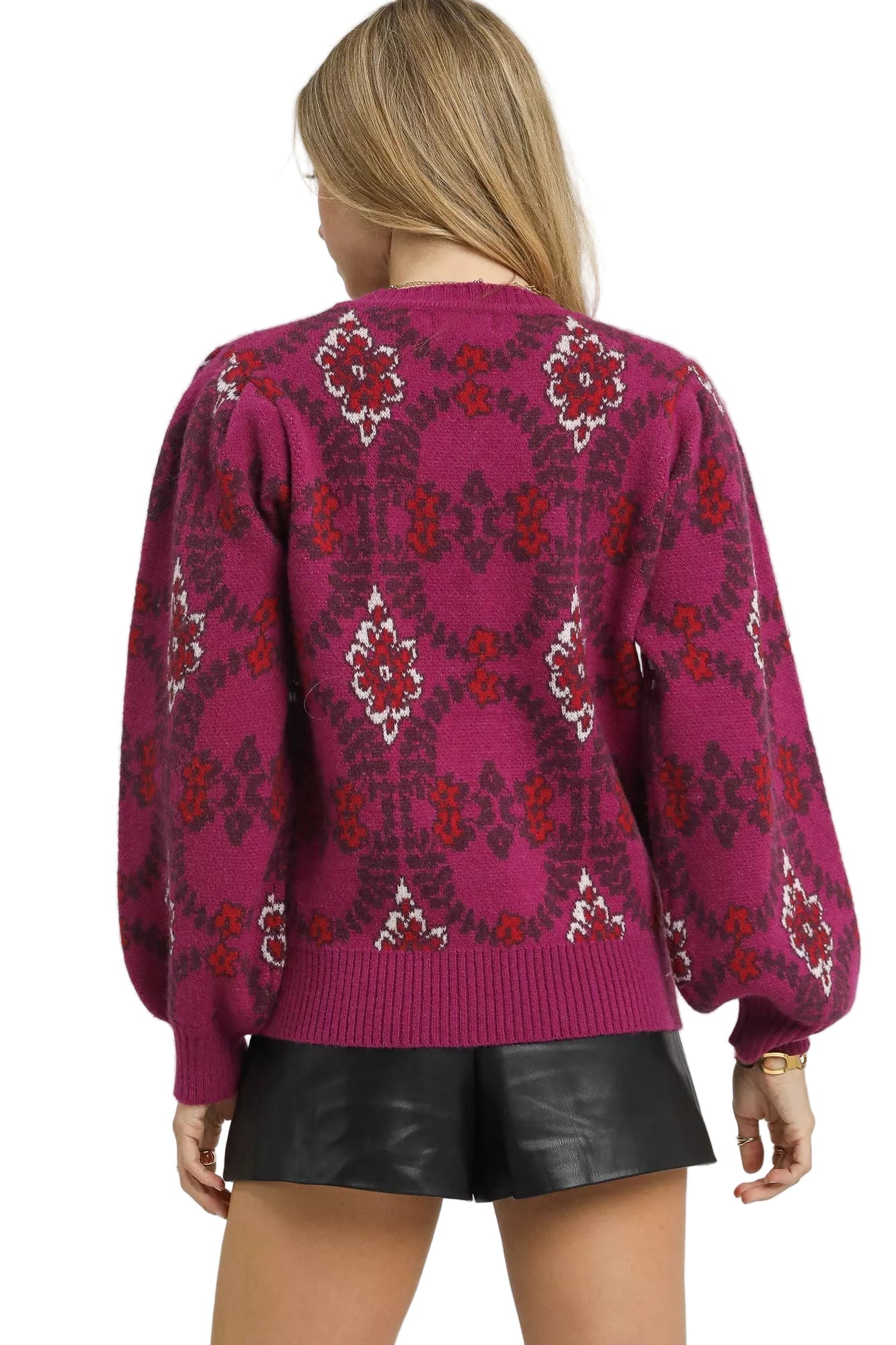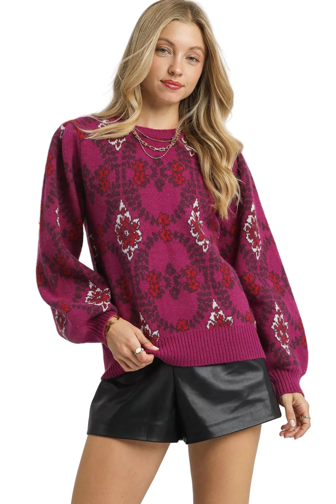 Wrap yourself in the warmth of romance with the Umgee Boho Patterned Long Sleeve Sweater. This enchanting piece, adorned with a unique Jacquard knit design, whispers tales of cozy evenings and soft embraces. The classic crew neck invites timeless elegance, while the long balloon sleeves dance with a trendy flair.