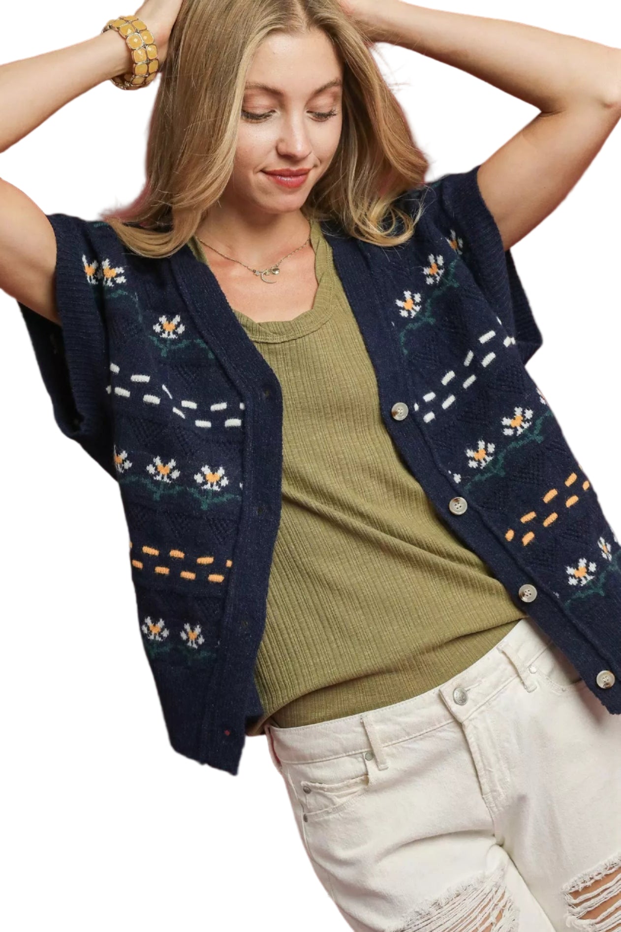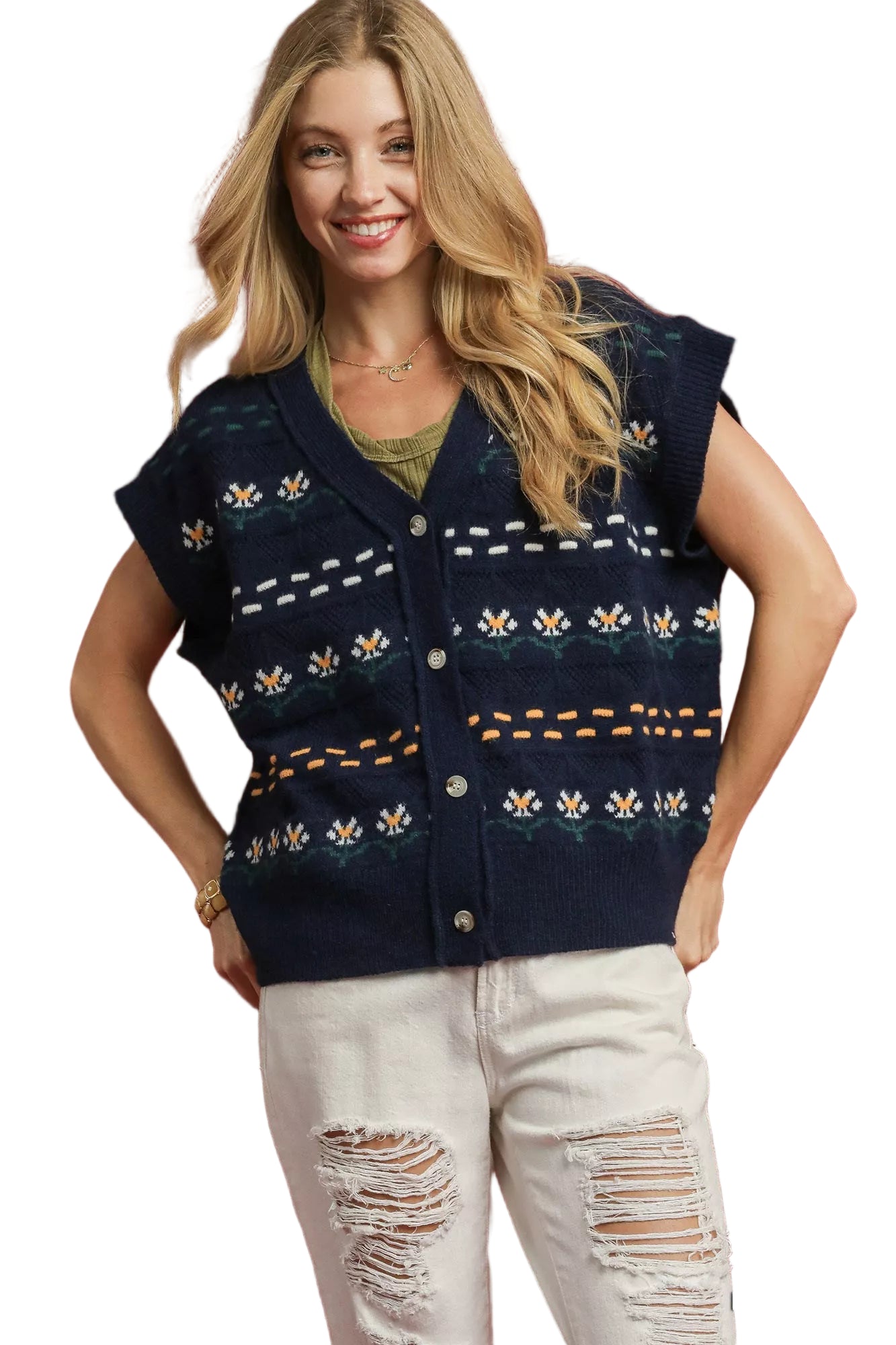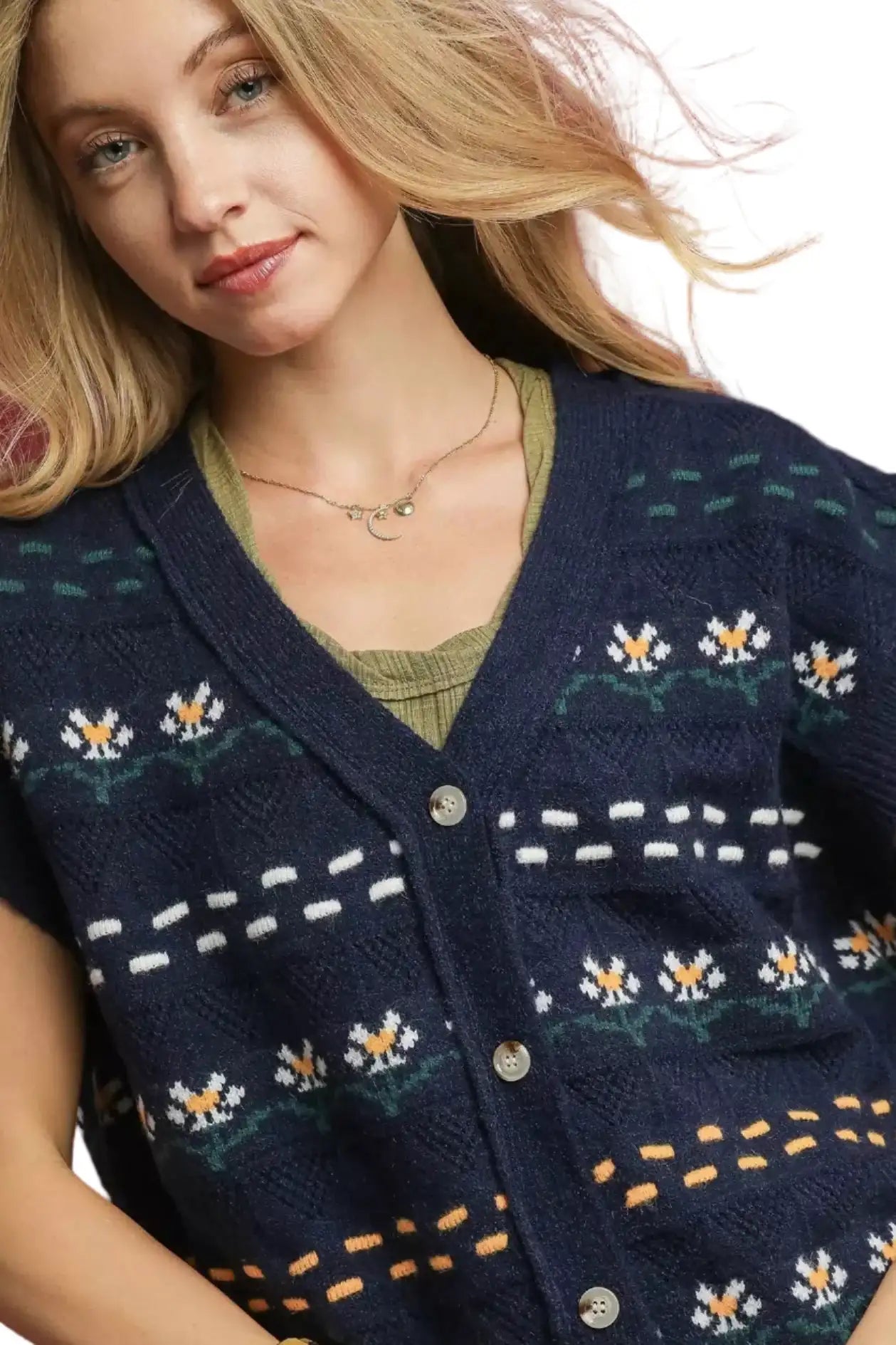 Embrace the essence of romance with the Umgee Button-Down Knit Vest, adorned with enchanting floral patterns that whisper tales of springtime love. Each charming daisy motif dances gracefully across the fabric, inviting warmth and whimsy into your wardrobe.