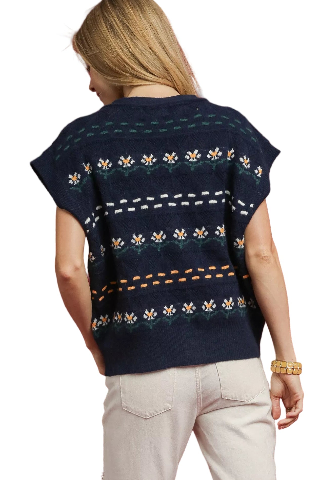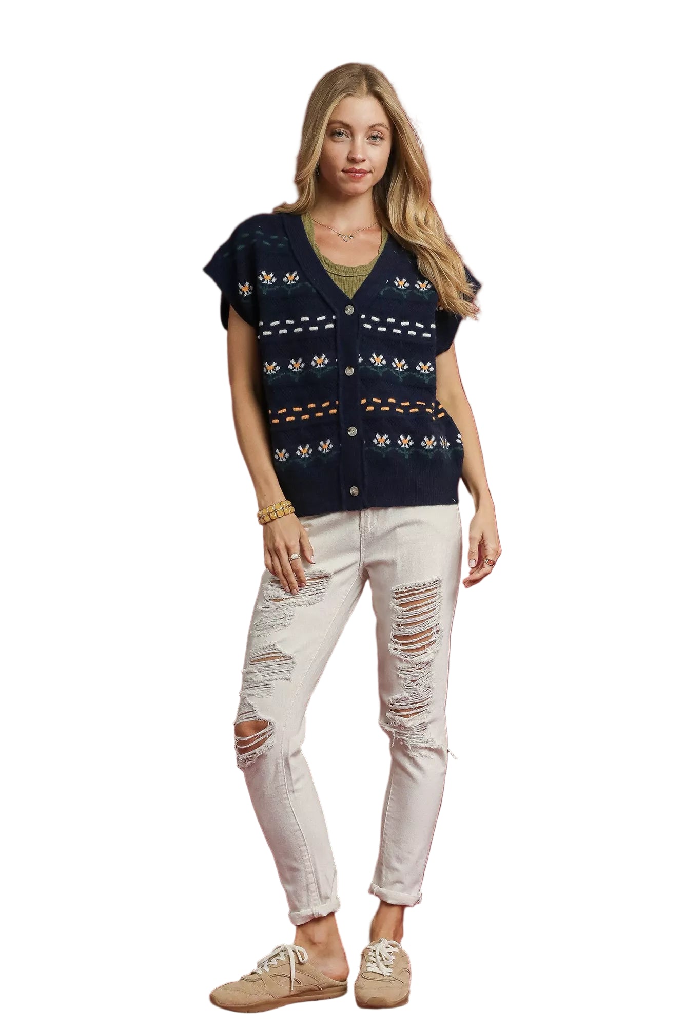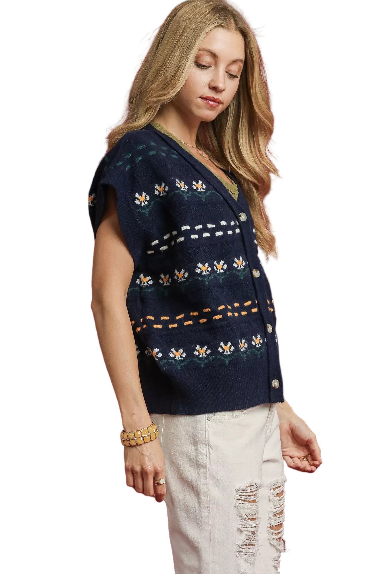 Embrace the essence of romance with the Umgee Button-Down Knit Vest, adorned with enchanting floral patterns that whisper tales of springtime love. Each charming daisy motif dances gracefully across the fabric, inviting warmth and whimsy into your wardrobe.