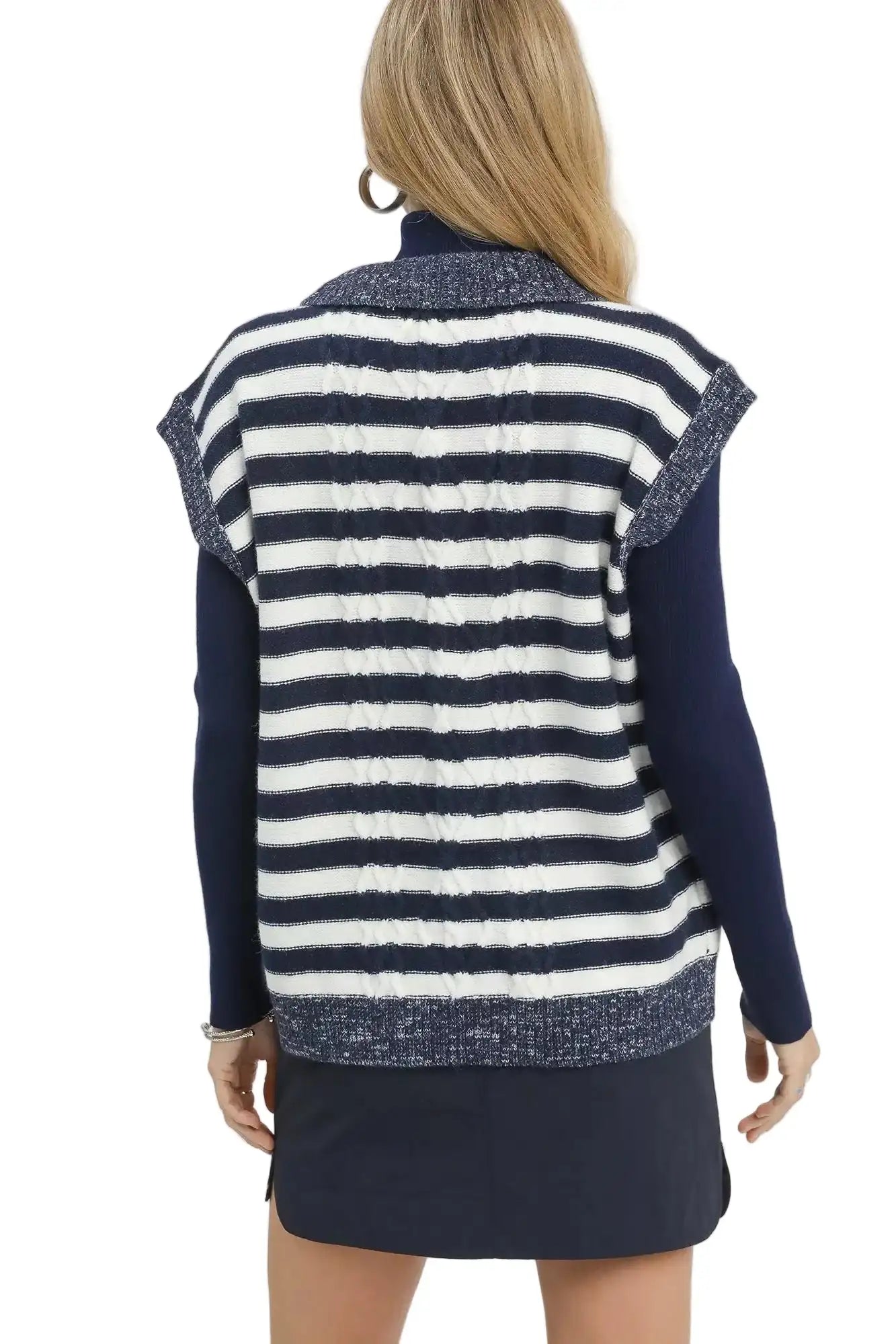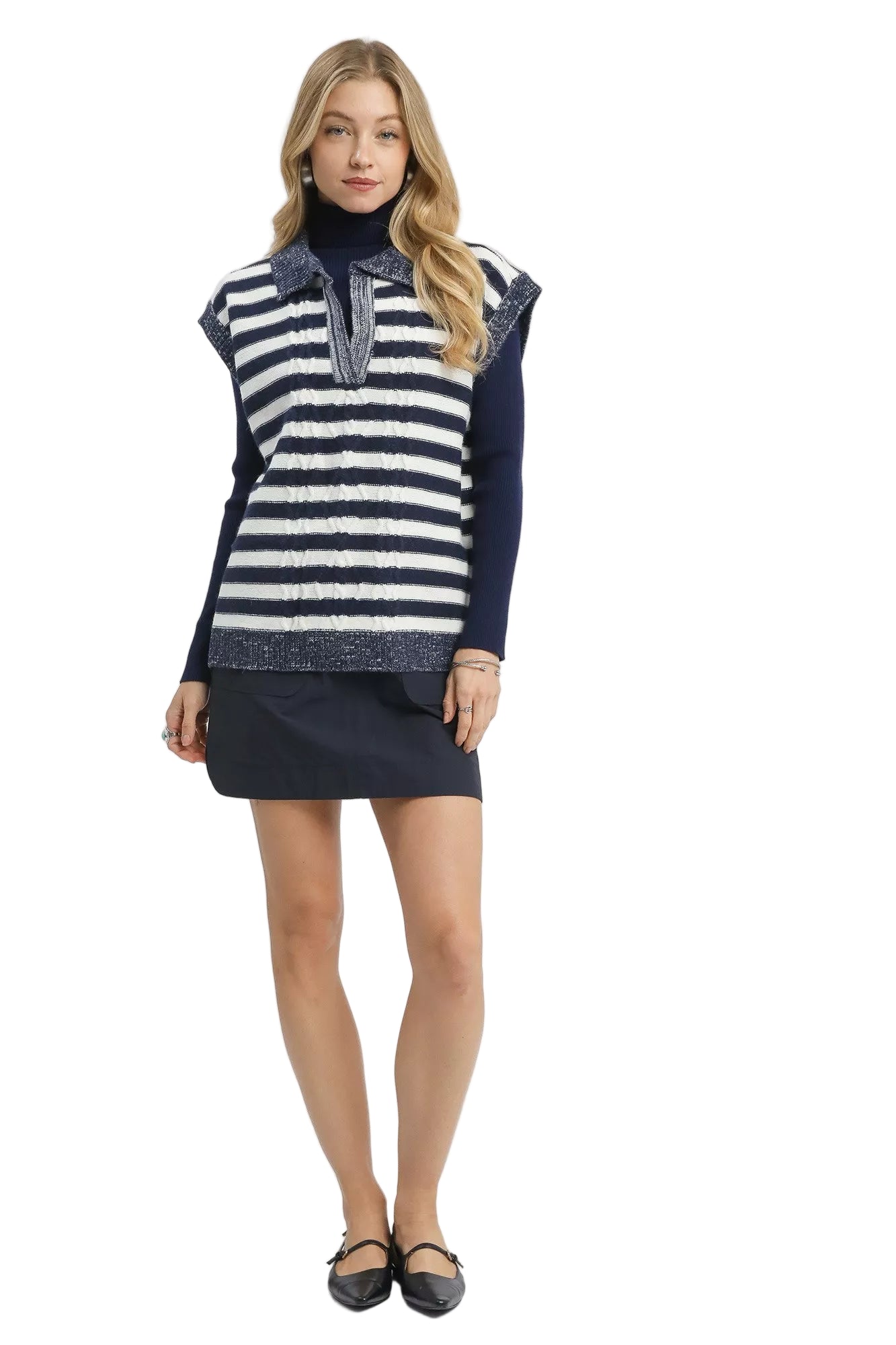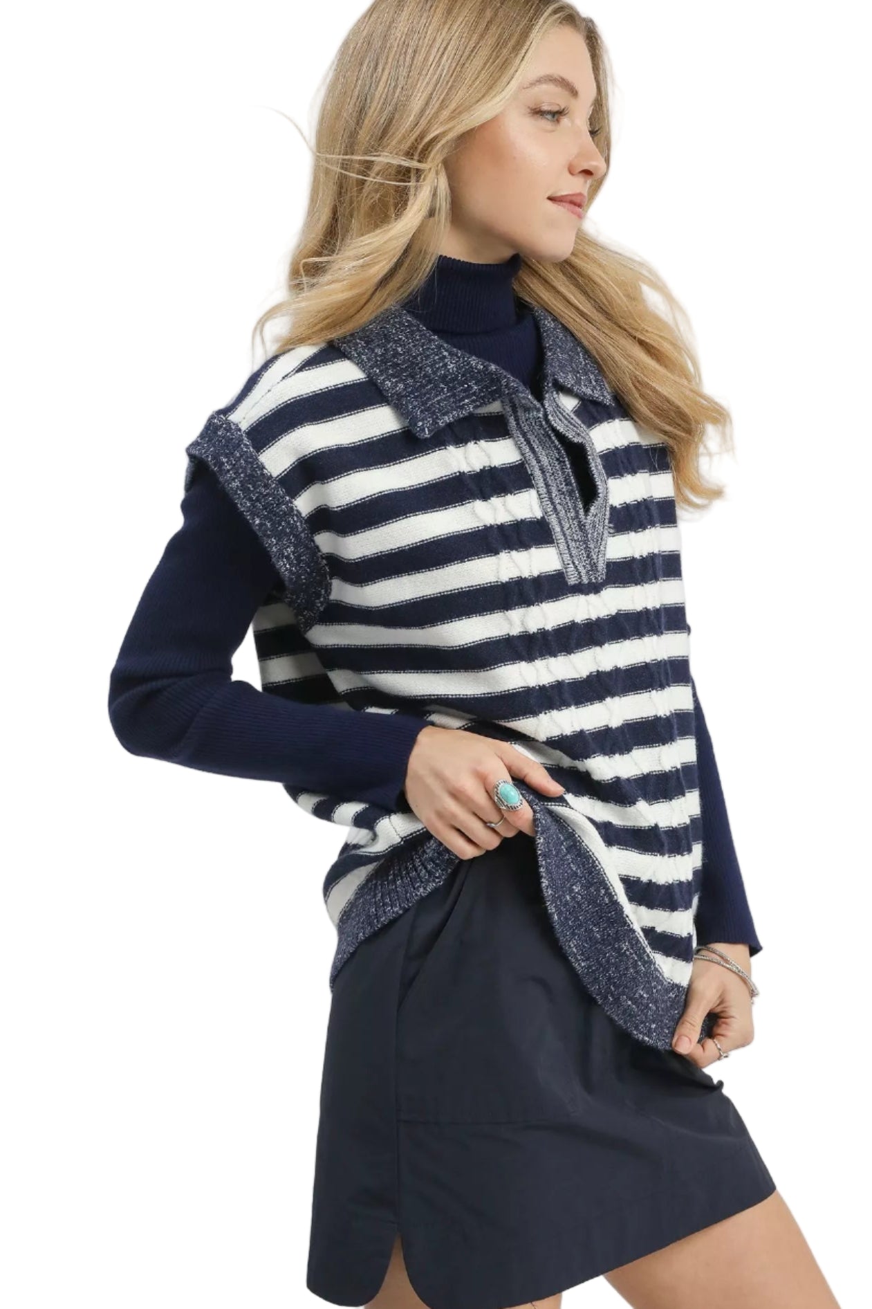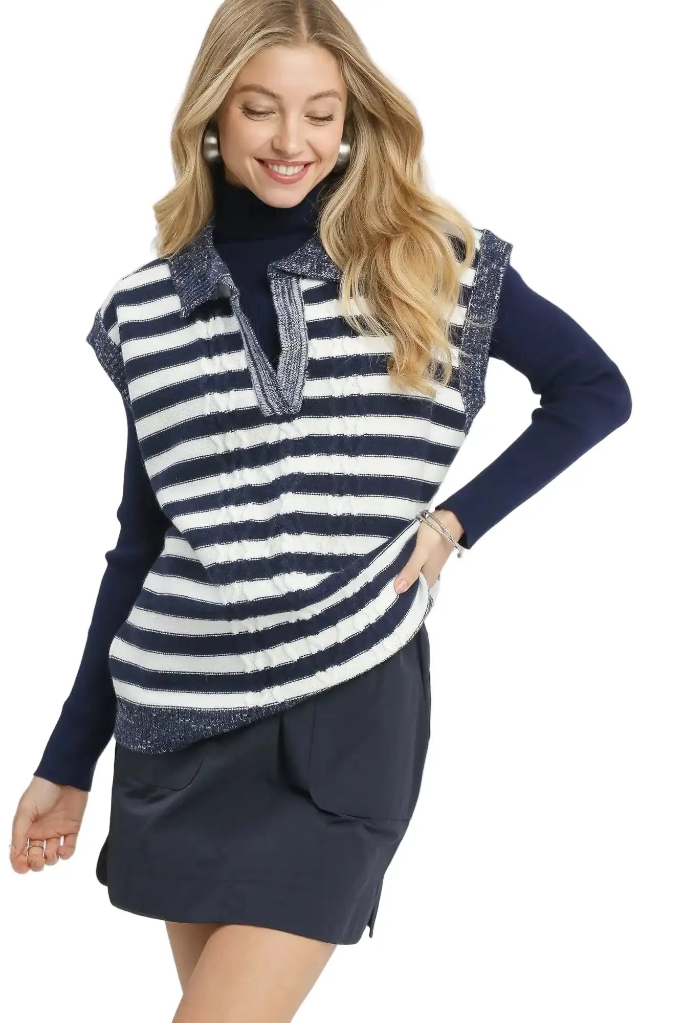 Wrap yourself in the warmth of romance with the Umgee Cable Knit Collared Striped Vest Sweater. This exquisite piece, with its timeless cable-knit design, whispers elegance and charm. The sleeveless silhouette and delicate cap sleeves create a soft allure, perfect for layering on cool evenings.