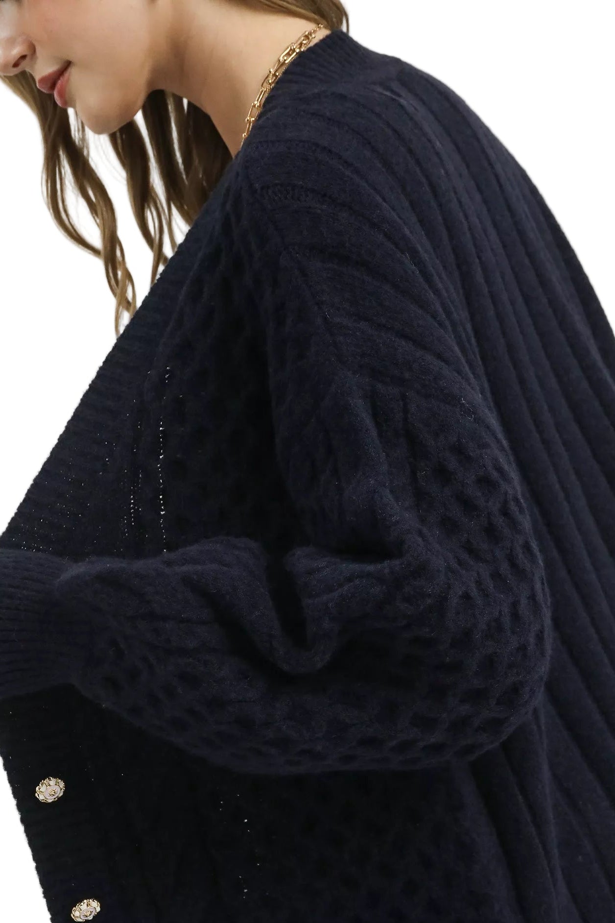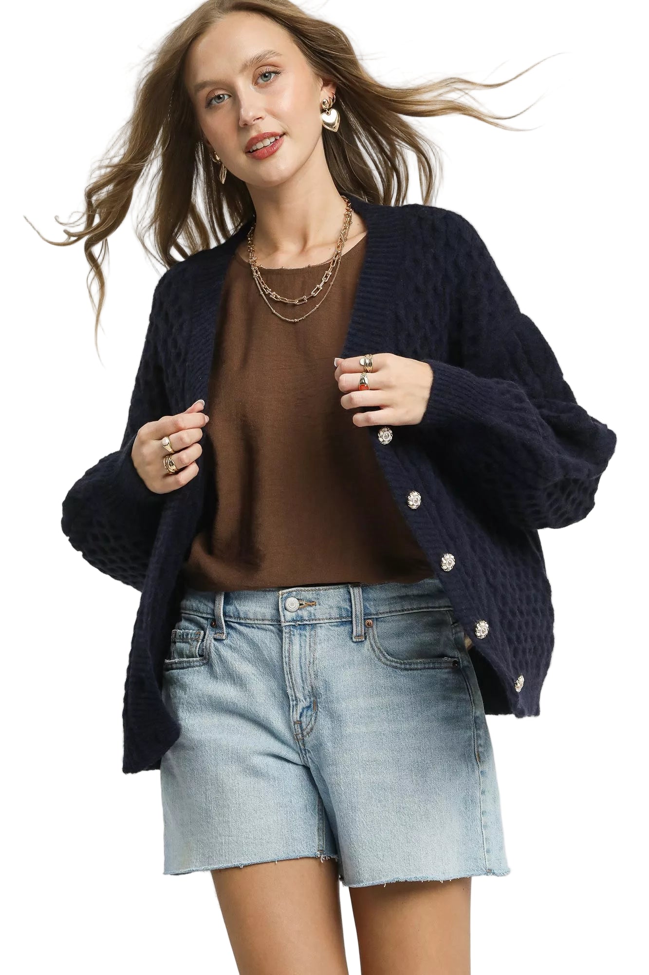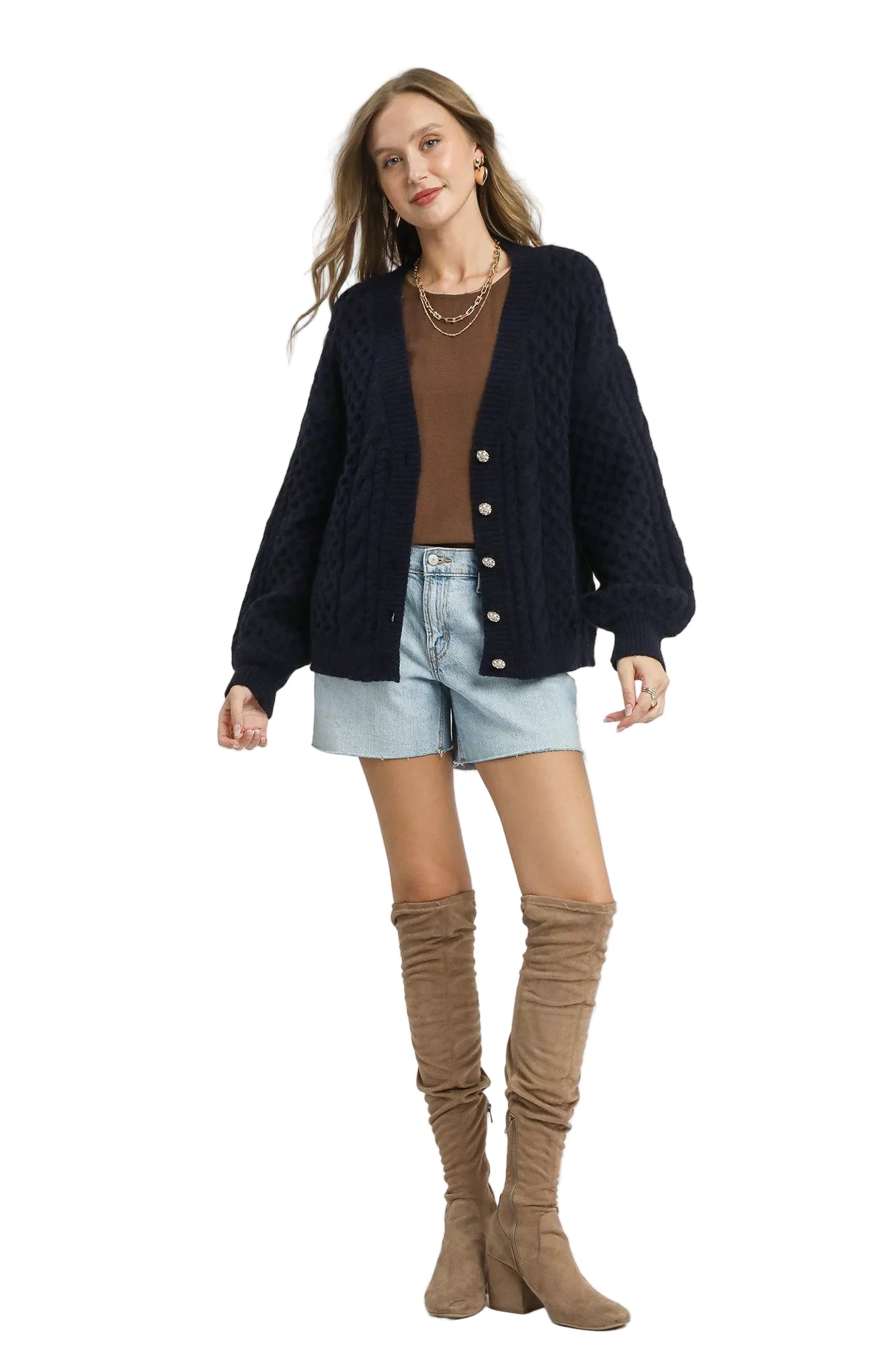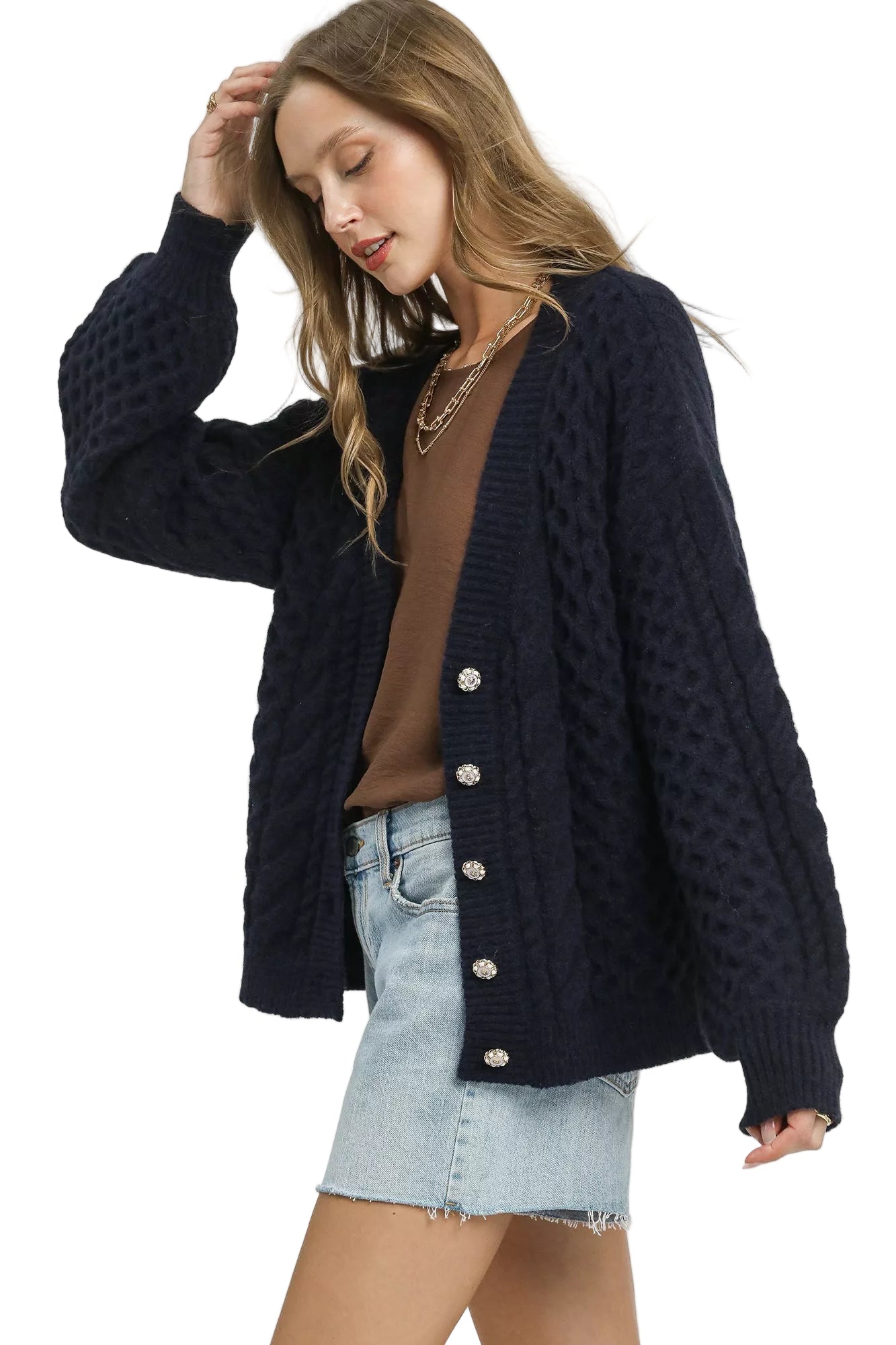 Wrap yourself in the warmth of romance with the Umgee Cable Knit Pearl Button Cardigan. This exquisite piece, adorned with delicate pearl buttons, whispers elegance and sophistication, perfect for those chilly evenings spent by the fire.