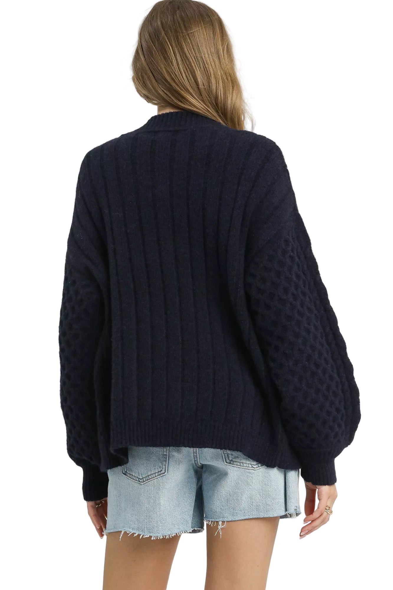 The soft cable knit caresses your skin, while the deep V-neck and long balloon sleeves create a silhouette that is both flattering and enchanting. With a ribbed hemline that adds a polished touch, this cardigan is a versatile companion for any outfit, inviting you to embrace comfort without sacrificing style.