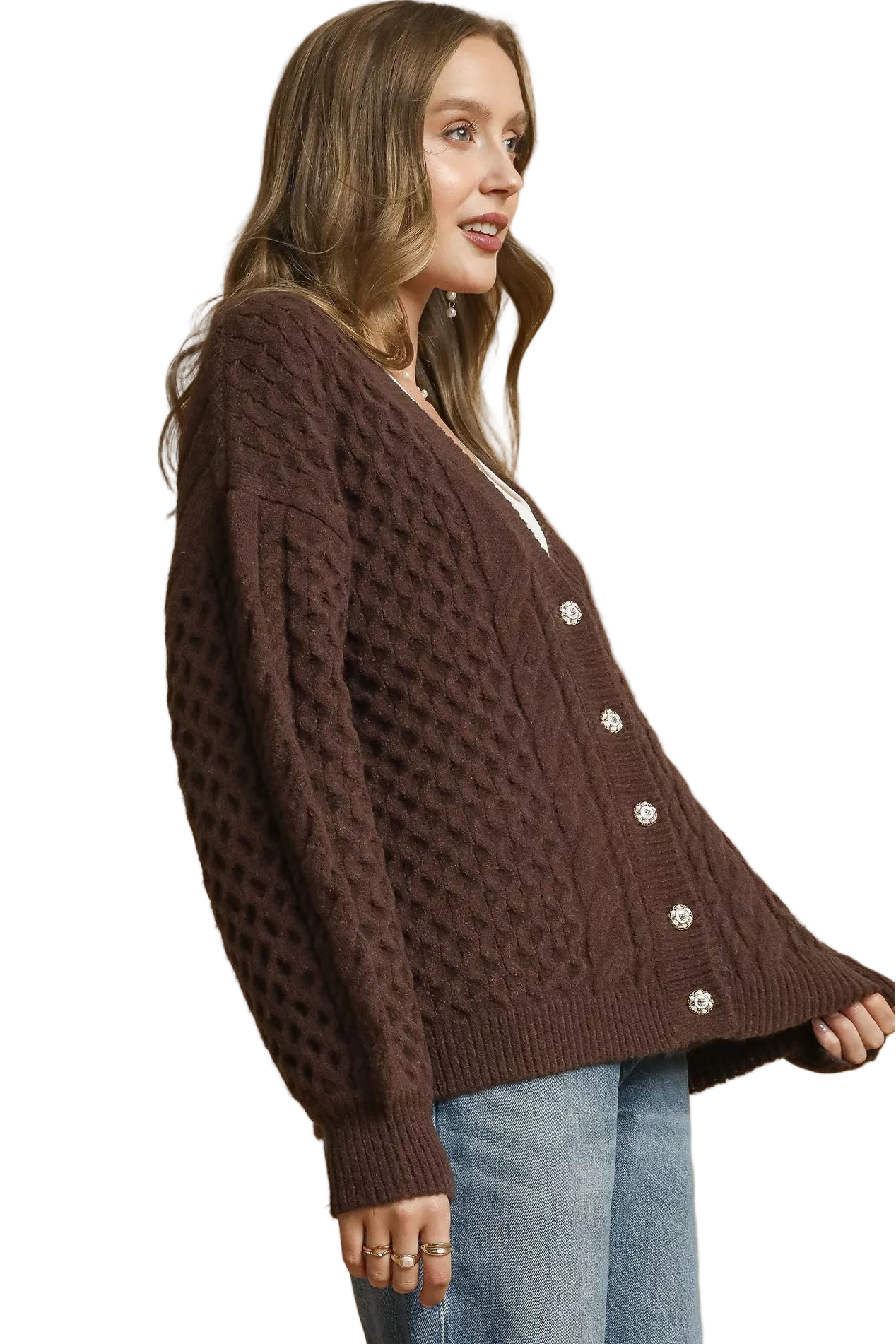 Wrap yourself in the warmth of romance with our Cable Knit Pearl Button Cardigan. This exquisite piece, adorned with delicate pearl buttons, whispers elegance and sophistication, perfect for those chilly evenings spent by the fire.