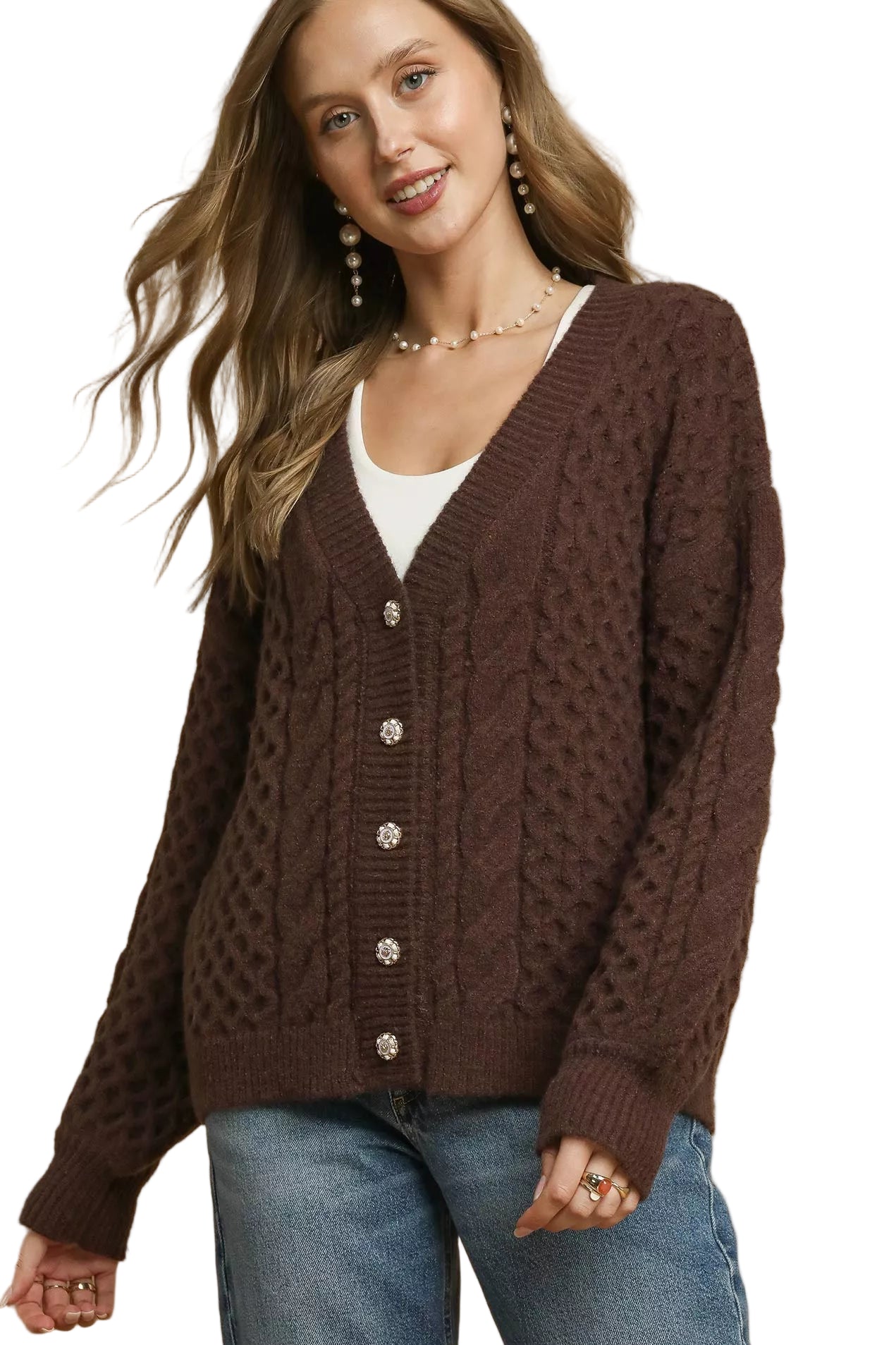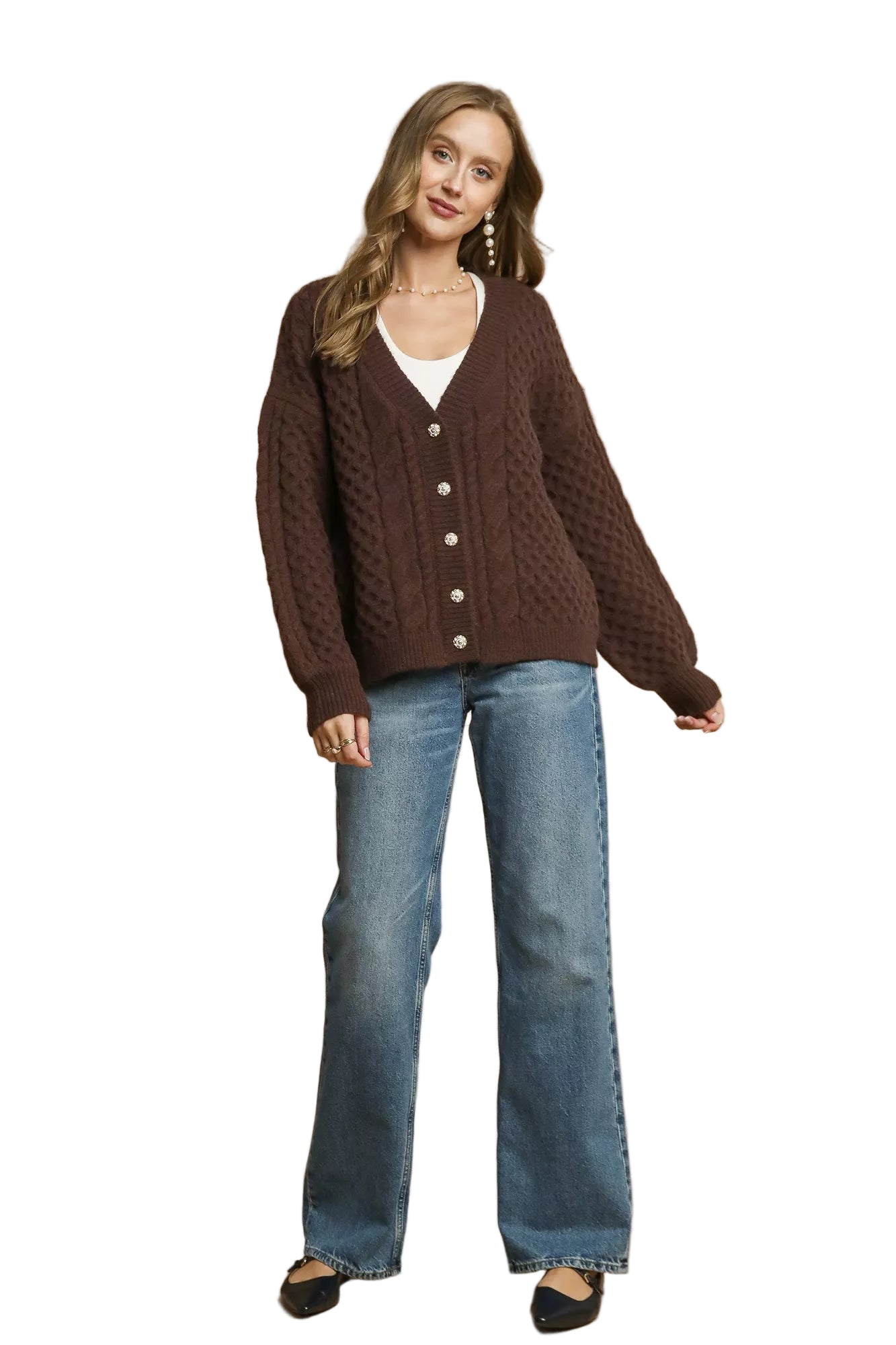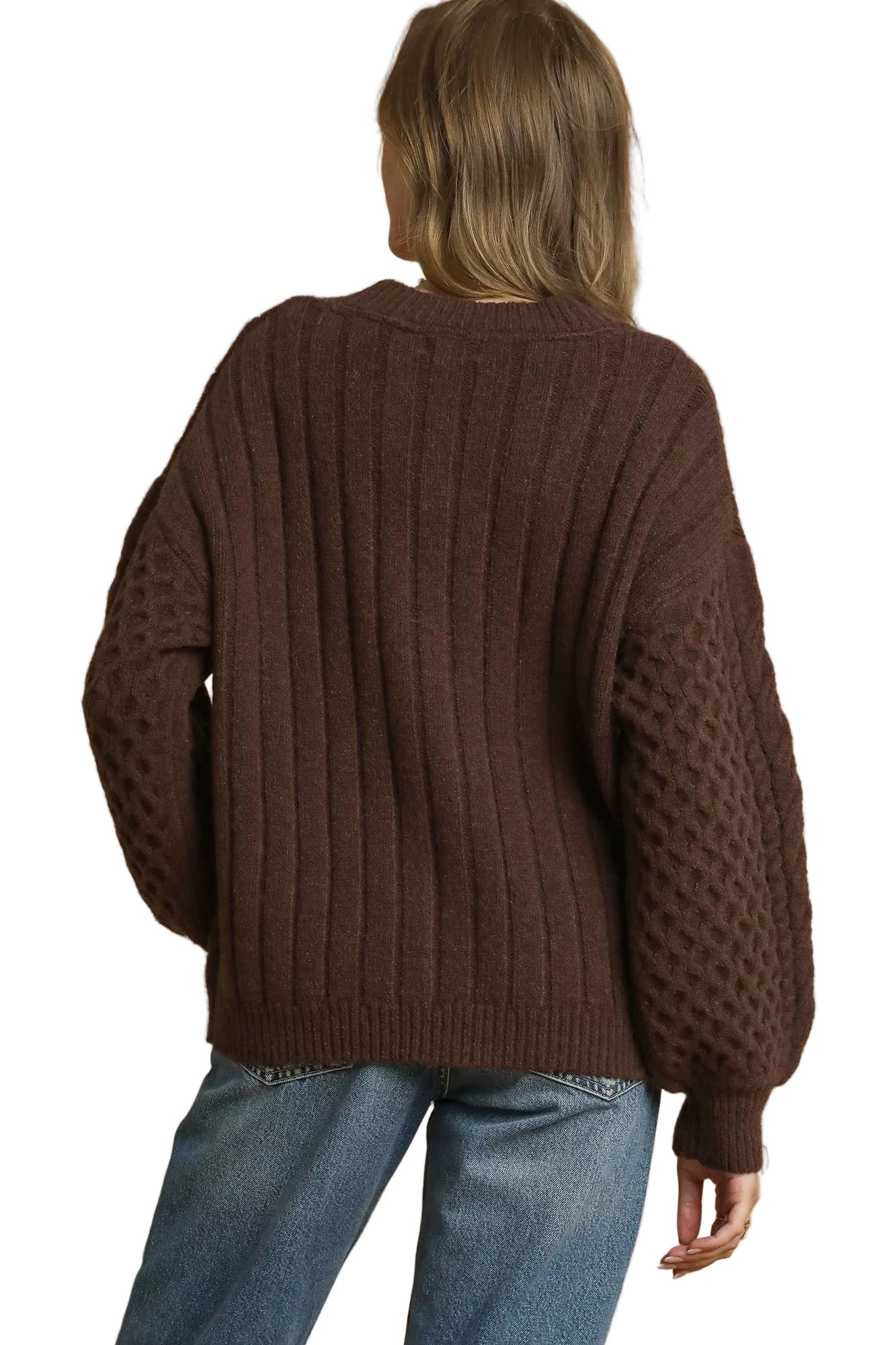 The soft cable knit caresses your skin, while the deep V-neck and long balloon sleeves create a silhouette that is both timeless and enchanting. With a ribbed hemline that adds a polished touch, this cardigan is a versatile companion for any outfit, inviting you to layer it with love.