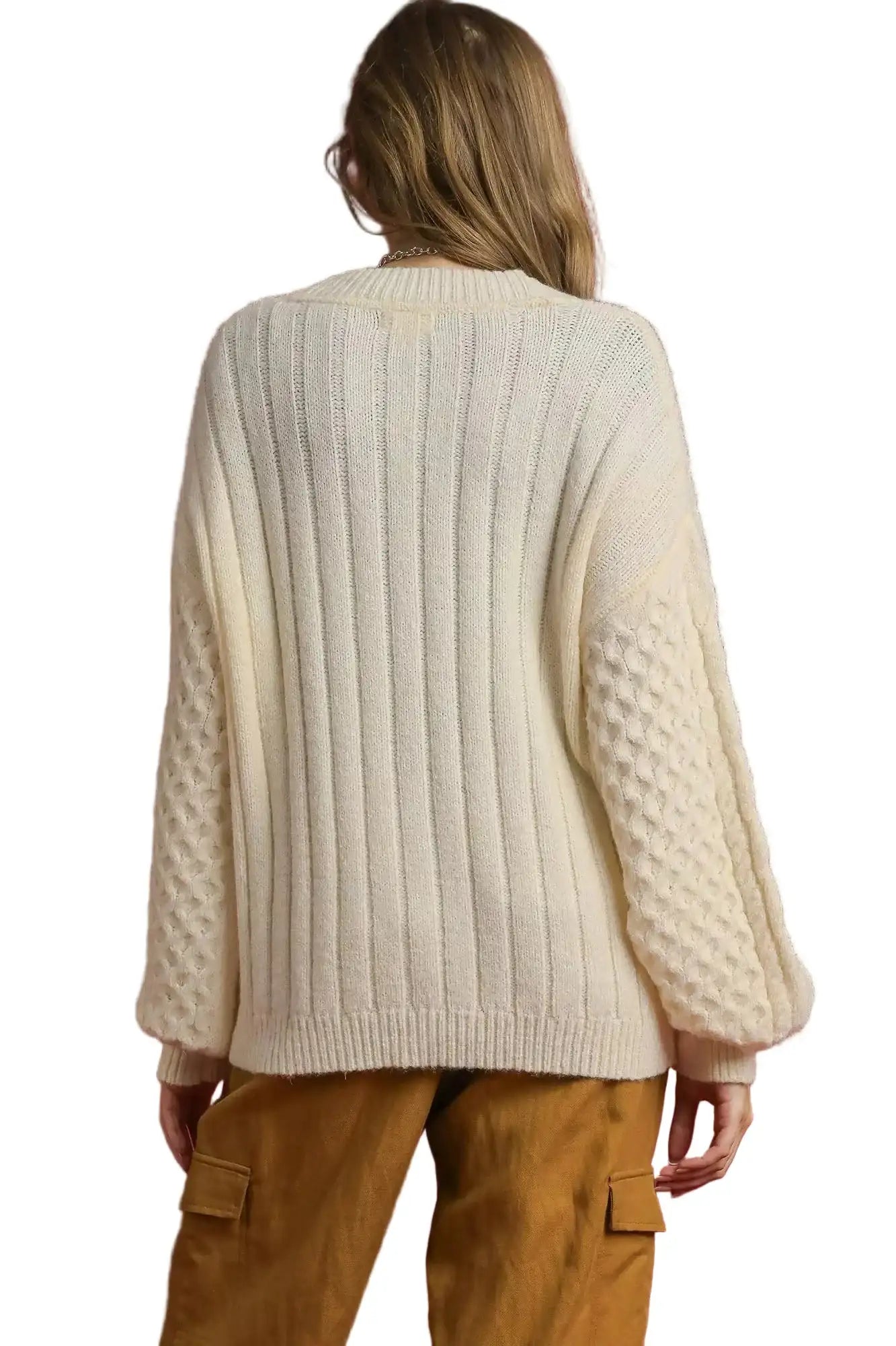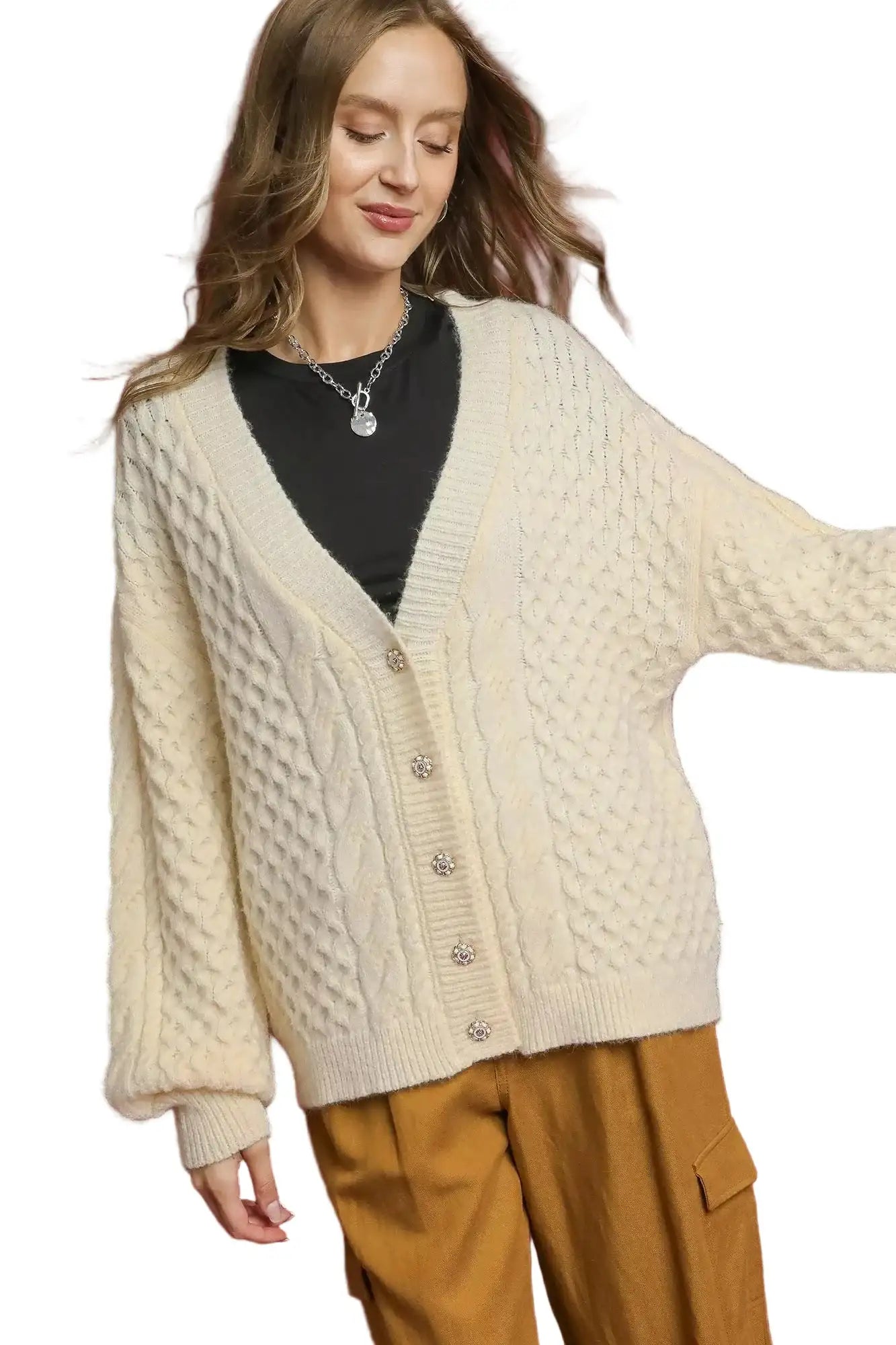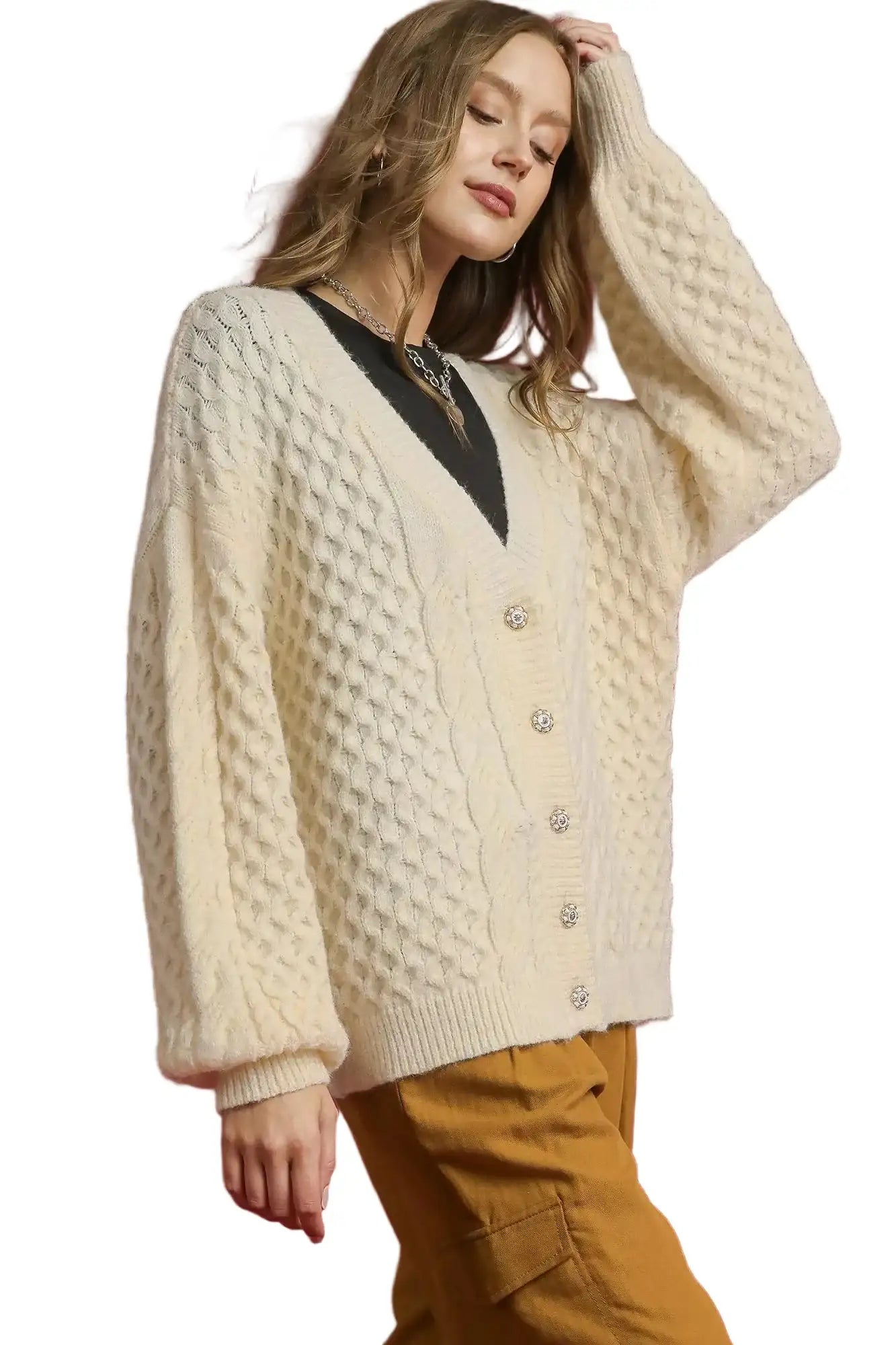 The soft cable knit caresses your skin, while the deep V-neck and long balloon sleeves create a silhouette that enchants. With a ribbed hemline that adds a polished touch, this cardigan is a versatile companion, effortlessly elevating any outfit. Embrace the allure of comfort and style, and let your heart flutter with every wear.