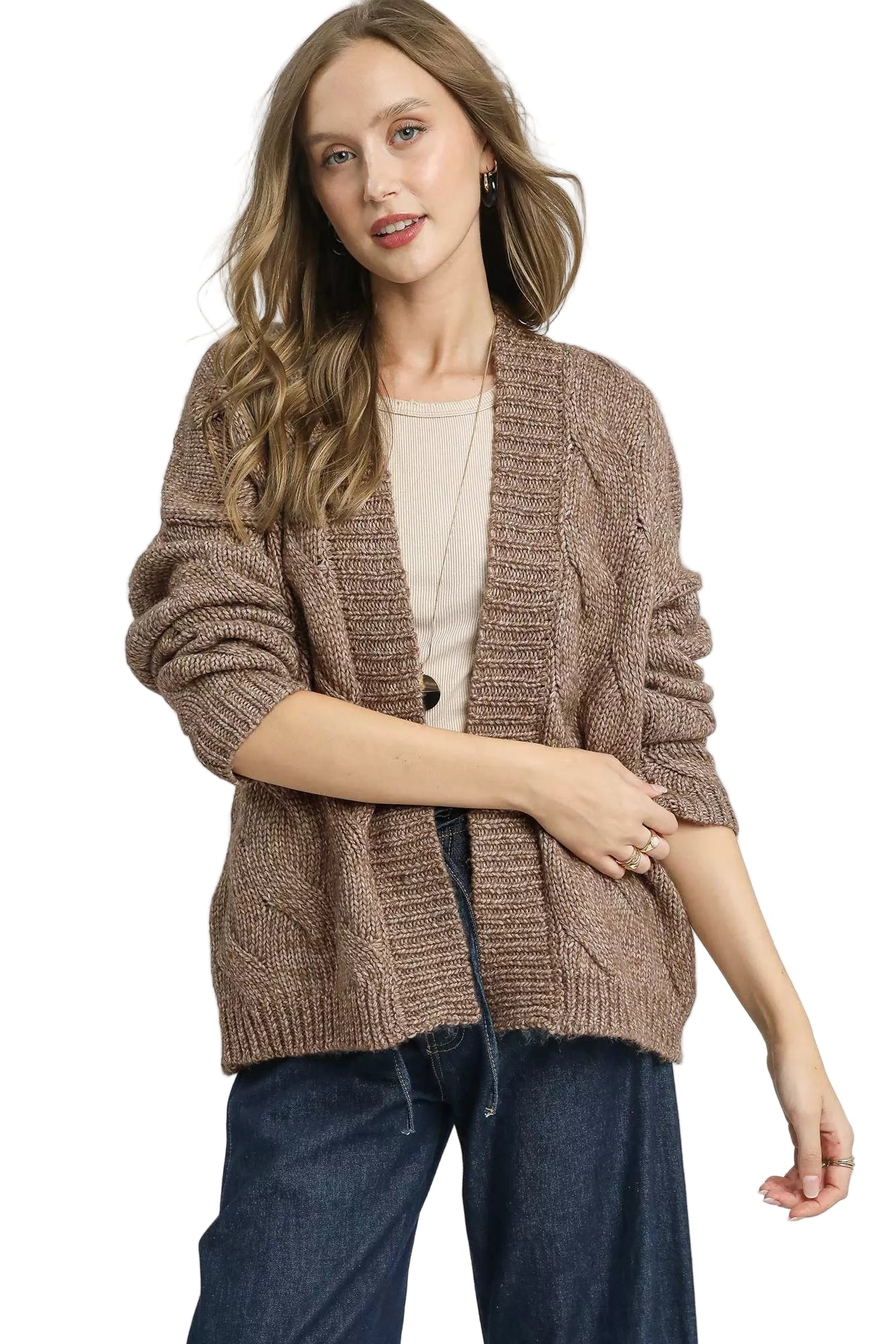 Wrap yourself in the warmth of romance with the Umgee Chunky Cable Knit Open Front Cardigan. This exquisite piece embraces you with its cozy, textured design, perfect for those intimate evenings by the fire.