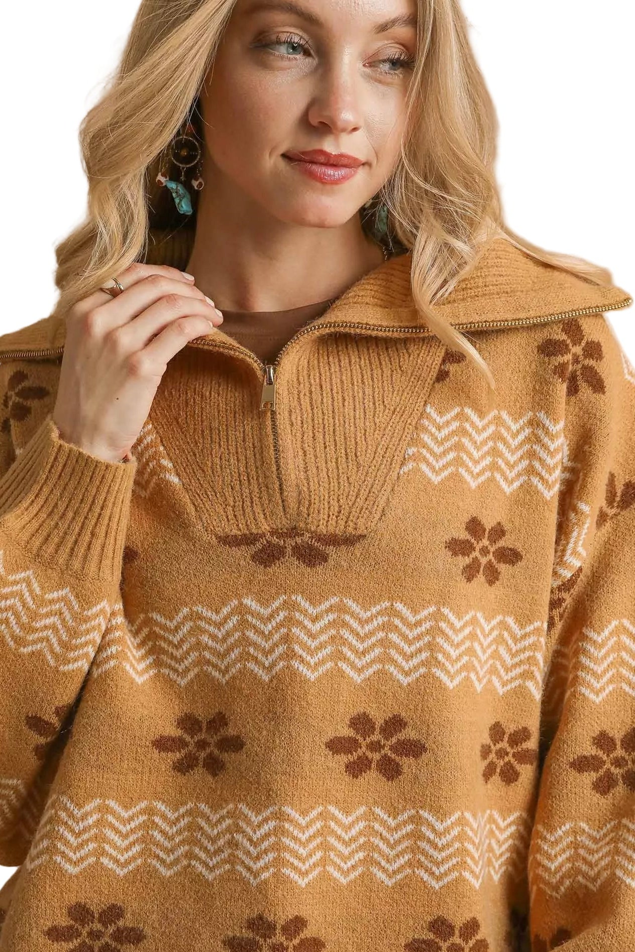 Wrap yourself in the enchanting embrace of our Floral Patterned Jacquard Quarter-Zip Pullover Sweater. Adorned with a delicate broken chevron and floral design, this piece whispers romance with every stitch. The quarter-zip collar invites a playful touch, while the long sleeves, complete with ribbed cuffs, cradle you in warmth.