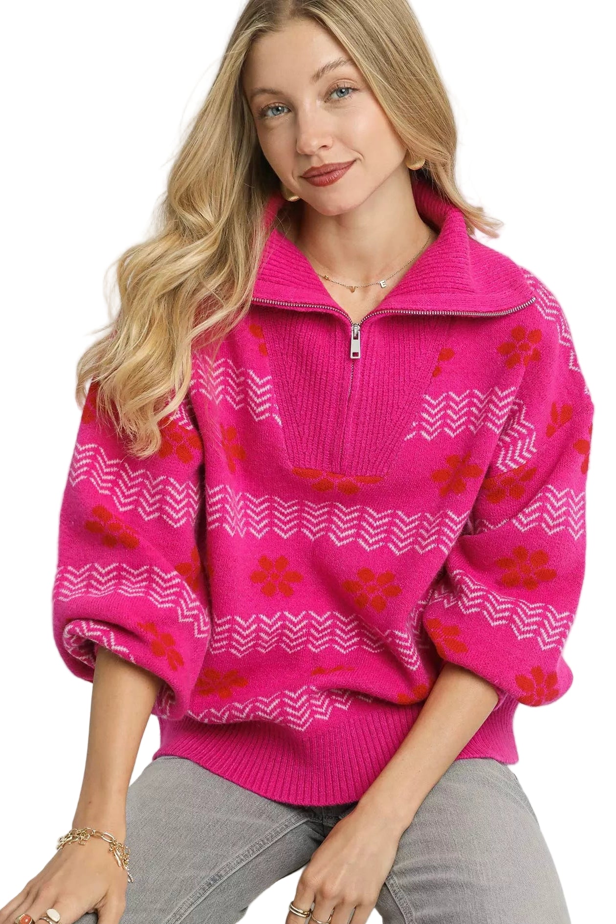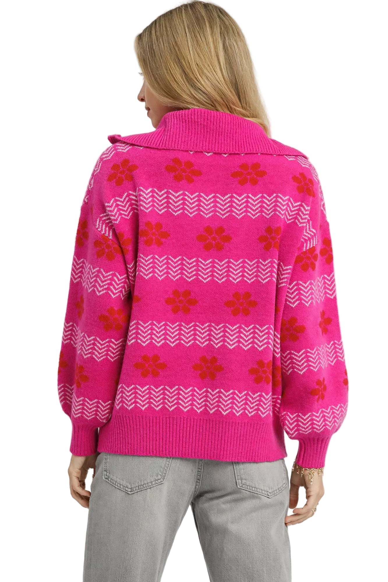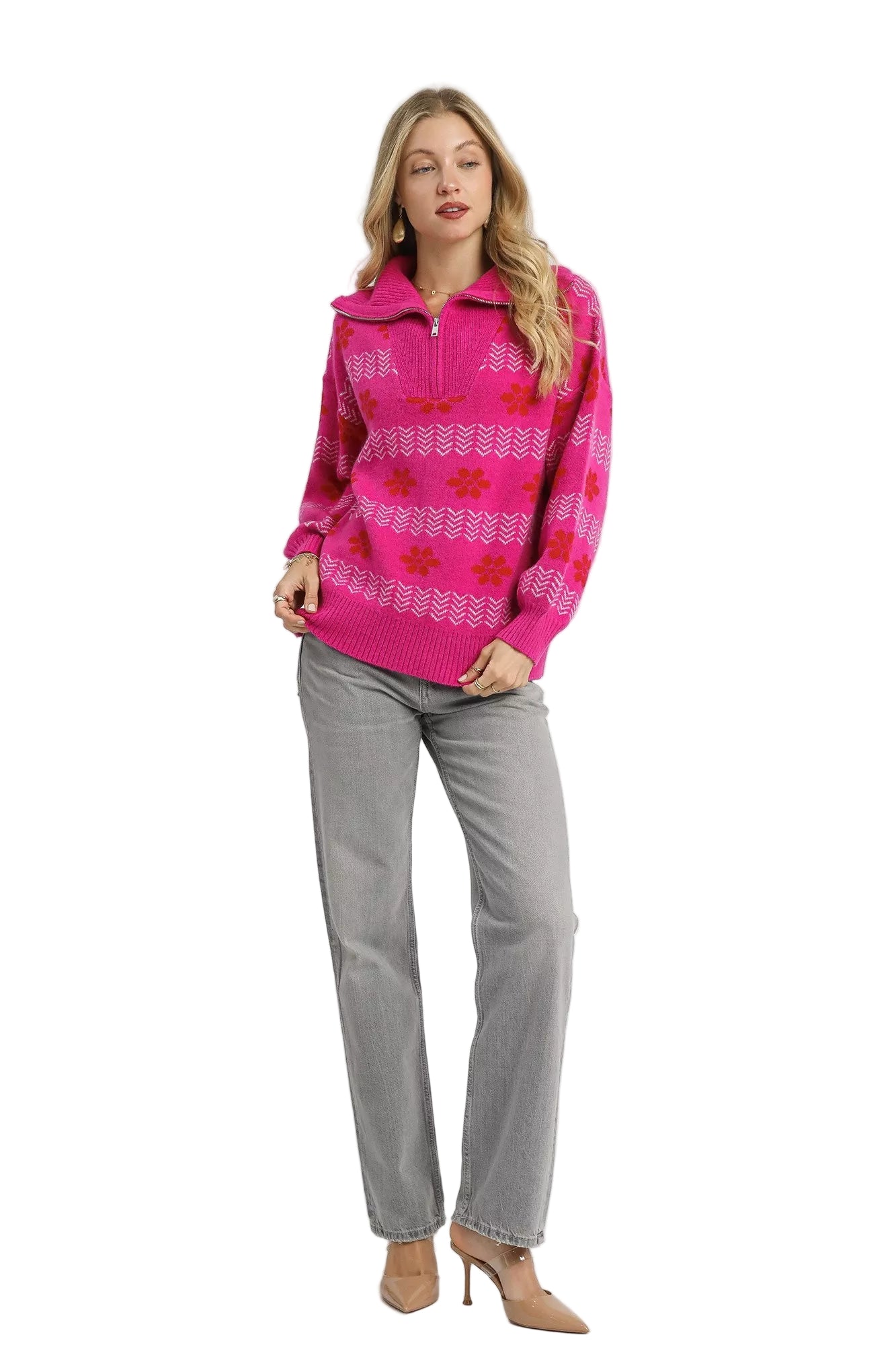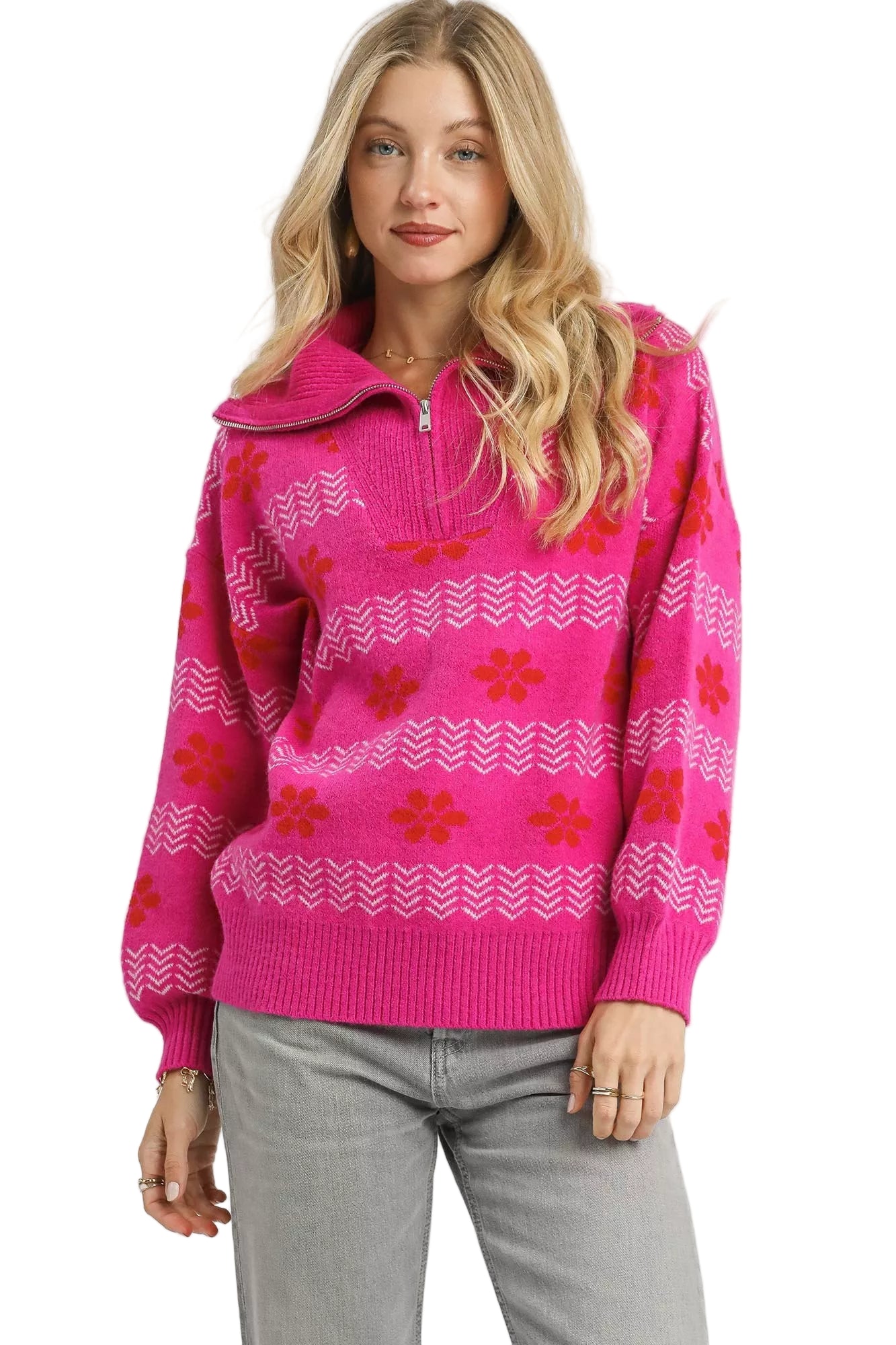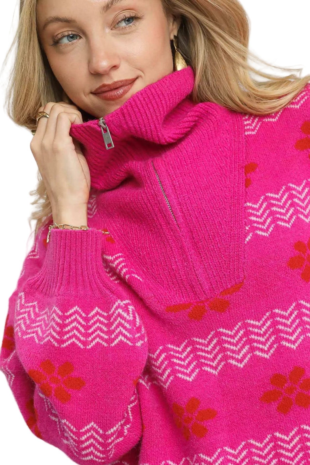 Wrap yourself in the enchanting embrace of our Floral Patterned Jacquard Quarter-Zip Pullover Sweater. Adorned with a delicate broken chevron and floral design, this piece whispers romance with every stitch. The quarter-zip collar invites you to explore its modern allure, while the long sleeves, kissed with ribbed cuffs, promise a snug fit that feels like a warm hug on a chilly evening.