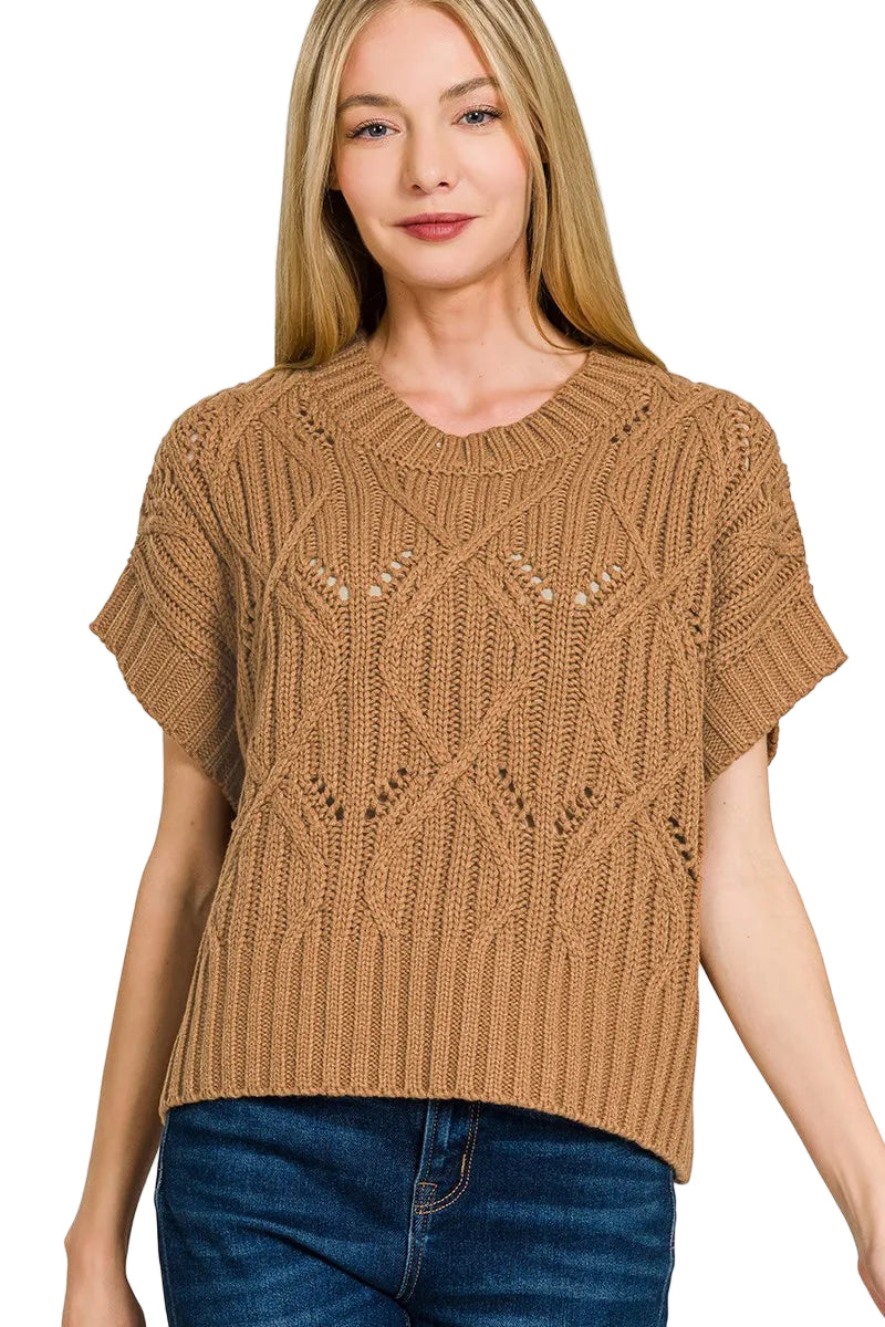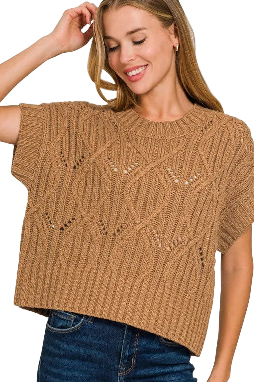 Wrap yourself in the warm embrace of the Zenana Cable Knit Short Sleeve Sweater, a piece that whispers romance with every stitch. Its intricate textured pattern dances gracefully across the soft knit fabric, inviting you to indulge in its cozy charm.