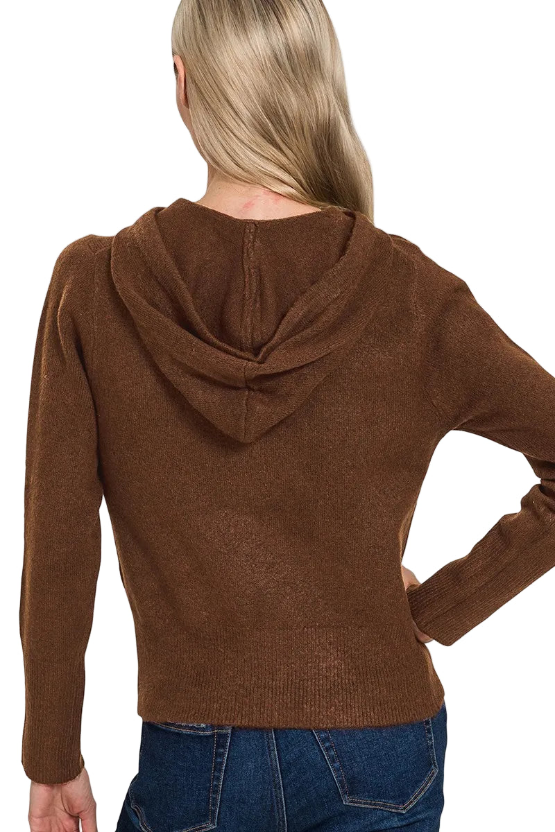 Wrap yourself in the warm embrace of the Zenana Drawstring Zip Up Hooded Cardigan, a piece that whispers romance with every stitch. Its soft, knitted fabric caresses your skin, while the earthy brown hue evokes the warmth of a cozy autumn evening.
