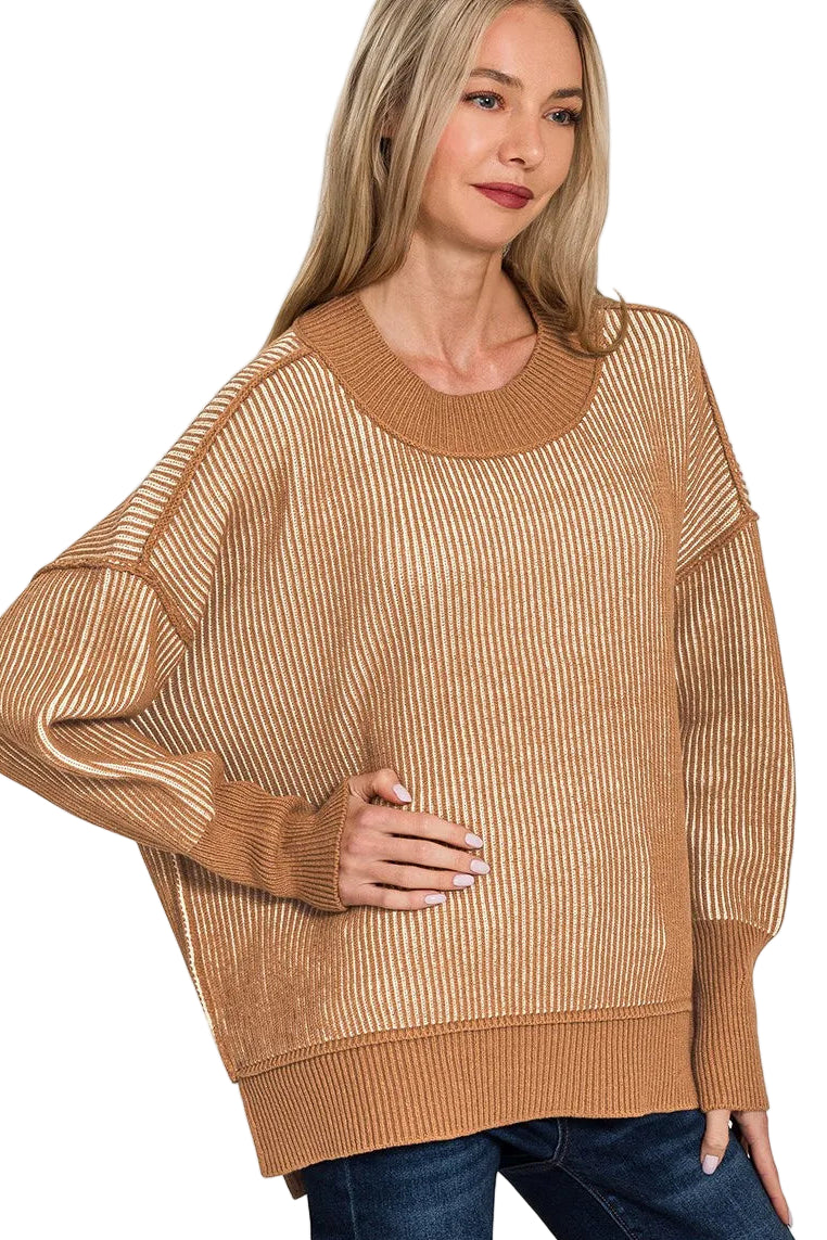 Wrap yourself in the warm embrace of the Zenana Exposed Seam Two Tone Ribbed Sweater, where comfort meets elegance. This oversized pullover, crafted from a sumptuous blend of soft fabrics, whispers sweet nothings of warmth against your skin, inviting you to indulge in its cozy allure.