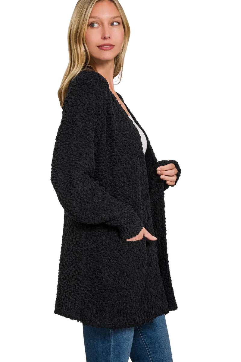Wrap yourself in the tender embrace of our Long Sleeve Popcorn Sweater Cardigan with Pockets, a piece that whispers warmth and romance. Its delightful popcorn texture invites you to run your fingers over its surface, while the gentle drape caresses your silhouette, creating an aura of effortless elegance.
