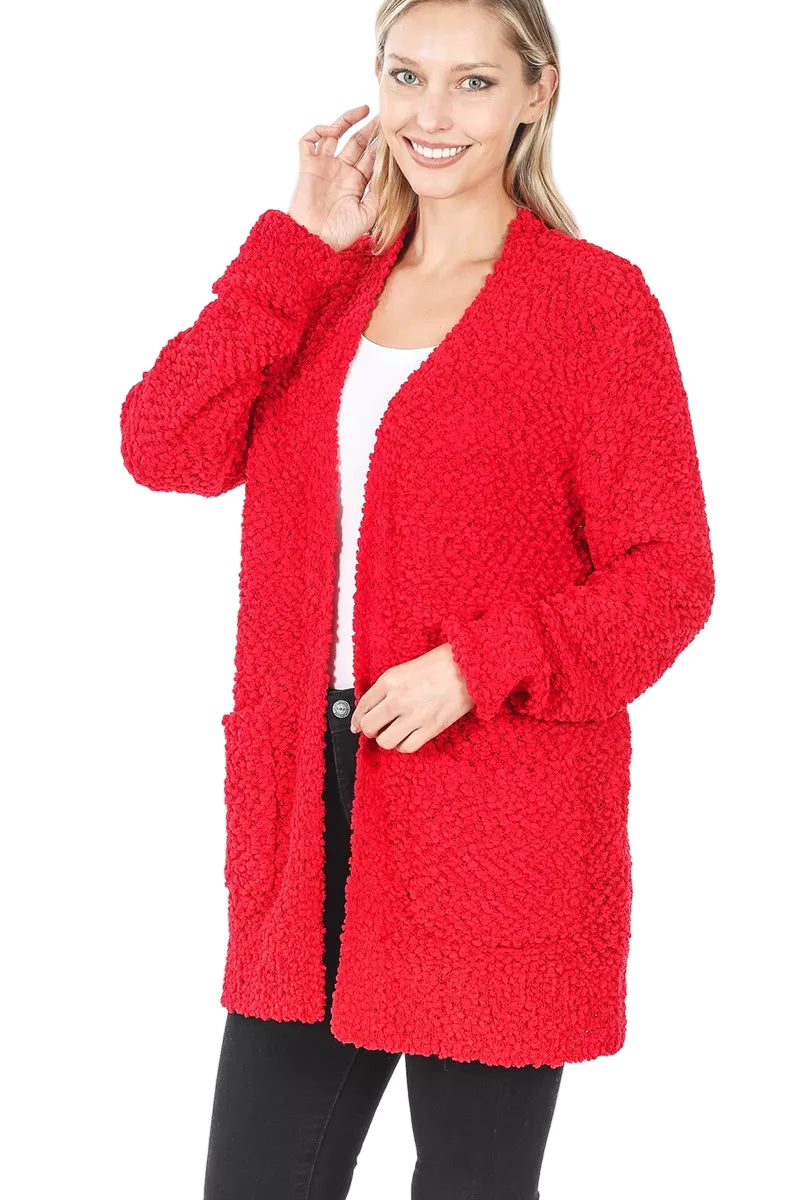 Wrap yourself in the warmth of romance with the Zenana Long Sleeve Popcorn Sweater Cardigan. This exquisite ruby red piece, with its luxurious popcorn knit texture, invites you to indulge in its soft embrace. The open front design effortlessly layers over your favorite outfits, creating a look that is both modern and timeless.