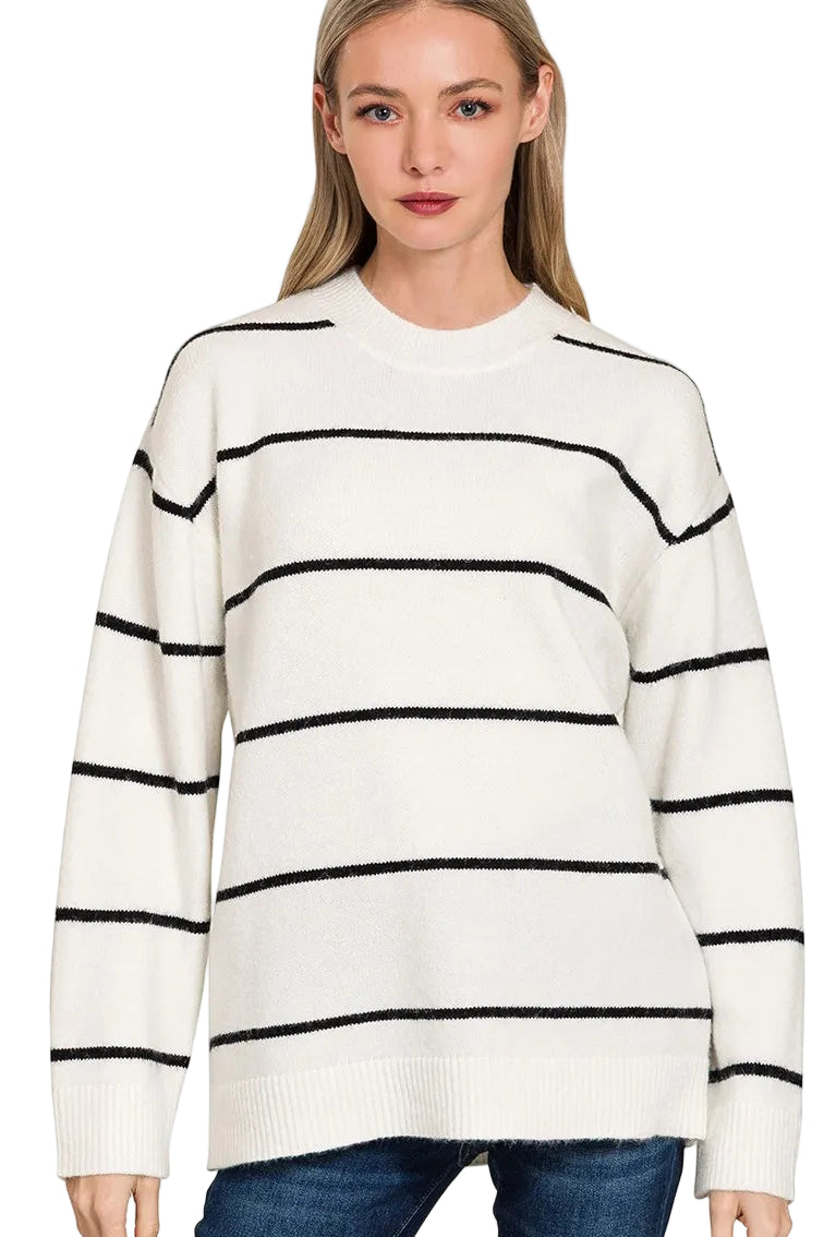 Wrap yourself in the tender embrace of the Zenana Round Neck Stripe Sweater, where comfort meets elegance. This classic pullover, adorned with soft black stripes against a pristine white canvas, whispers of cozy evenings spent in the warmth of love.