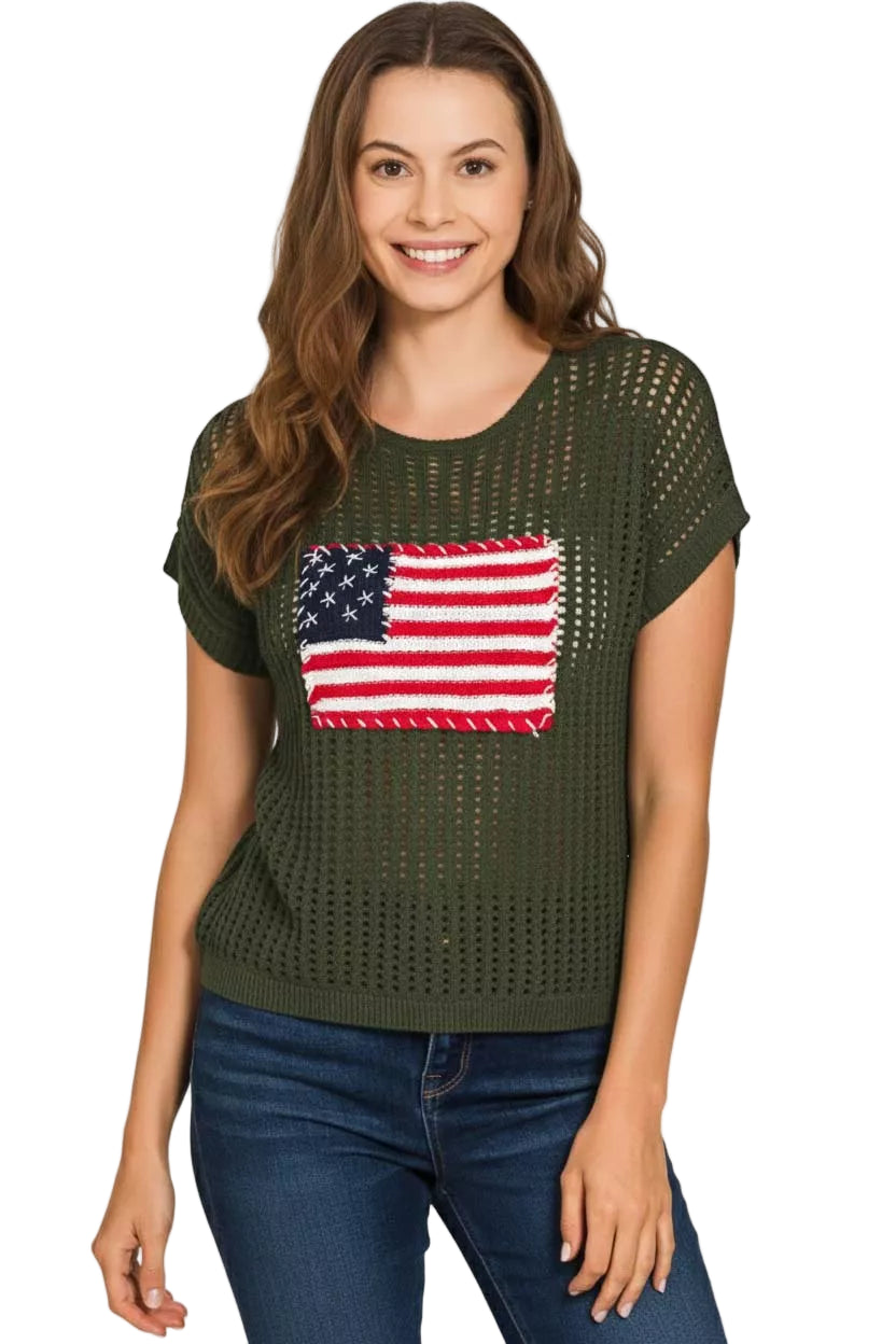 Embrace the spirit of freedom with the Zenana Viscose American Flag Openwork Knit Top, a piece that whispers romance and patriotism. Its enchanting patchwork design dances with the colors of the flag, inviting admiration and sparking conversations.