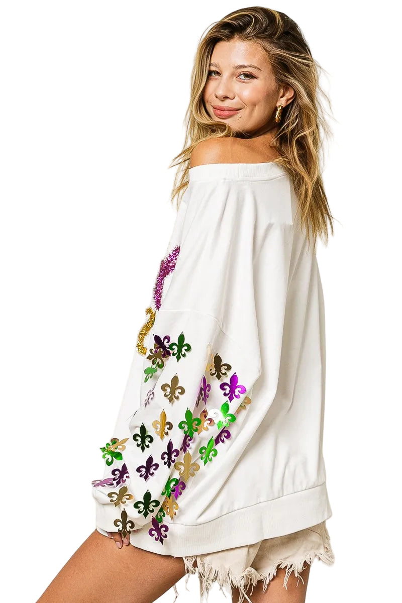 Embrace the spirit of celebration with the enchanting Fleur De Lis Sleeve Mardi Gras Pullover. Adorned with exquisite Fleur De Lis designs, its sleeves whisper tales of festivity and elegance, inviting you to revel in the joyous atmosphere of Mardi Gras.