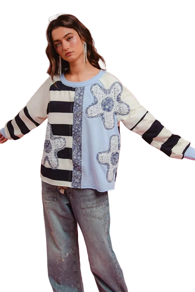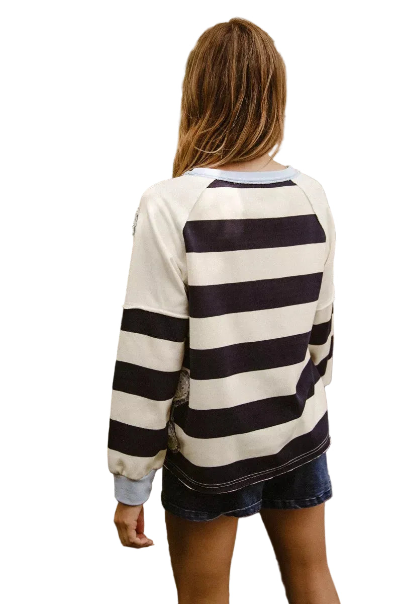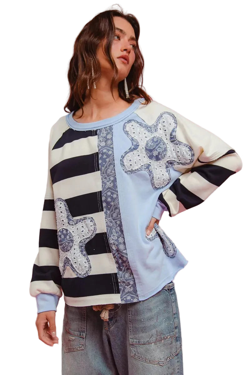 BiBi Patchwork Striped Round Neck Sweatshirt