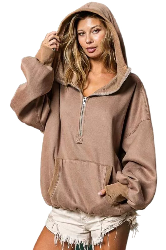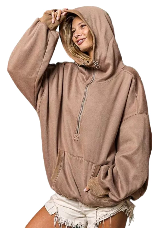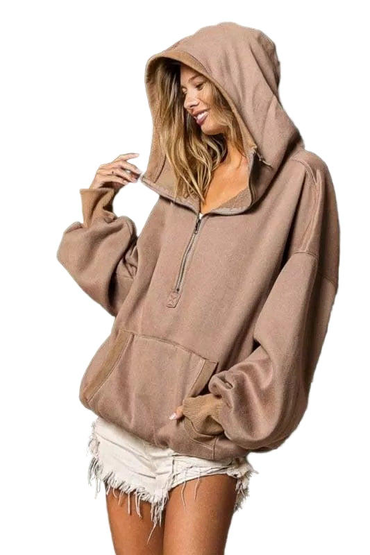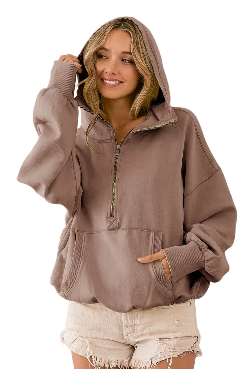 Stay cozy and stylish in this stitch-detailed elastic hem half-zip fleece hoodie. The stitch details add a touch of texture and interest to the hoodie. The elastic hem provides a comfortable and secure fit. Perfect for layering over your favorite tops for added warmth and style. Elevate your casual look with this trendy and practical hoodie.