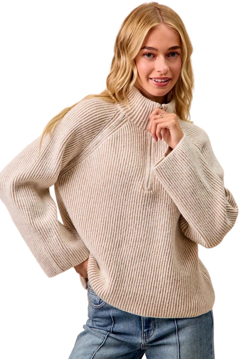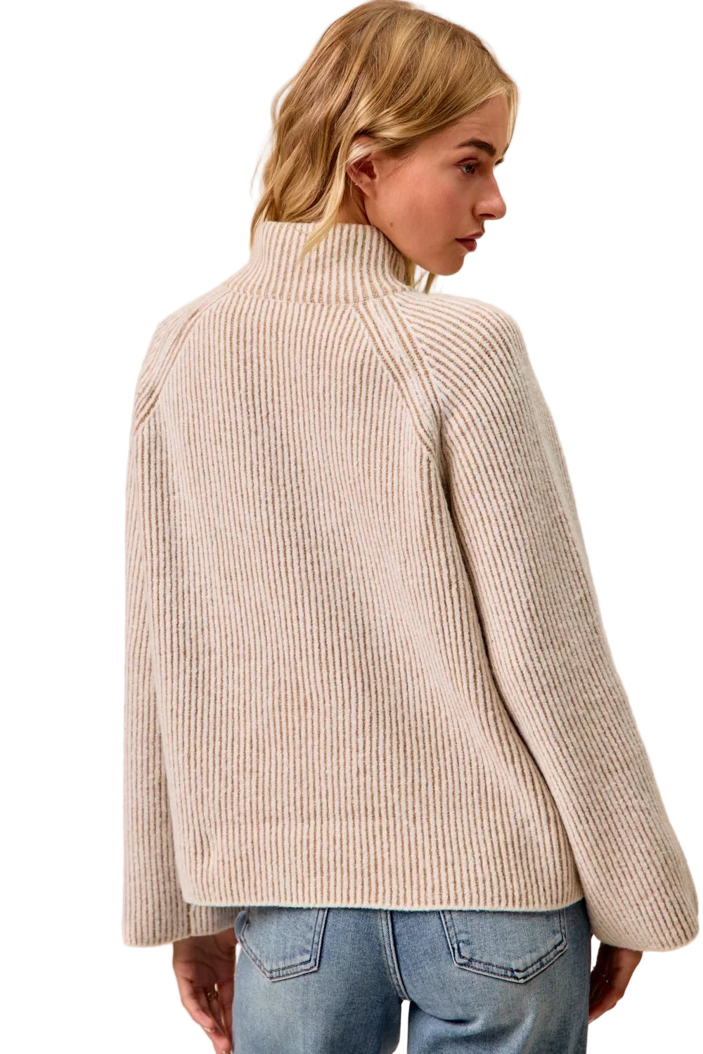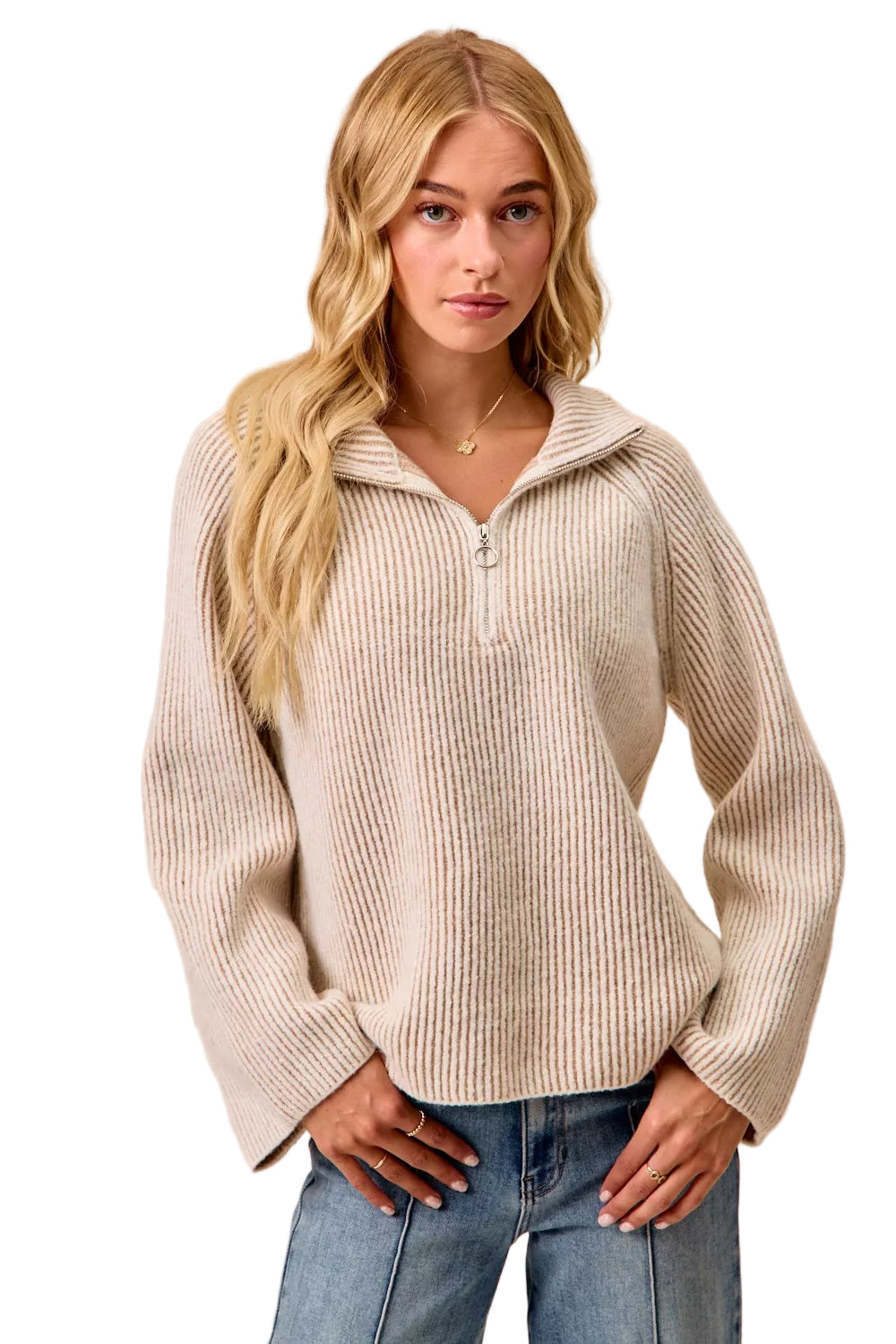 Embrace the allure of romance with the BiBi Two Tone Rib Textured Knit Collared Top. This enchanting piece, adorned with a unique two-tone ribbed texture, whispers elegance and sophistication. The modern zip-up detailing dances gracefully along the classic silhouette, inviting you to explore your style.