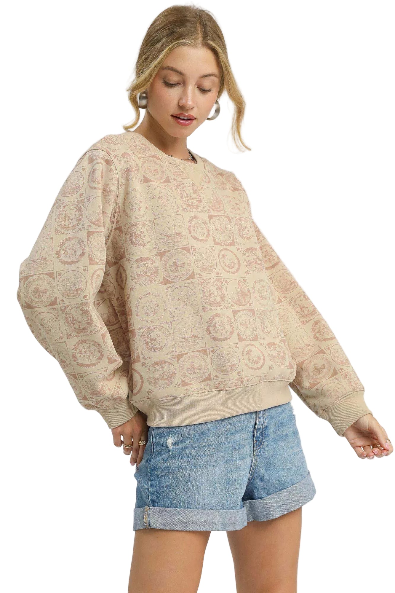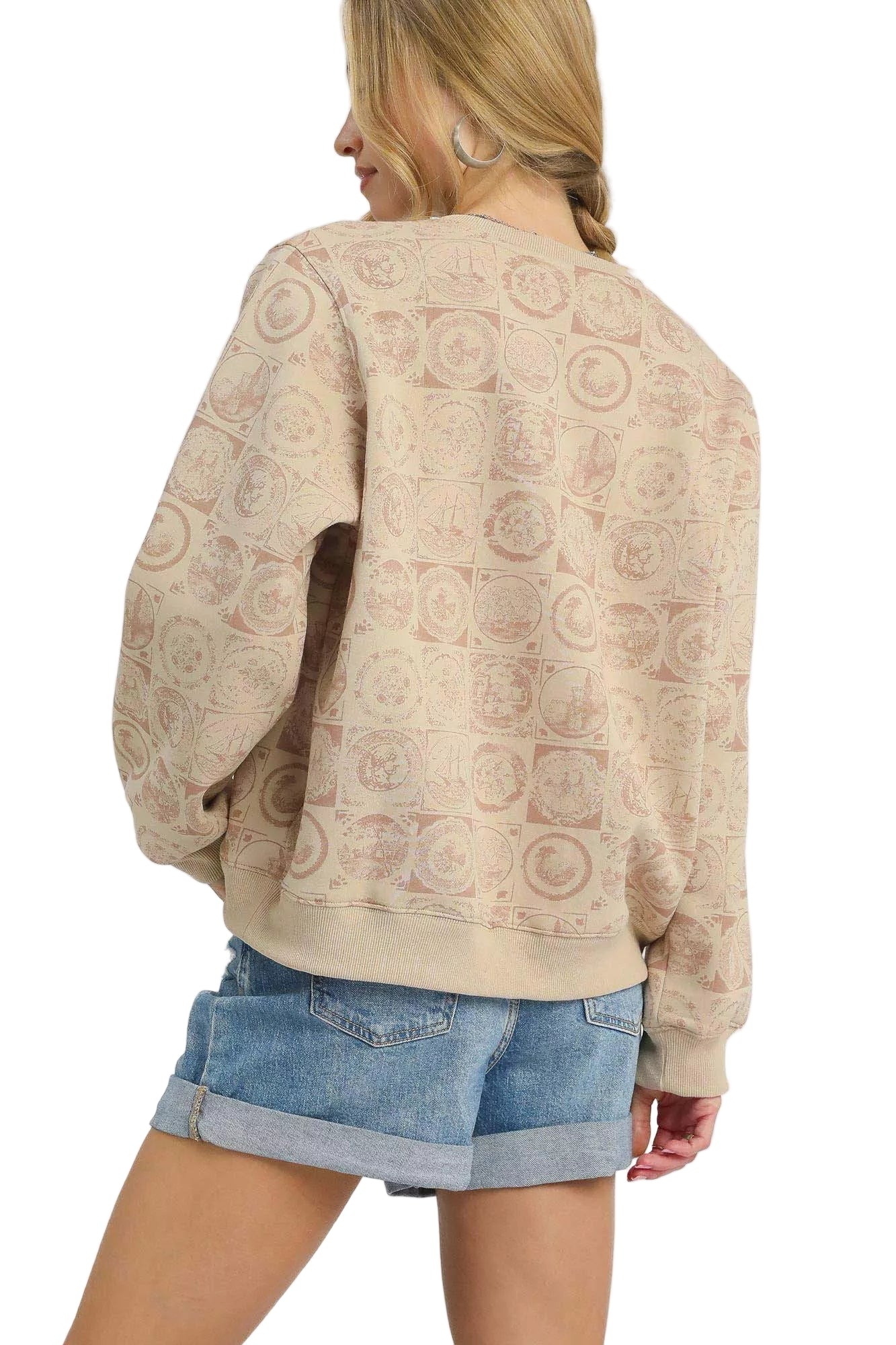 Wrap yourself in the warmth of the Umgee Coin Stamp Print Sweatshirt, a piece that whispers romance with every thread. Its pullover design, adorned with a delicate V-stitch detail, invites you to embrace comfort while exuding effortless elegance.