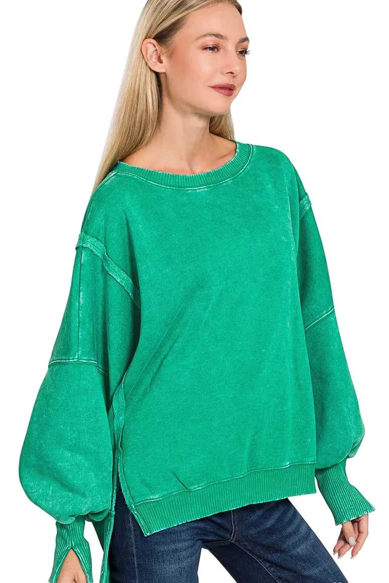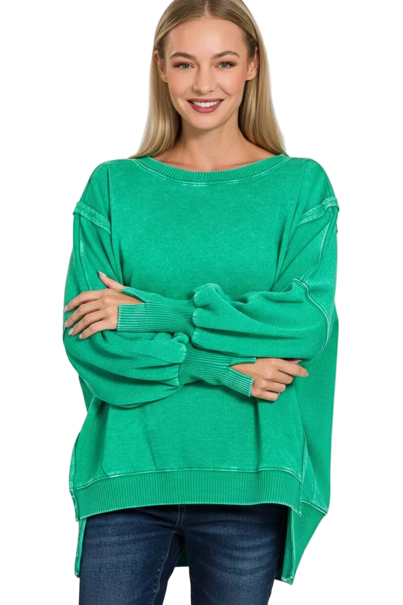Wrap yourself in the tender embrace of the Zenana Acid Washed Batwing Sleeve Fleece Sweatshirt, where comfort meets romance. Its unique acid-washed design whispers of adventure, while the batwing sleeves invite you to dance through chilly evenings with ease.