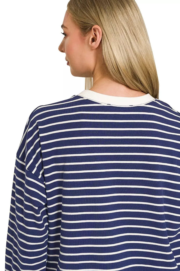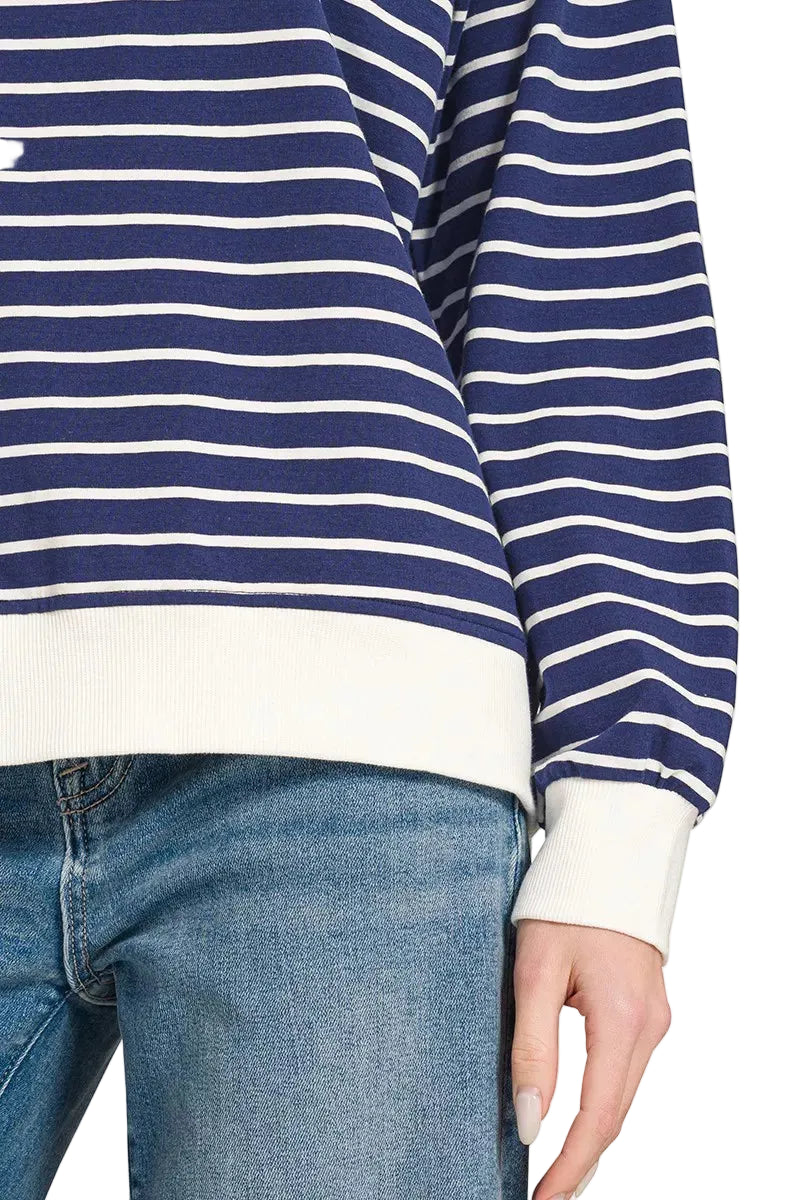 This classic striped sweatshirt is a must-have for any wardrobe. Made from a soft and comfortable blend of cotton and polyester, it features a timeless nautical-inspired design with navy and white stripes. The crew neck and relaxed fit make it easy to wear and perfect for layering. The long sleeves provide extra warmth, while the durable construction ensures long-lasting wear. Ideal for casual outings, weekend getaways, or simply lounging at home, this sweatshirt offers both style and comfort. The ribbed cuffs and hem add a touch of sophistication, making it a versatile piece that can be dressed up or down. Available in a range of sizes to suit every body type.