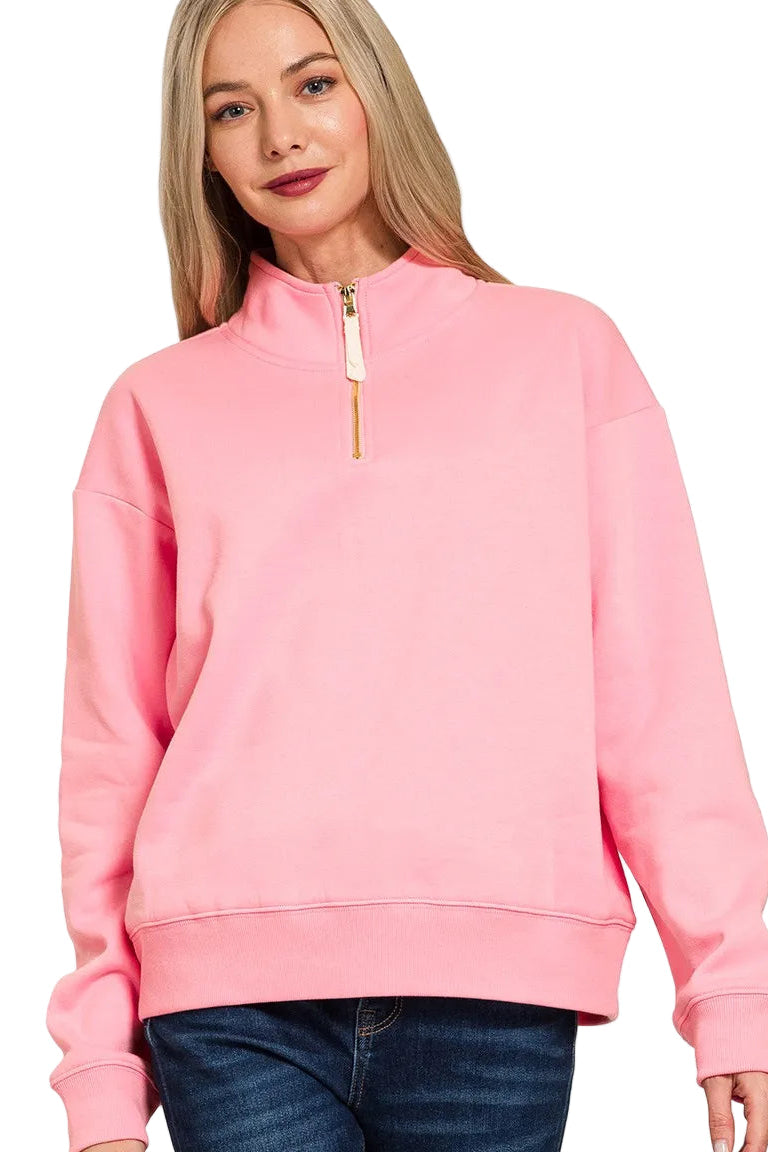 Wrap yourself in the tender embrace of the Zenana Fleece Half Zip Sweatshirt, where comfort meets elegance. This enchanting piece, crafted from soft fleece, whispers warmth against your skin, inviting you to indulge in cozy moments.