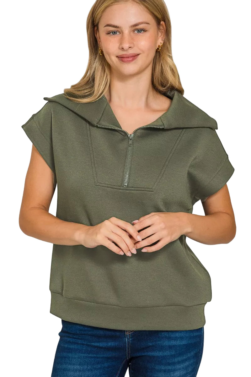The Scuba Half Zip Top is a modern and sporty piece that offers a stylish and versatile addition to your wardrobe. Featuring a half-zip design, this top allows for adjustable coverage and adds a contemporary touch to your outfit. Made from scuba fabric, it provides a structured and sleek look that is comfortable to wear. This top is perfect for casual outings or active days, offering a blend of fashion and functionality. With its trendy design and practical features, the Scuba Half Zip Top is sure to become a favorite go-to option for your everyday styling needs.