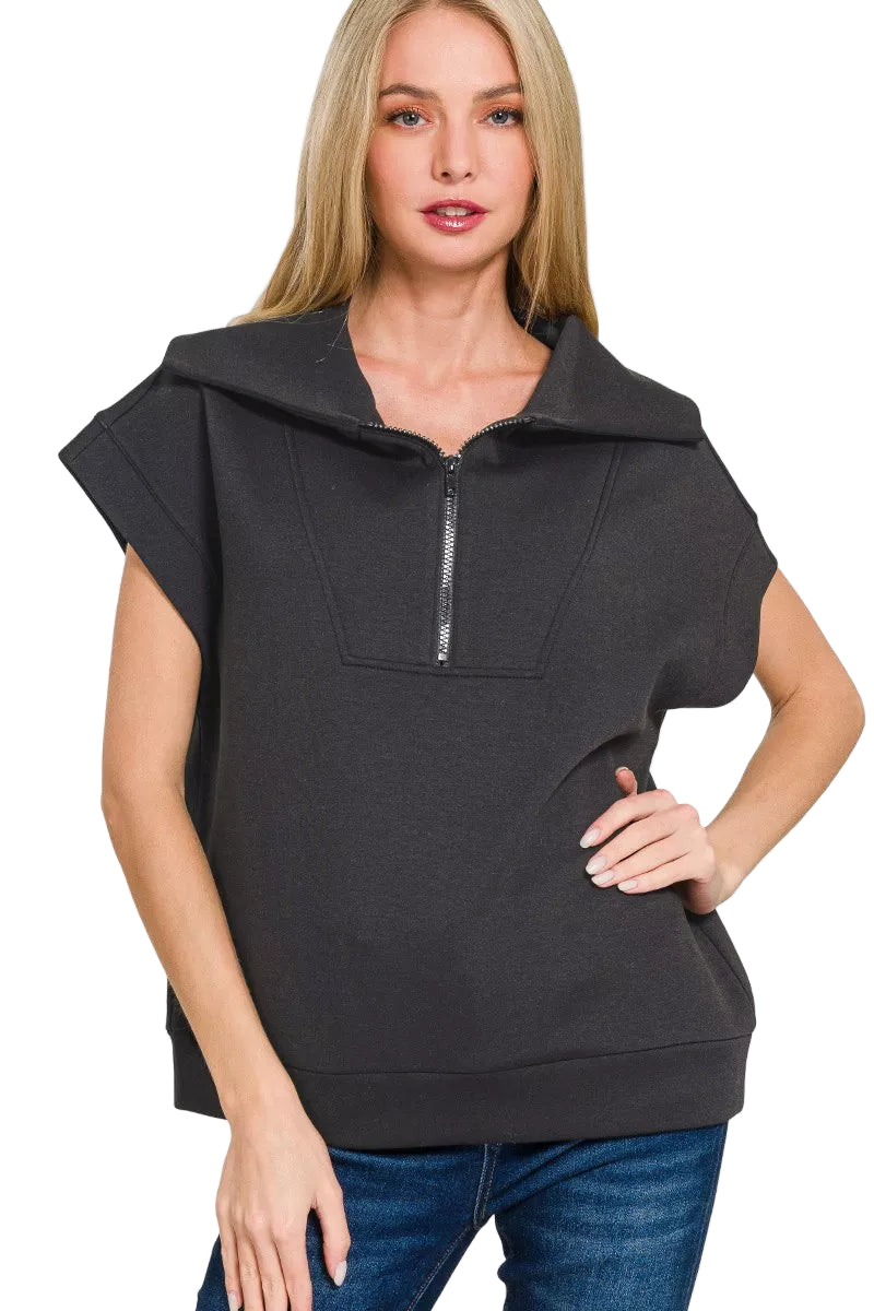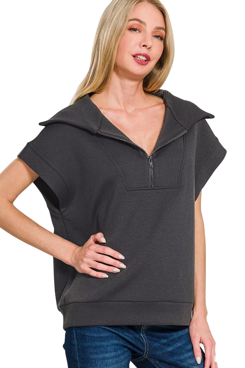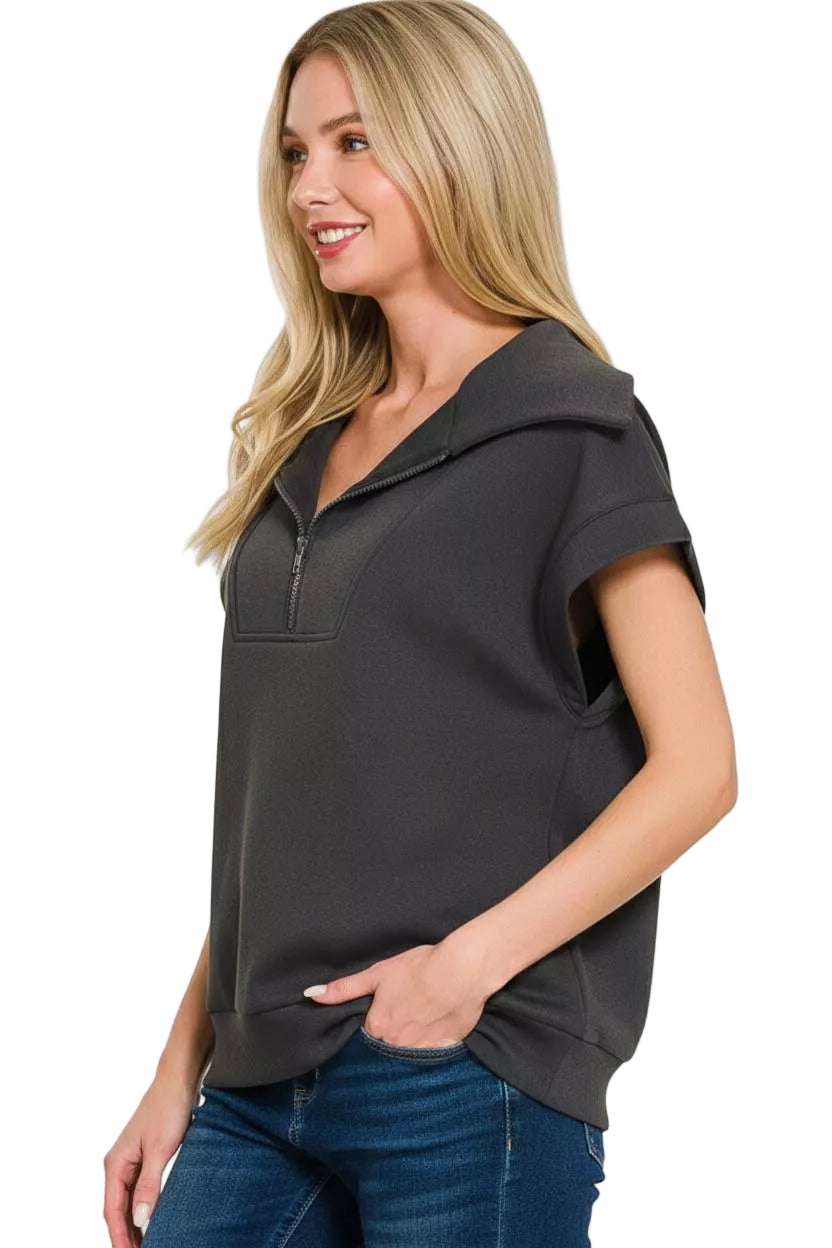 The Scuba Half Zip Top is a modern and sporty piece that offers a stylish and versatile addition to your wardrobe. Featuring a half-zip design, this top allows for adjustable coverage and adds a contemporary touch to your outfit. Made from scuba fabric, it provides a structured and sleek look that is comfortable to wear. This top is perfect for casual outings or active days, offering a blend of fashion and functionality. With its trendy design and practical features, the Scuba Half Zip Top is sure to become a favorite go-to option for your everyday styling needs.