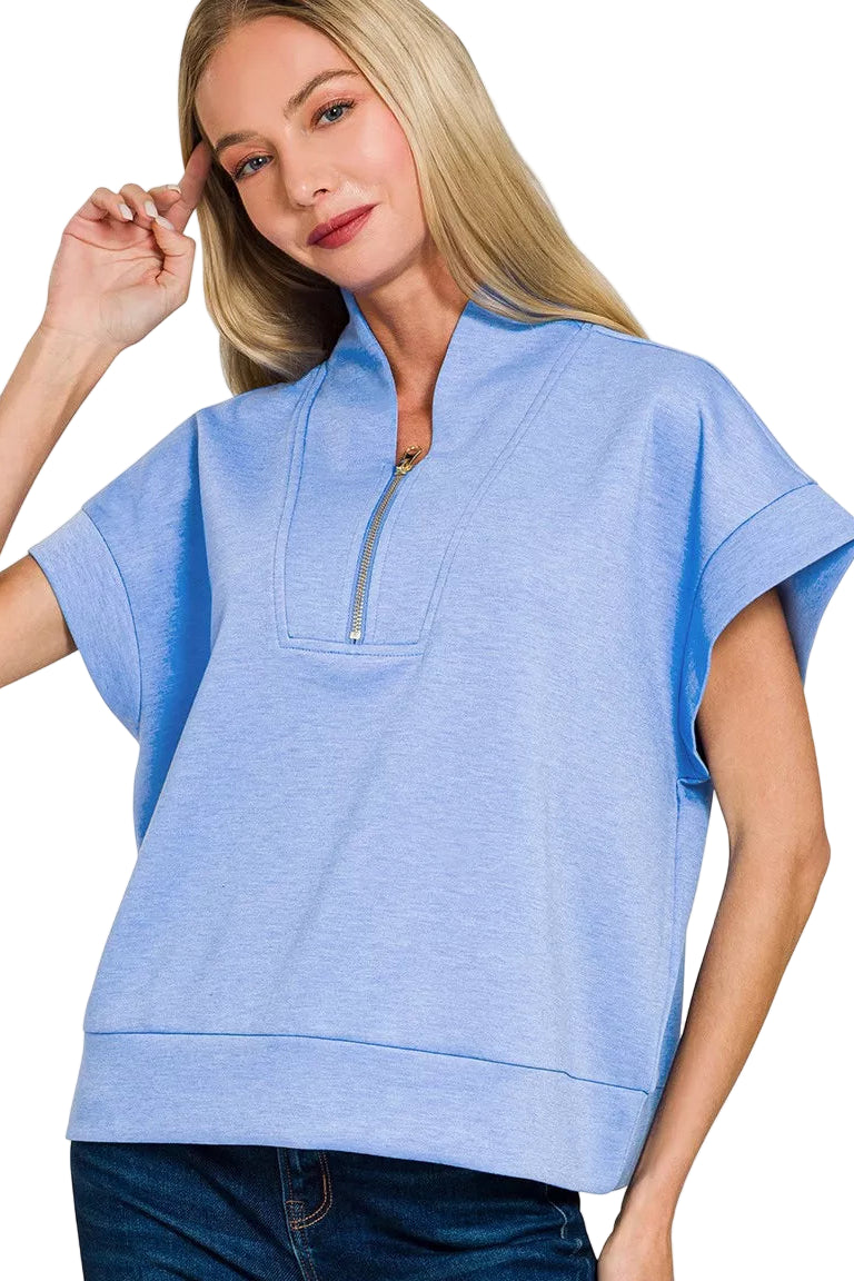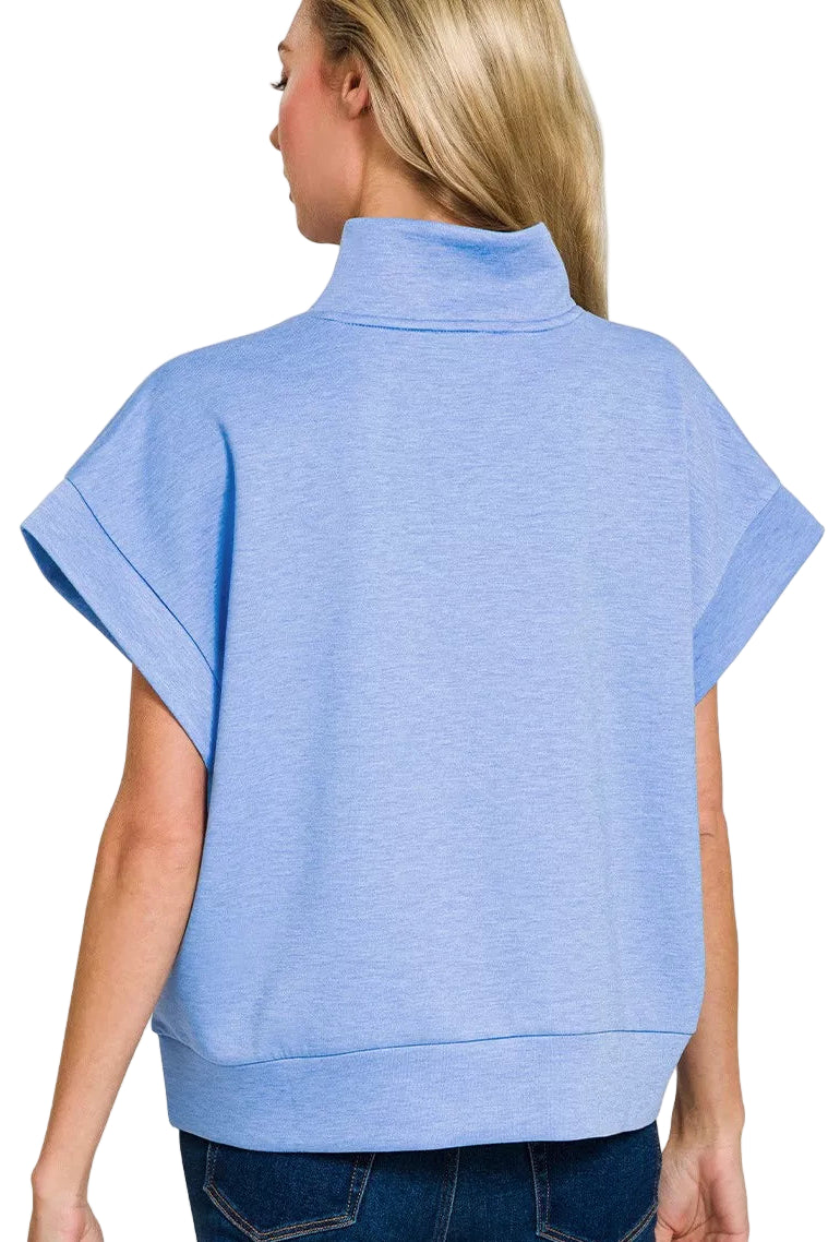The high neck design whispers sophistication, while the half zip closure invites playful adjustments, allowing you to express your unique style. Crafted from luxurious scuba fabric, it drapes beautifully, effortlessly transitioning from a casual stroll to an adventurous outing.