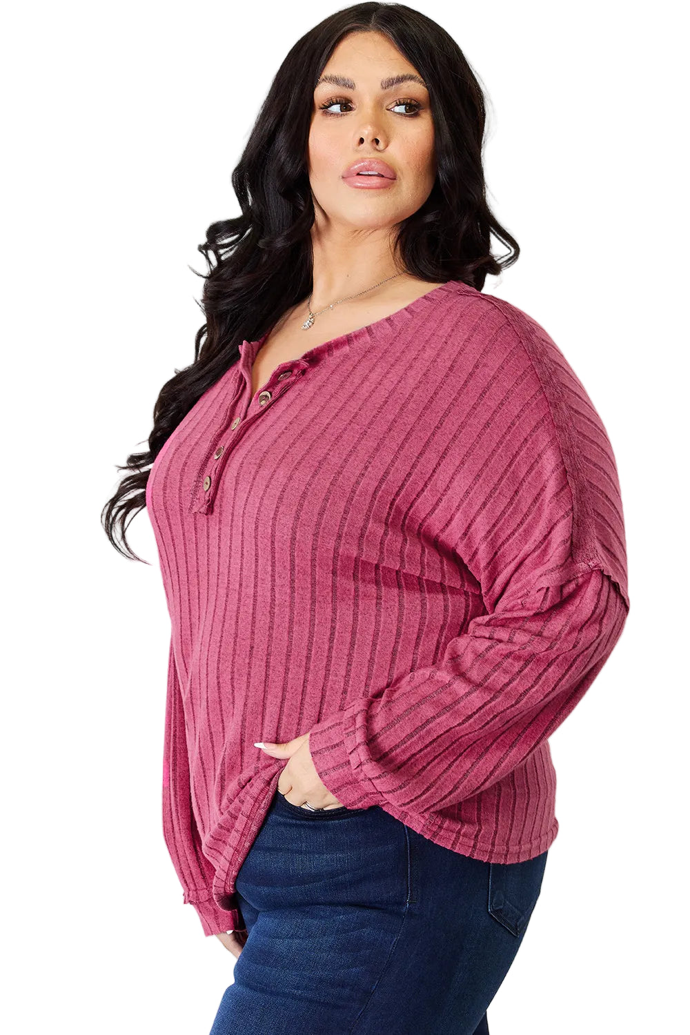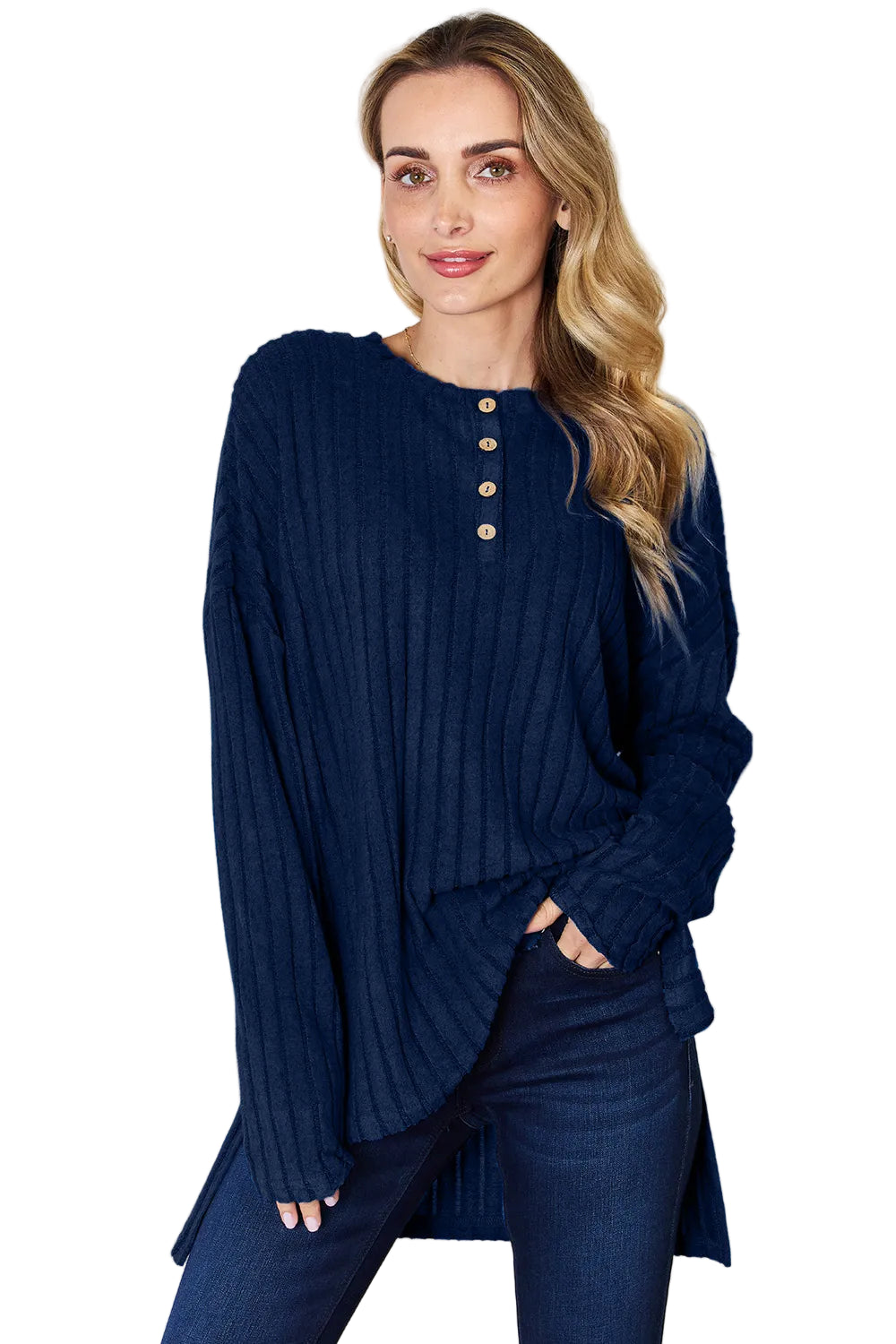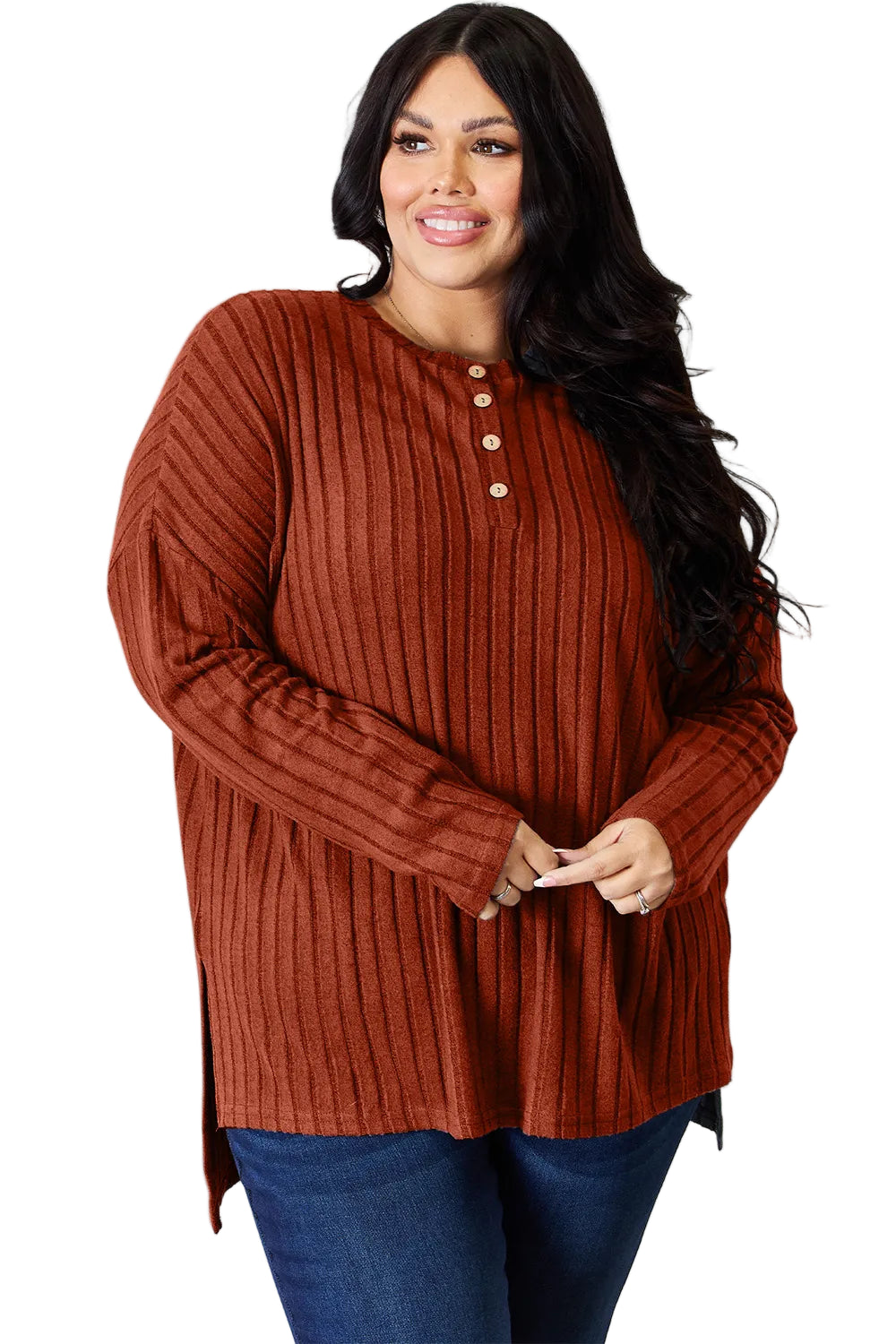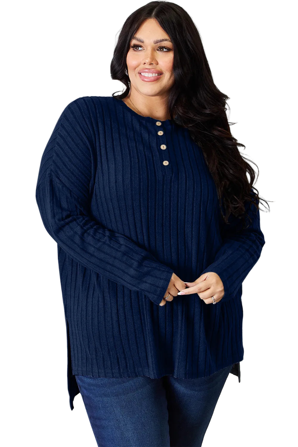 Embrace the allure of effortless elegance with our Basic Bae Full Size Ribbed Half Button Long Sleeve High-Low T-Shirt. This enchanting piece caresses your skin, its slightly stretchy fabric whispering sweet nothings as it drapes gracefully over your curves.