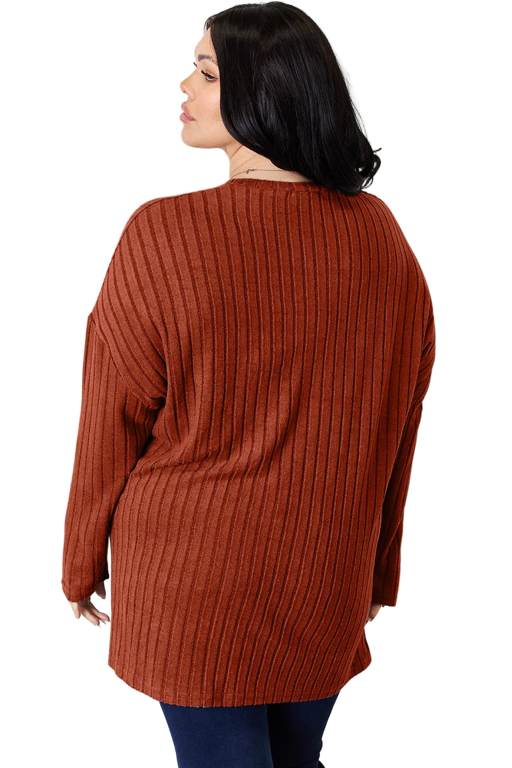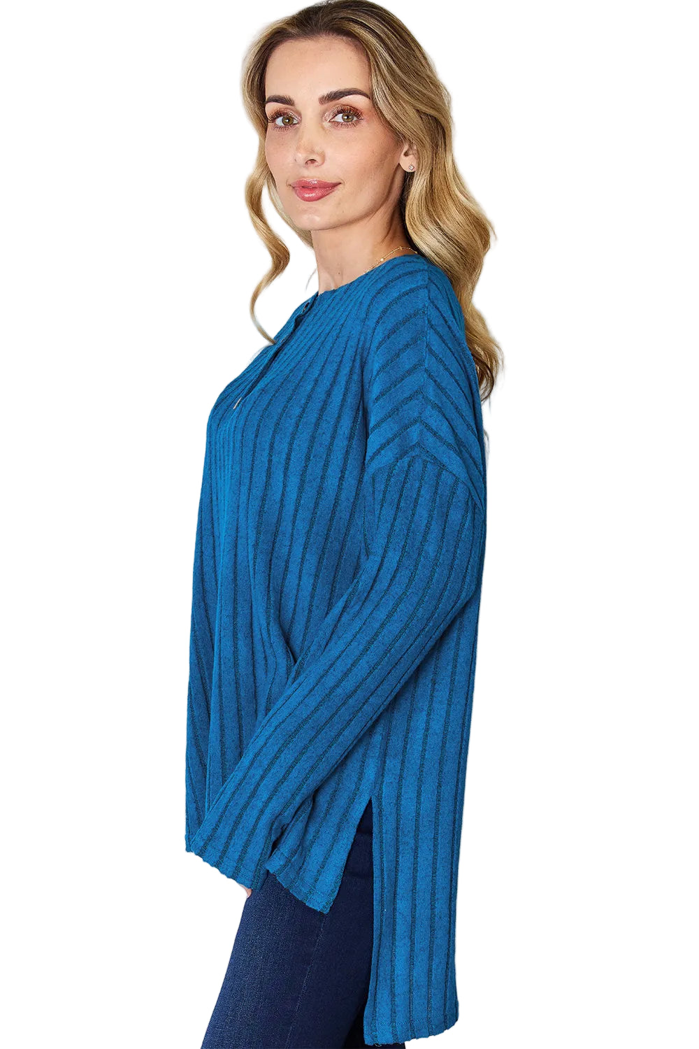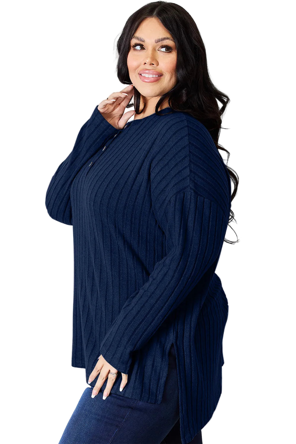 Embrace the allure of effortless elegance with our Basic Bae Full Size Ribbed Half Button Long Sleeve High-Low T-Shirt. This enchanting piece caresses your skin, its slightly stretchy fabric whispering sweet nothings as it drapes gracefully over your curves.