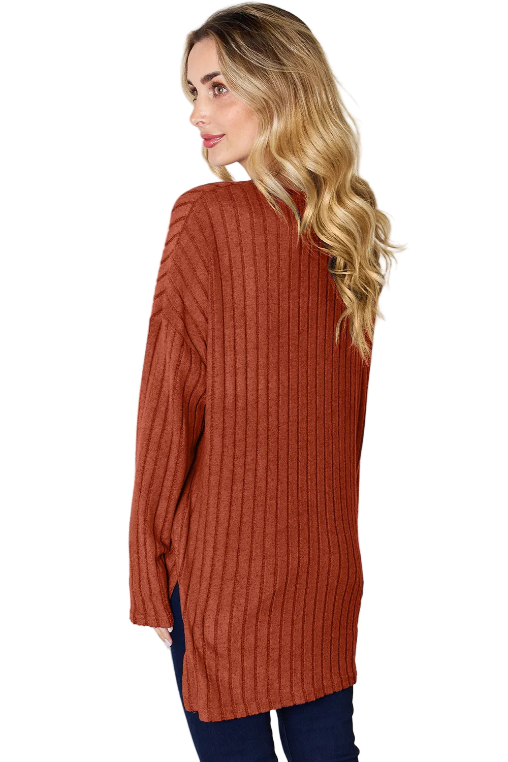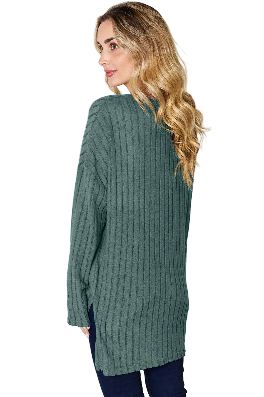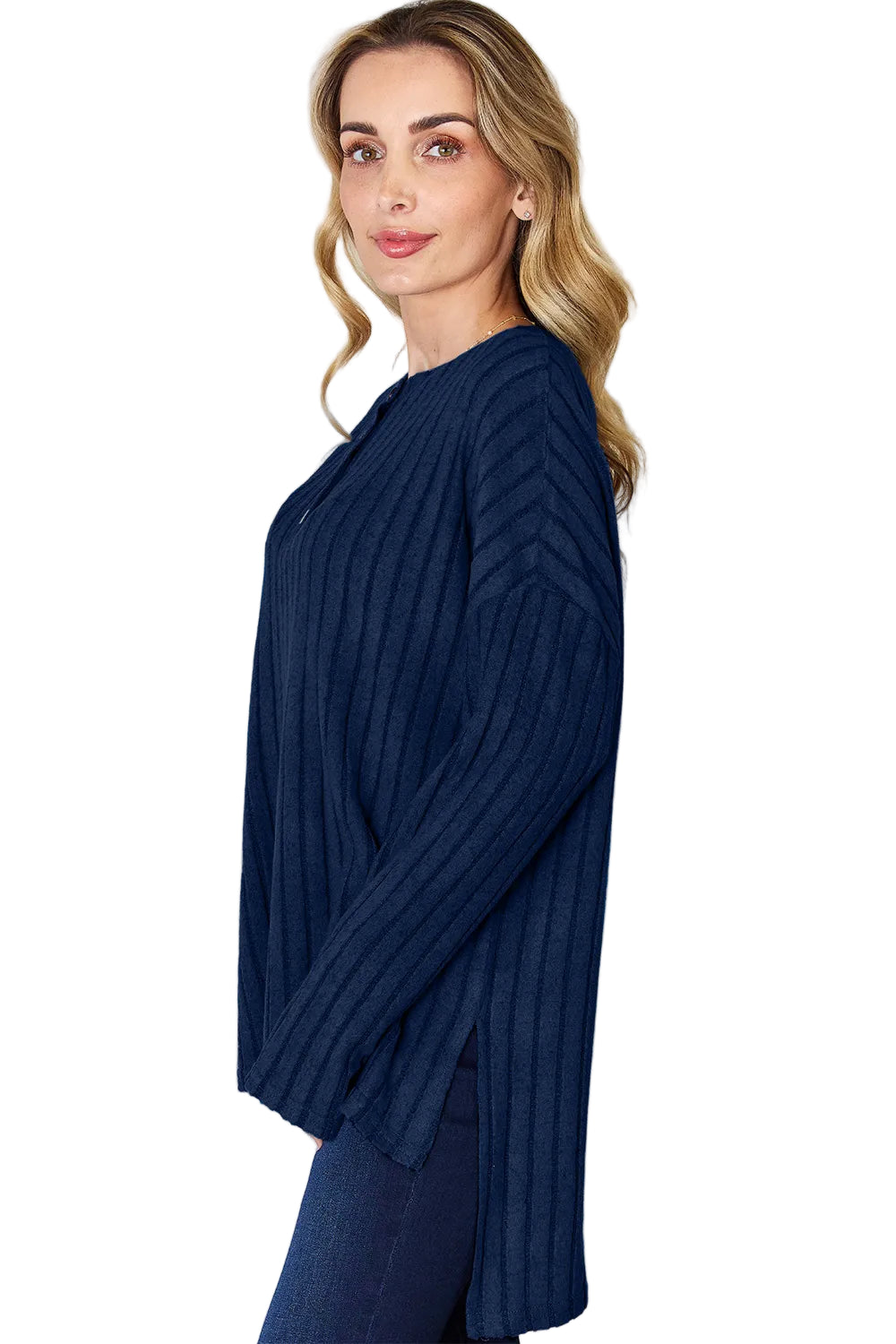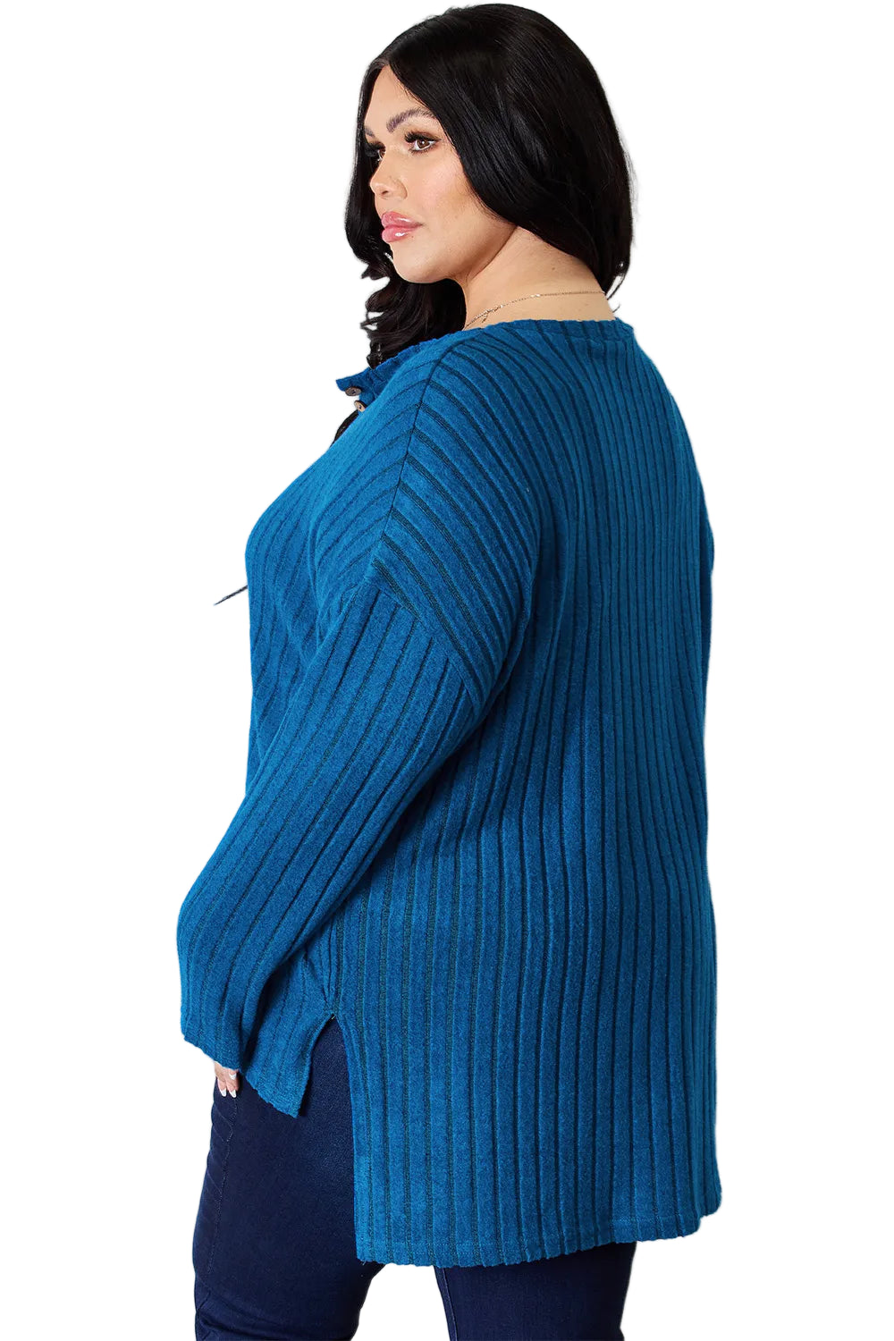 Embrace the allure of effortless elegance with our Basic Bae Full Size Ribbed Half Button Long Sleeve High-Low T-Shirt. This enchanting piece caresses your skin, its slightly stretchy fabric whispering sweet nothings as it drapes gracefully over your curves.