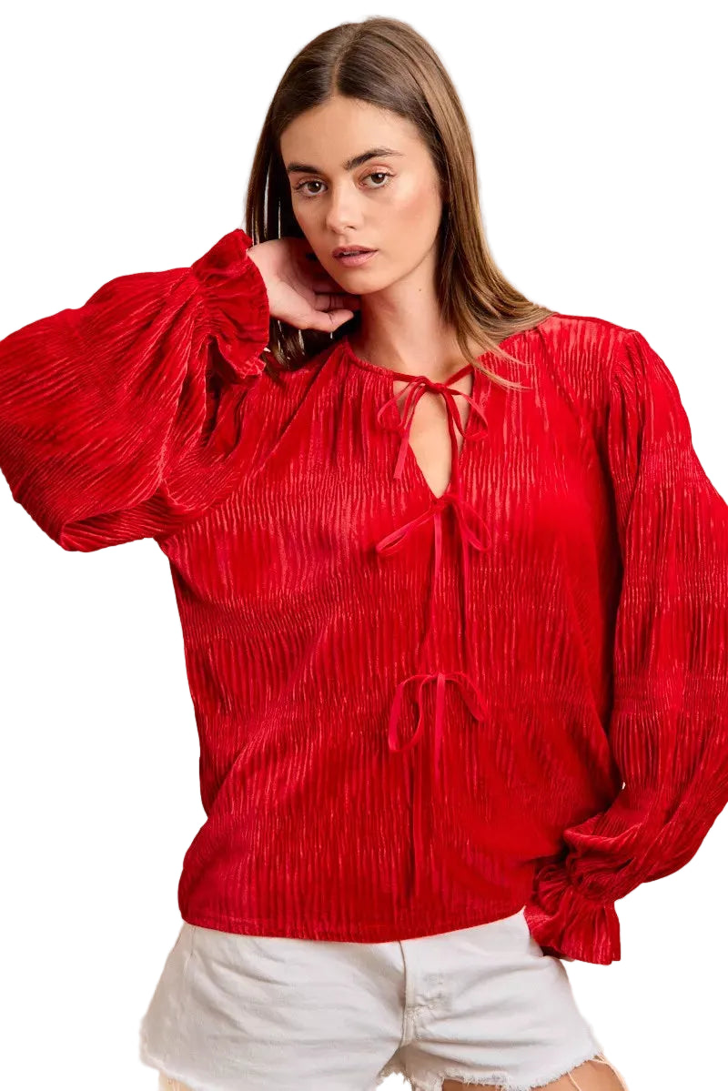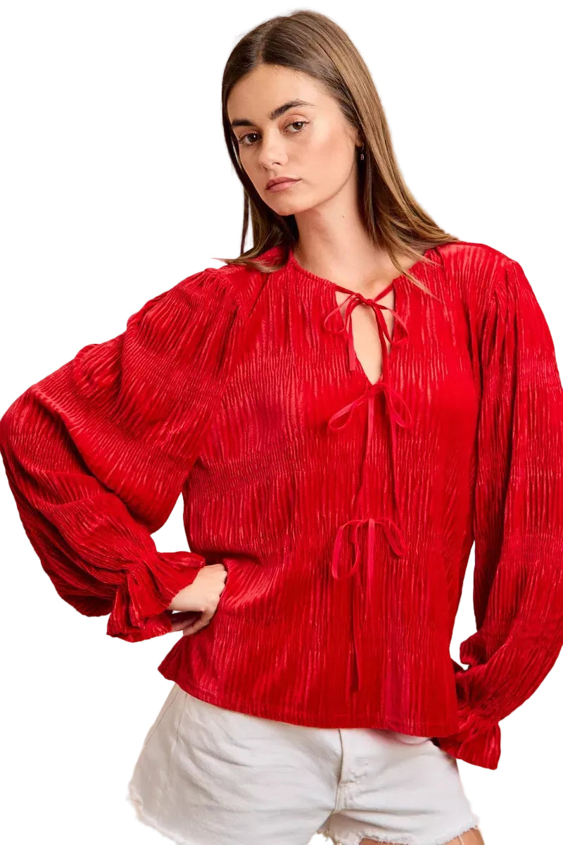 The delicate bow tied at the neck whispers romance, while the unique neck drop design adds a touch of allure. Whether you're twirling under the mistletoe or sipping cocoa by the fire, this top is your ideal companion, radiating festive charm and feminine grace.