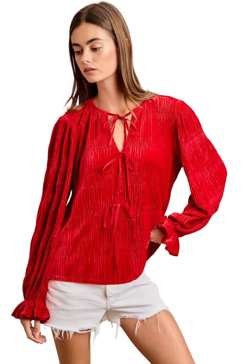 Embrace the magic of the season with the BiBi Christmas Theme Velvet Bow Tied Top With Neck Drop. This enchanting piece, crafted from sumptuous velvet, wraps you in warmth and elegance, perfect for those cozy holiday gatherings.