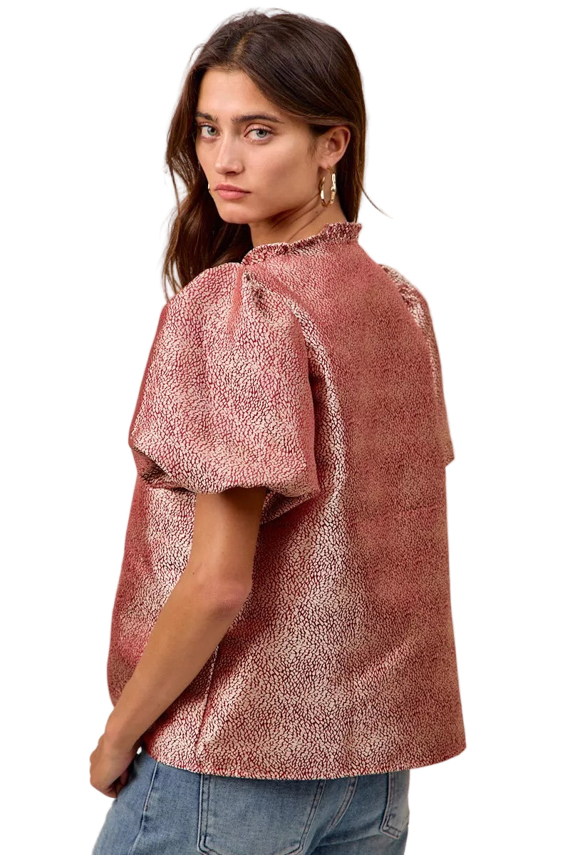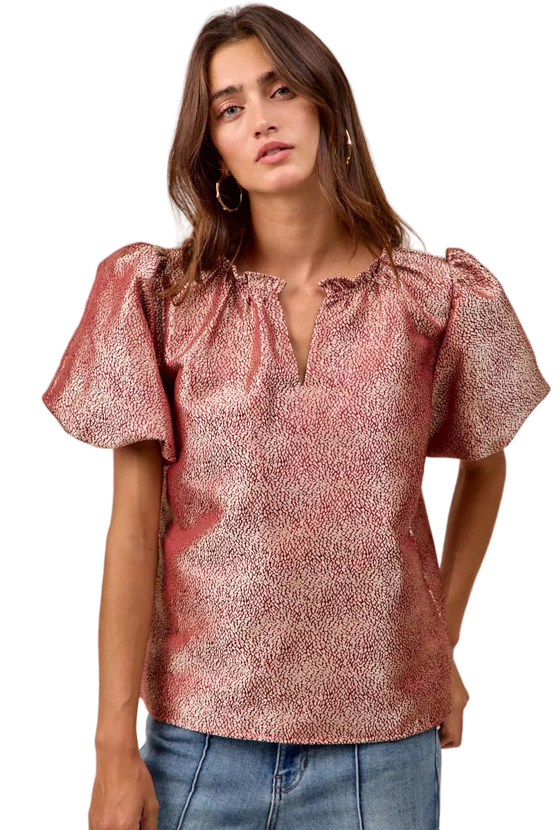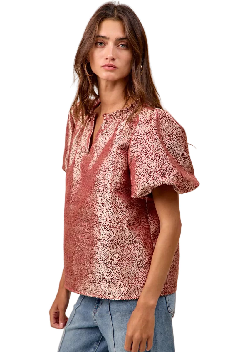 Embrace the allure of romance with the BiBi Jacquard Woven Short Balloon Sleeves V Neck Top. This exquisite piece caresses your silhouette, whispering elegance with every movement. The jacquard woven fabric, rich in texture, invites admiration and elevates your style effortlessly.