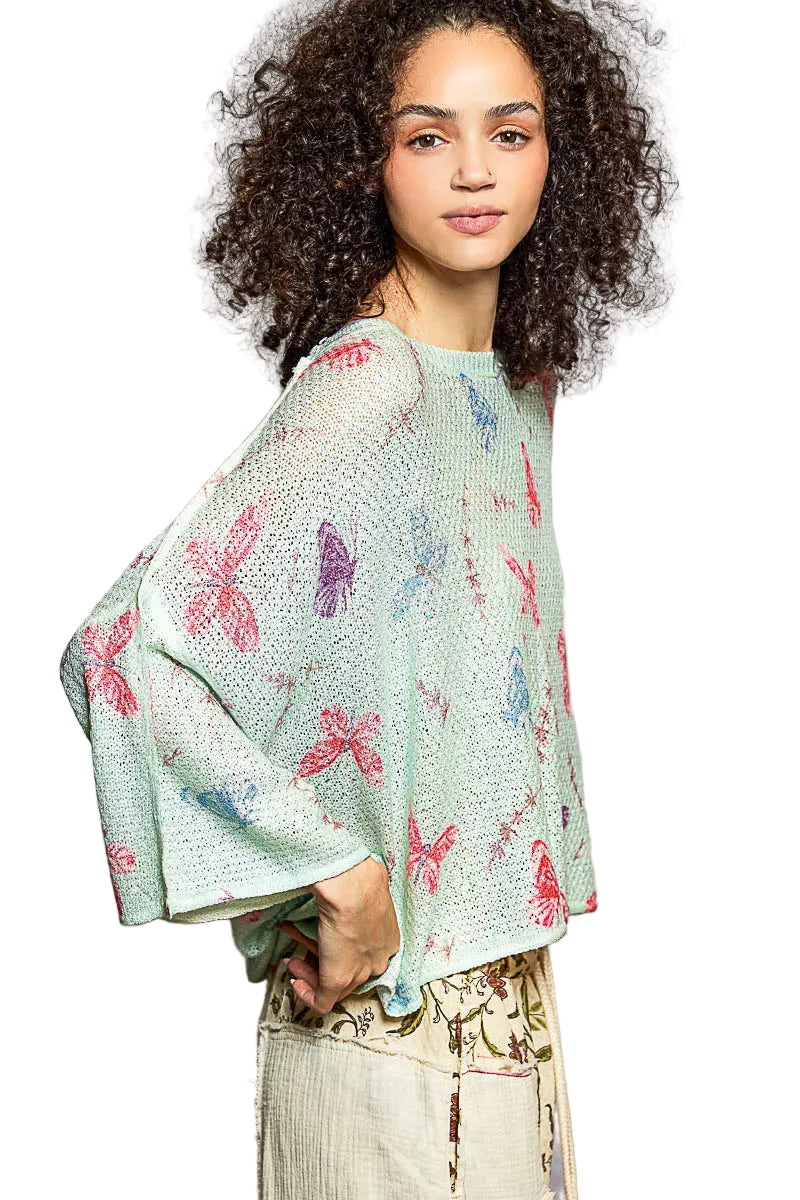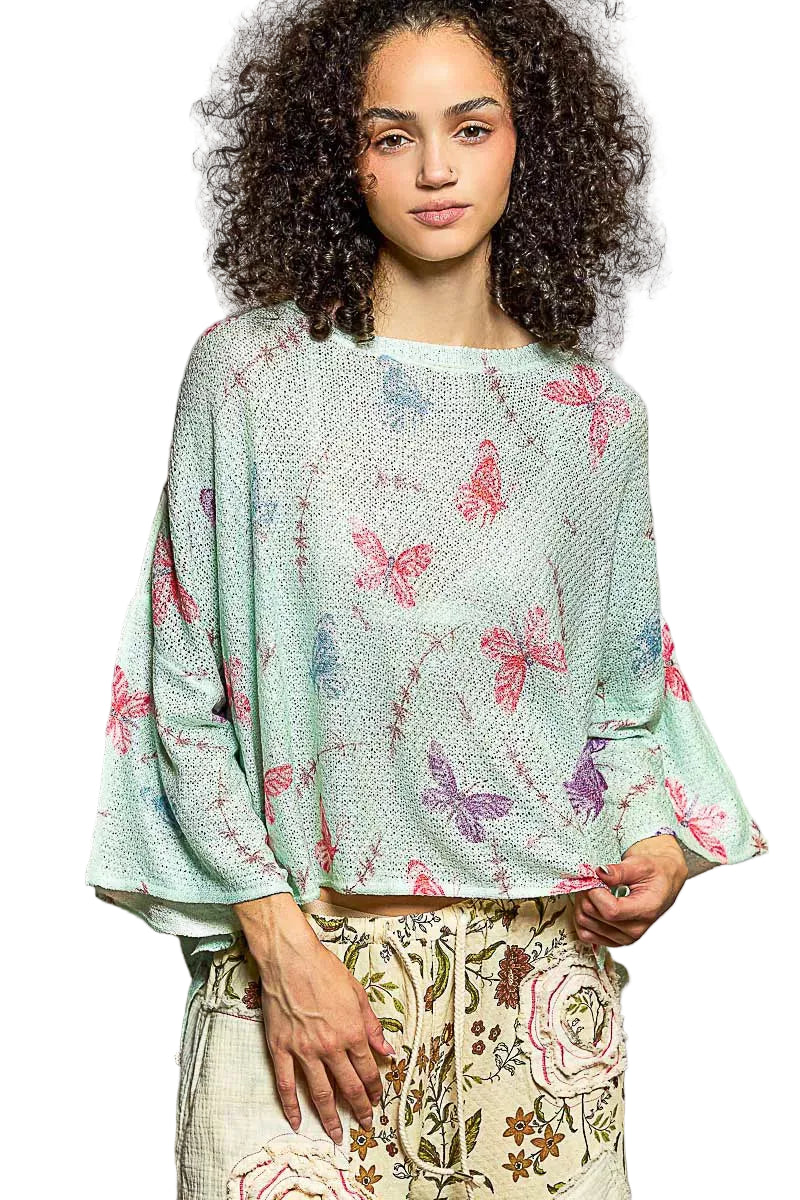 This round neck half sleeve relaxed fit thin sweater top is designed with a beautiful butterfly print for a whimsical and charming touch. The outseam rolling edge adds a unique and casual flair to the sweater, giving it a laid-back vibe. The rib neck band detail provides a polished finish and adds a touch of structure to the design. Made from acrylic, this sweater top is lightweight and perfect for layering. Elevate your look with this stylish and comfortable sweater top featuring a delightful butterfly print and thoughtful design details.