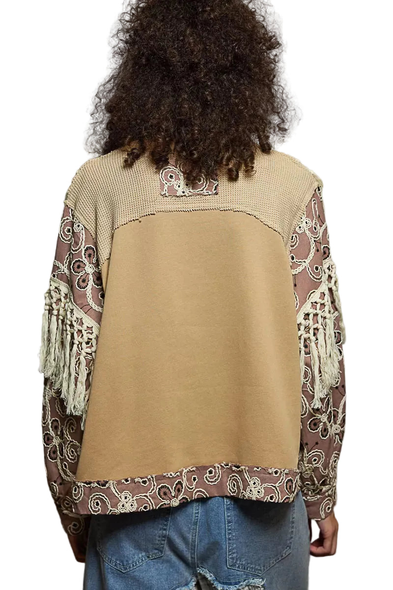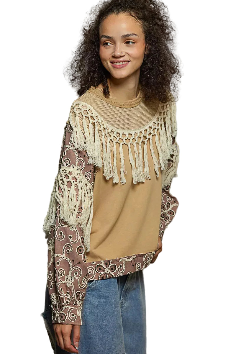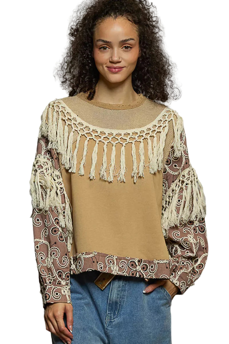 This top is designed with a round neck and balloon sleeves for a trendy and relaxed style. The oversized fit adds a chic and cozy element to the garment. Featuring French terry fabric with embroidery contrast, this top combines comfort with a touch of sophistication. The tassel trim adds a fun and unique detail to the design. Elevate your casual look with this fashionable and eye-catching top!