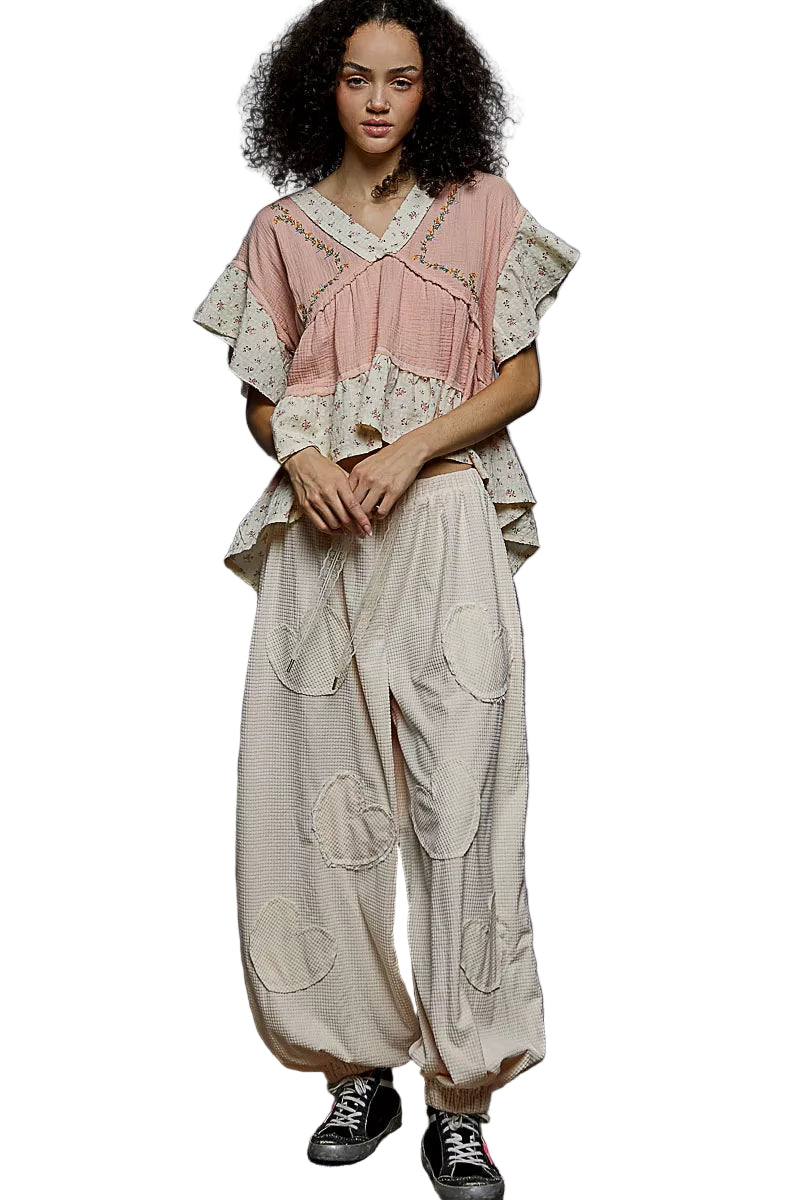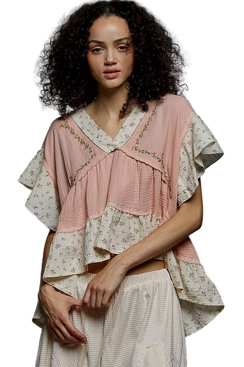 Whisper sweet nothings to your wardrobe with the POL Floral V-Neck Blouse, a delicate embrace of double gauze fabric. Its ruffled sleeves dance gracefully, while the enchanting embroidery weaves a tale of romance and elegance.