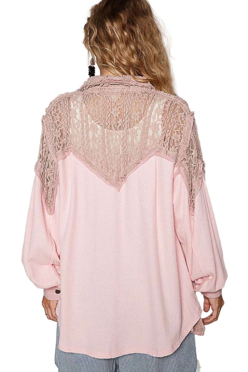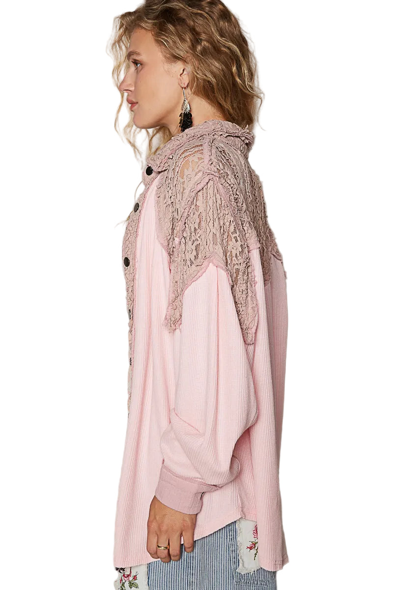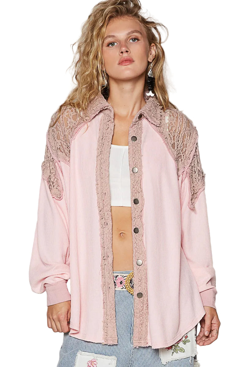 Wrap yourself in the delicate embrace of our Lace Patchwork Button Up Shacket, a piece that whispers romance with every stitch. The soft pink hue dances gracefully against the intricate lace trim, creating a visual symphony that enchants the heart.