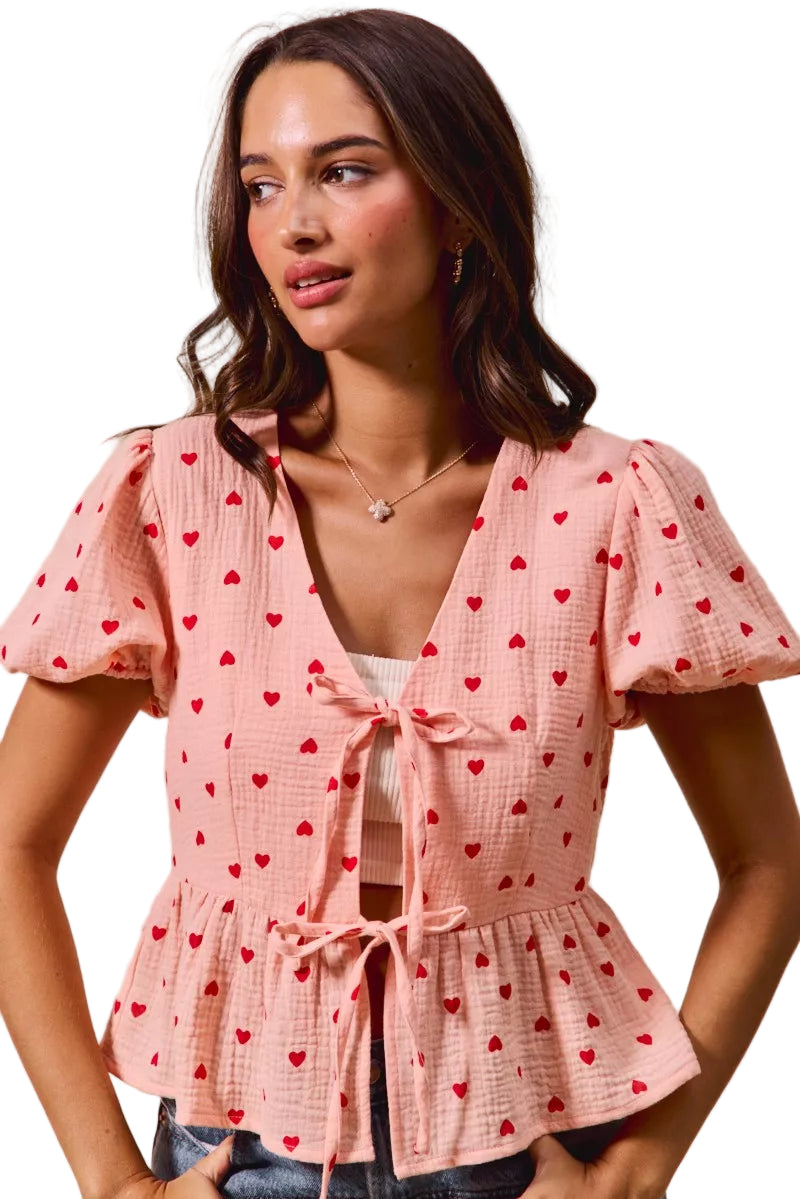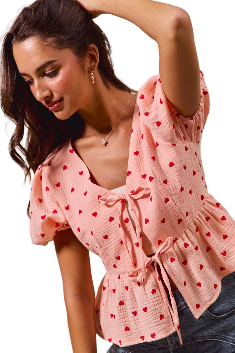 Whisper sweet nothings in the enchanting SO ME All Over Heart Ribbon Tie Baby Doll Valentine Blouse. This delightful top, adorned with a playful heart print, captures the essence of romance, making it a perfect companion for your Valentine’s Day celebrations.
