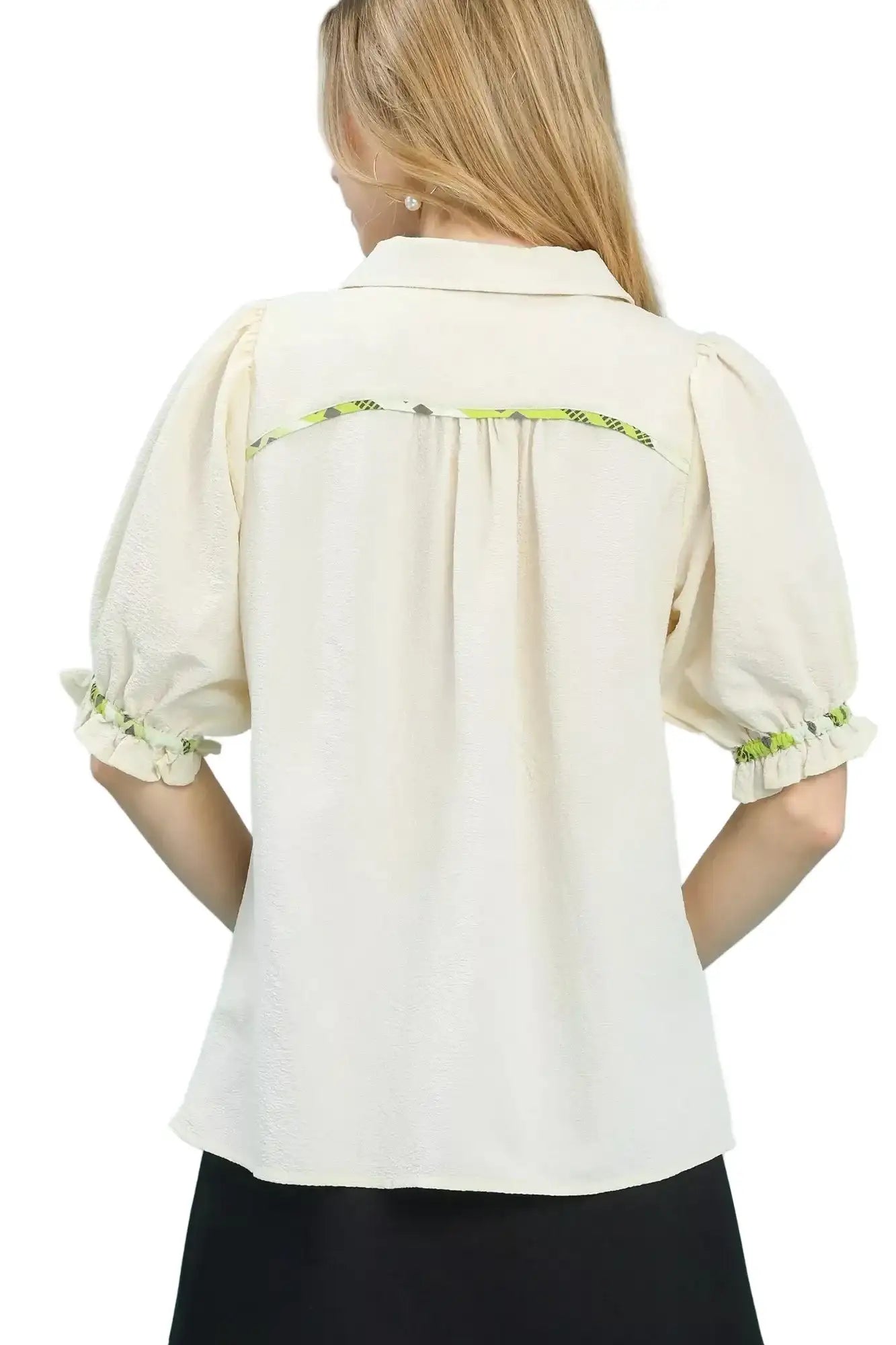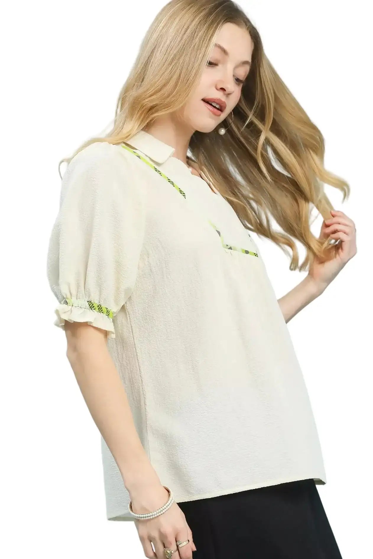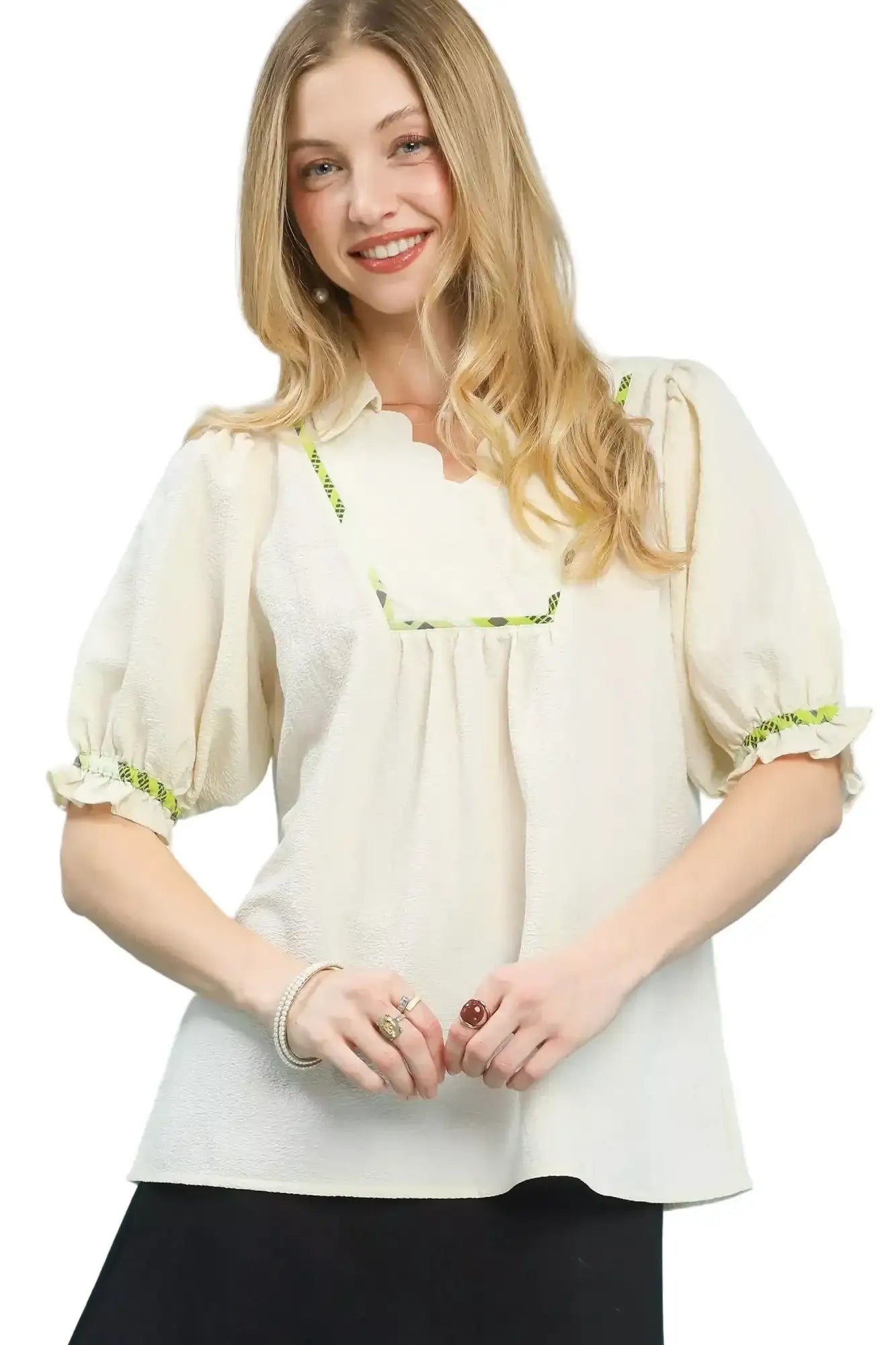 Embrace the essence of romance with the Umgee Scalloped Trim Blouse, a piece that whispers elegance. Its delicate scalloped neckline caresses the skin, inviting admiration with every glance. The enchanting puff sleeves add a touch of whimsy, making you feel like you’ve stepped into a fairytale.