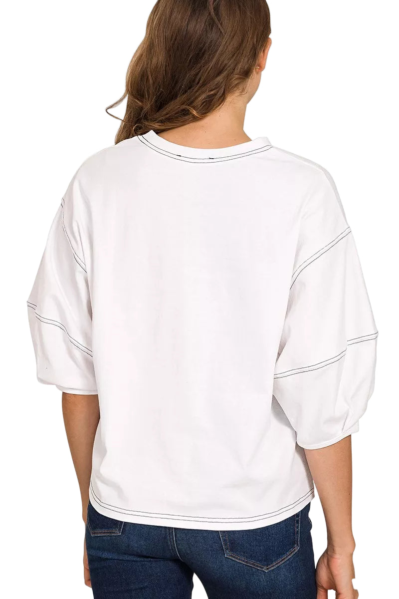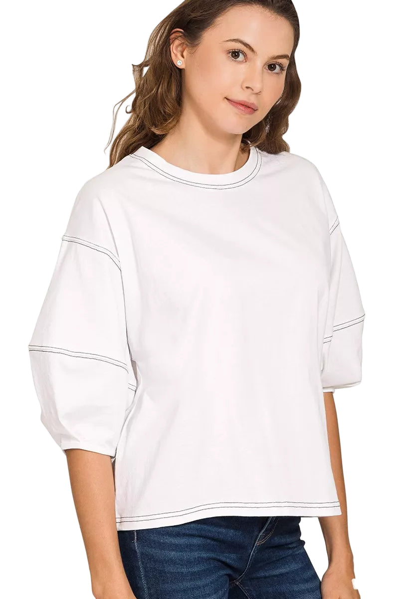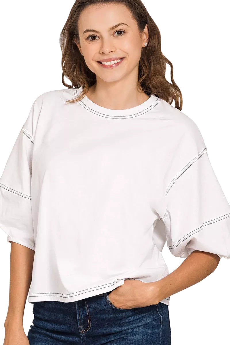 Embrace the allure of romance with the Zenana Balloon Sleeve Top, a piece that whispers elegance and charm. Its contrasting stitching dances playfully against the soft cotton fabric, creating a visual symphony that captivates the heart.