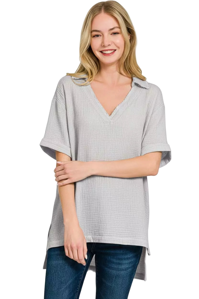 Embrace the essence of romance with the Zenana Double Gauze Short Sleeve High-Low Top. Crafted from the softest 100% cotton, this enchanting piece caresses your skin like a gentle summer breeze, inviting you to revel in its comfort.