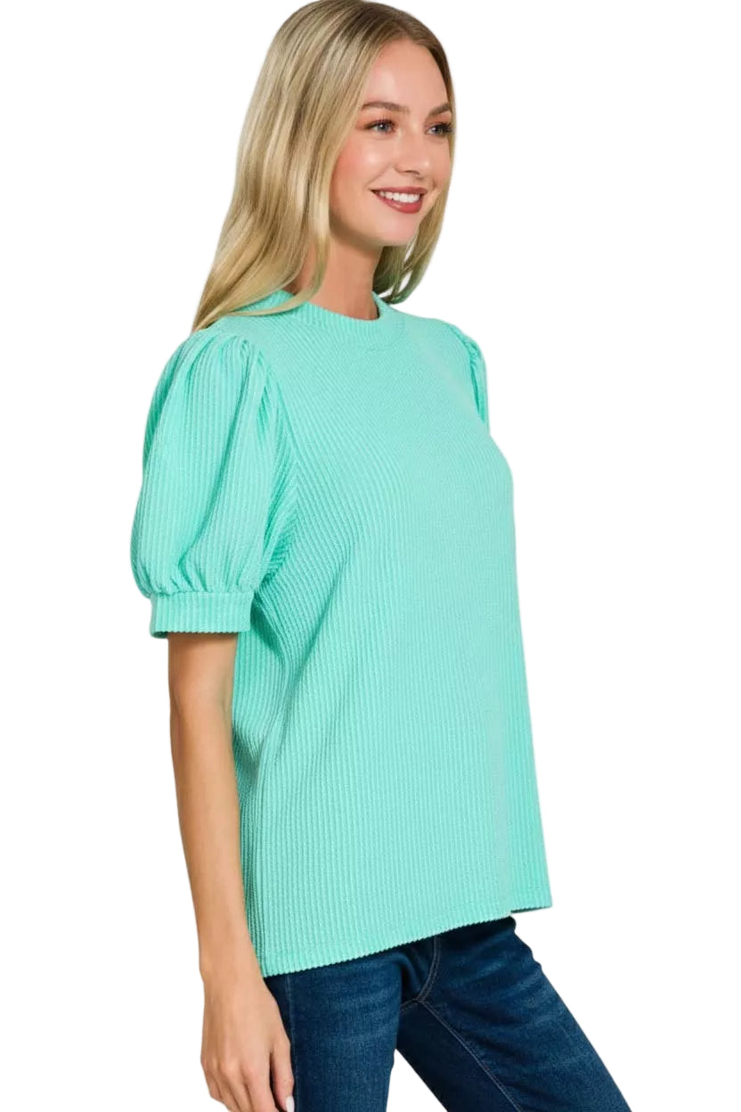 Embrace the allure of romance with the Zenana Raised Rib Puff Sleeve Top, a piece that whispers elegance and charm. Its raised rib design caresses the skin, adding a touch of texture that captivates the senses.