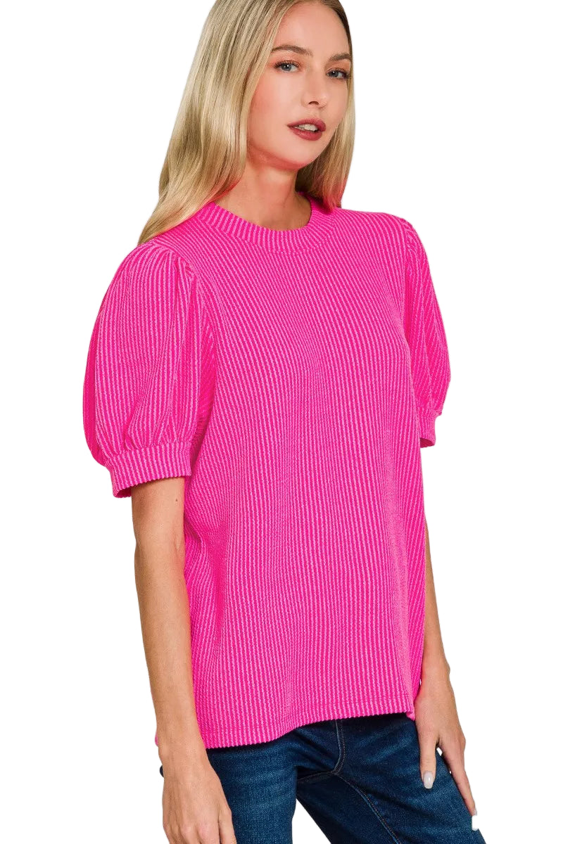 Embrace the allure of elegance with the Zenana Raised Rib Puff Sleeve Top, a piece that whispers romance in every stitch. The raised rib design caresses your skin, adding a touch of texture that captivates the senses.