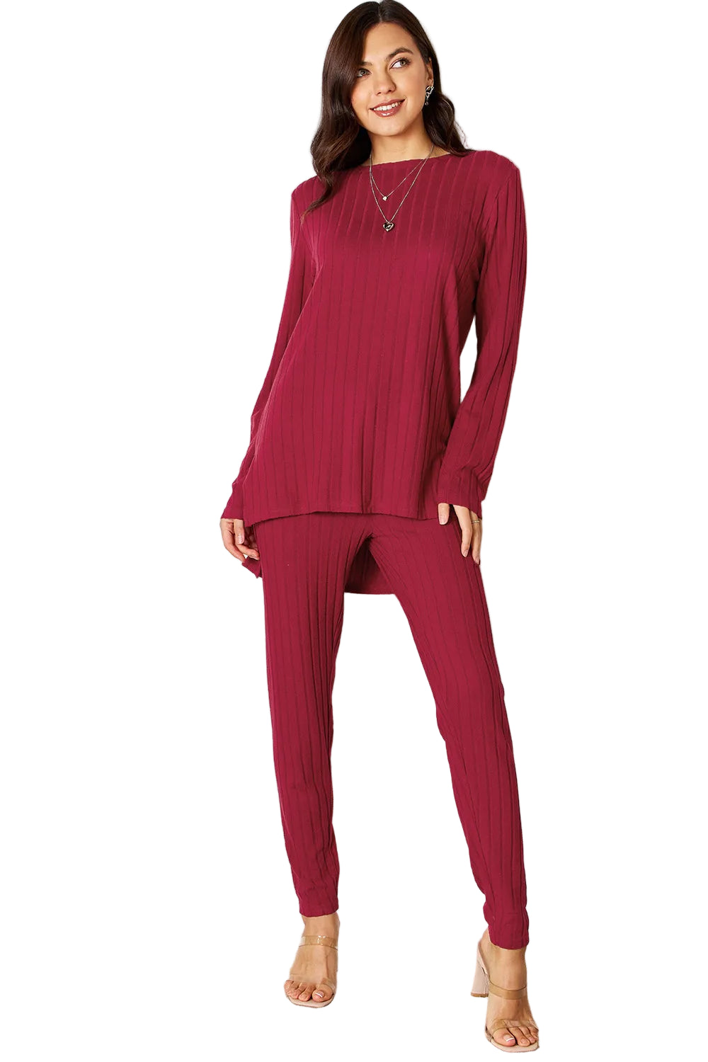 Embrace the allure of romance with our Full Size Ribbed Round Neck High-Low Slit Top and Pants Set. This enchanting two-piece ensemble caresses your curves, featuring a delicate ribbed texture that whispers elegance. The high-low design adds a playful twist, inviting admiration from every angle.