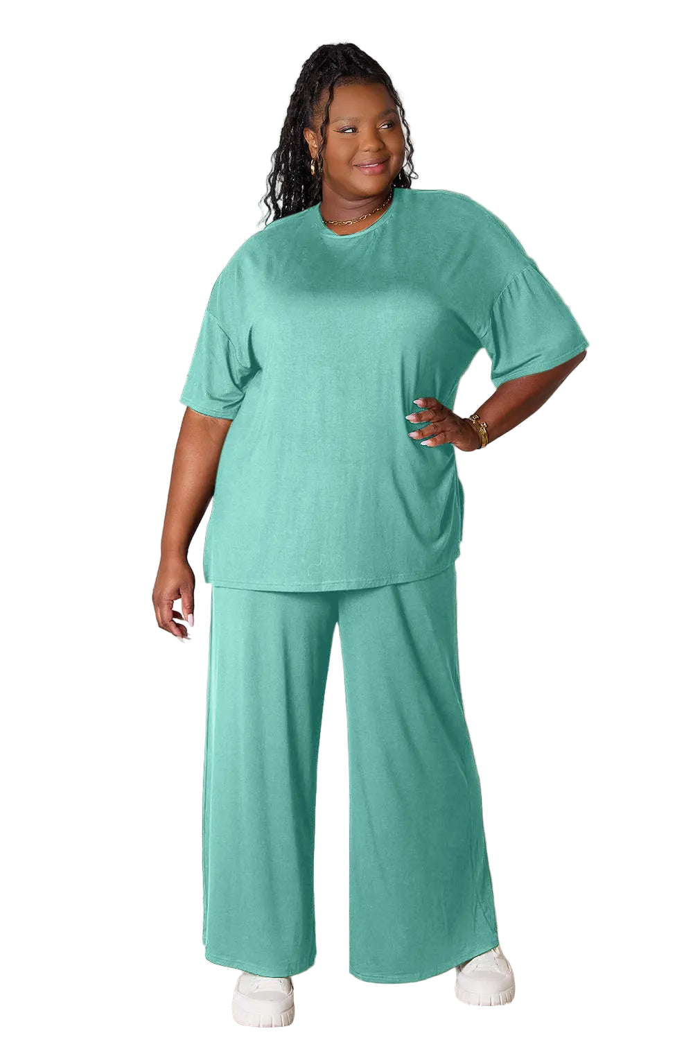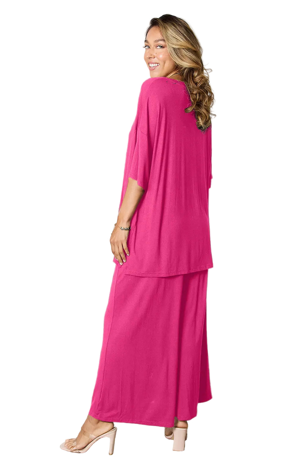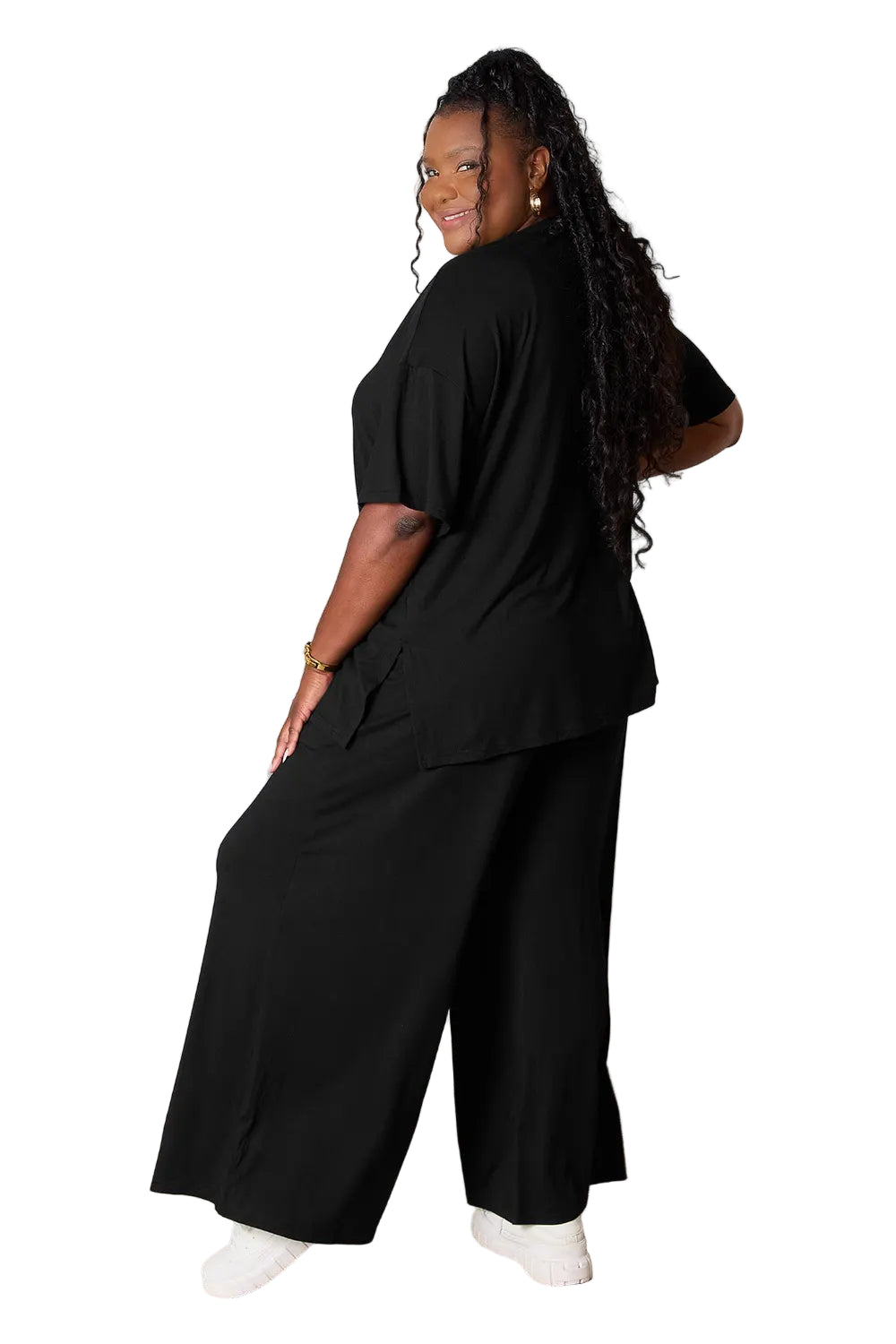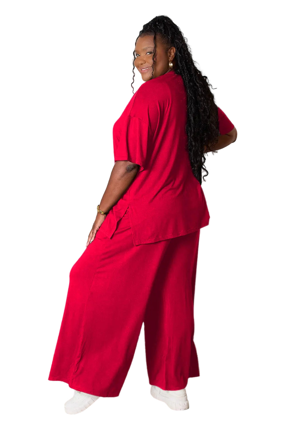 Embrace the allure of romance with the Double Take Full Size Round Neck Slit Top and Pants Set. This enchanting two-piece ensemble caresses your curves, crafted from a soft blend of 95% rayon and 5% spandex, offering a slight stretch that moves with you.