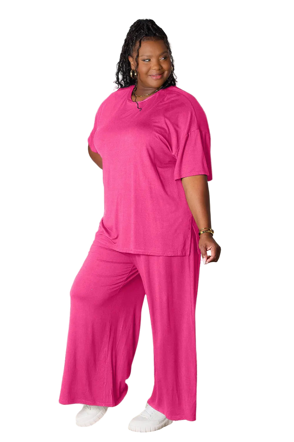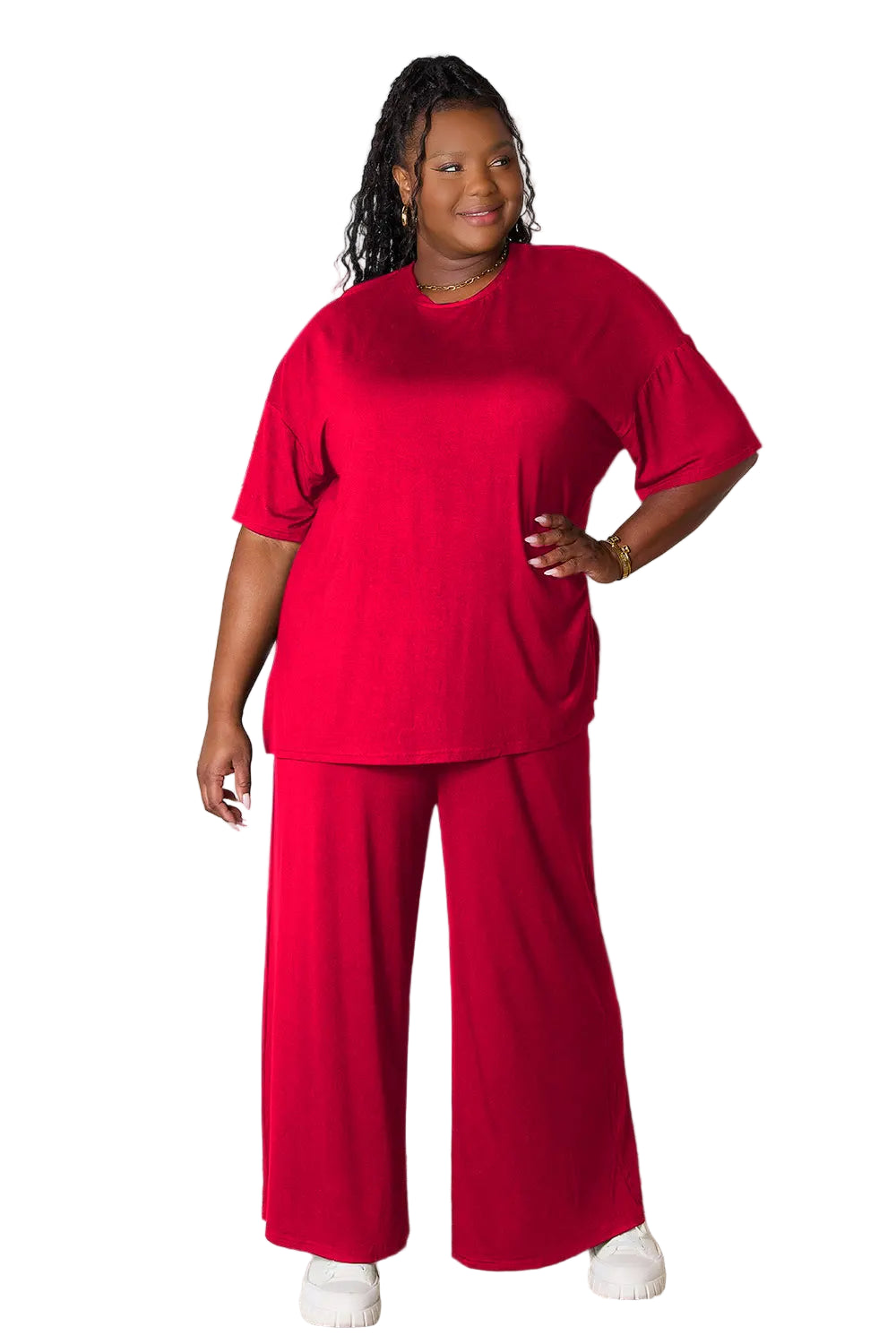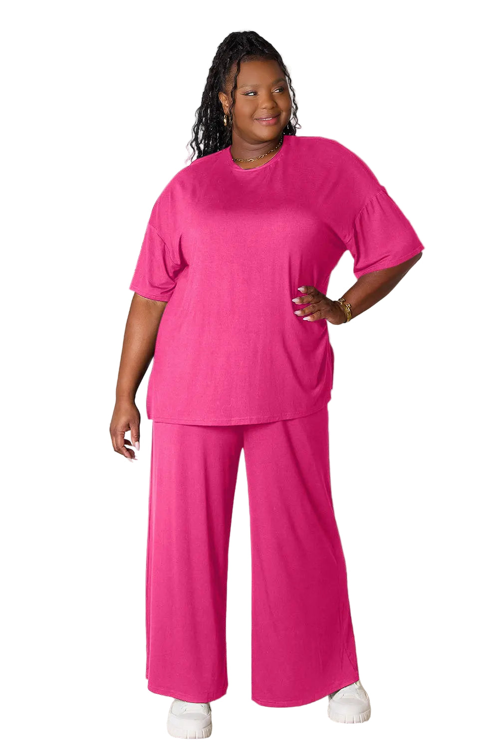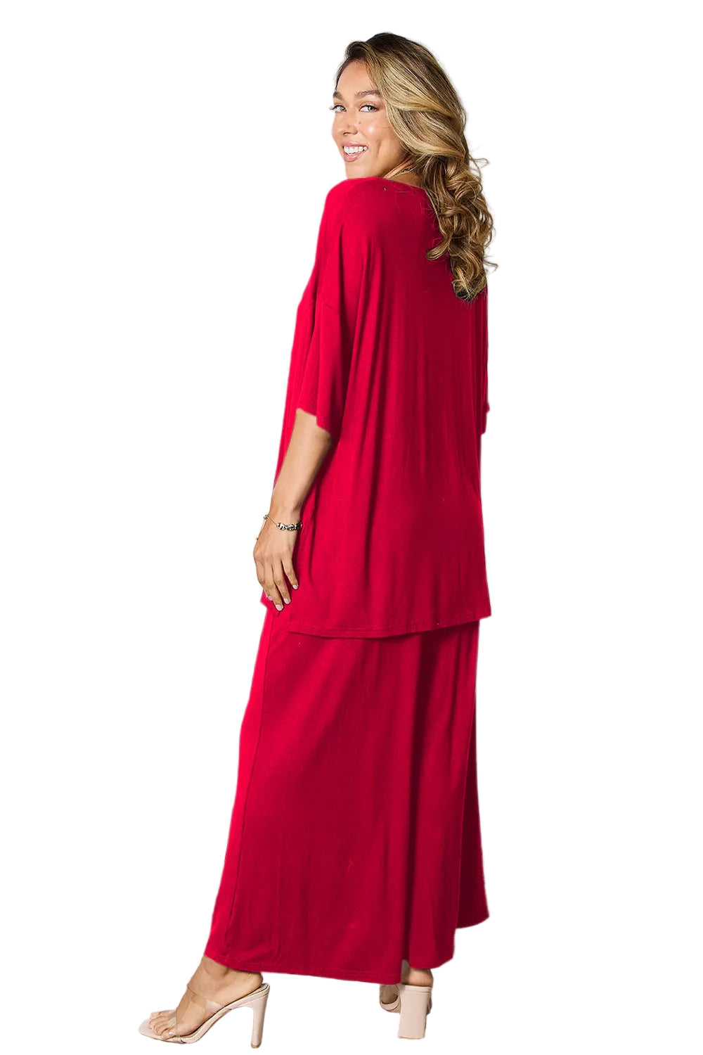 Embrace the allure of romance with the Double Take Full Size Round Neck Slit Top and Pants Set. This enchanting two-piece ensemble caresses your curves, crafted from a soft blend of 95% rayon and 5% spandex, offering a slight stretch that moves with you.
